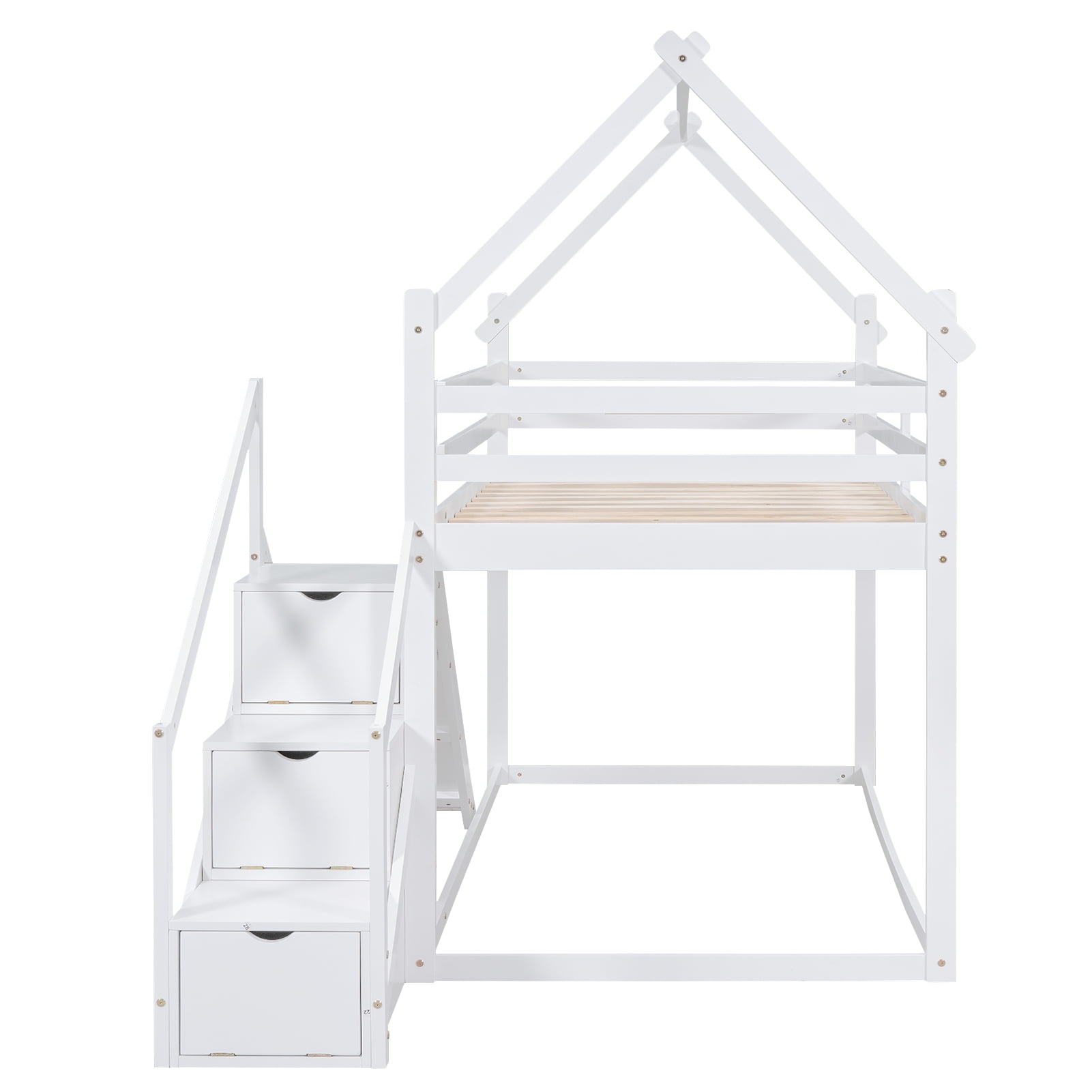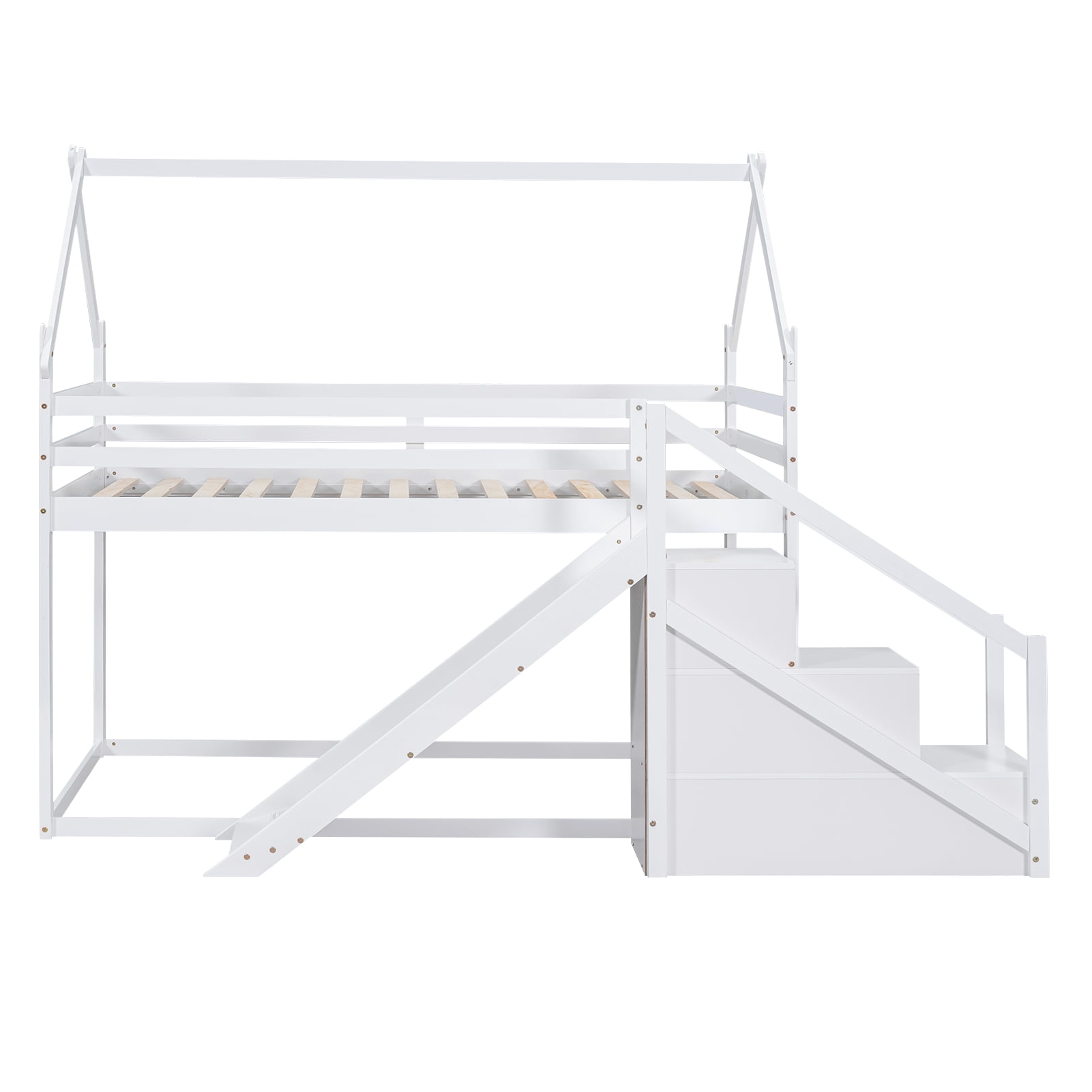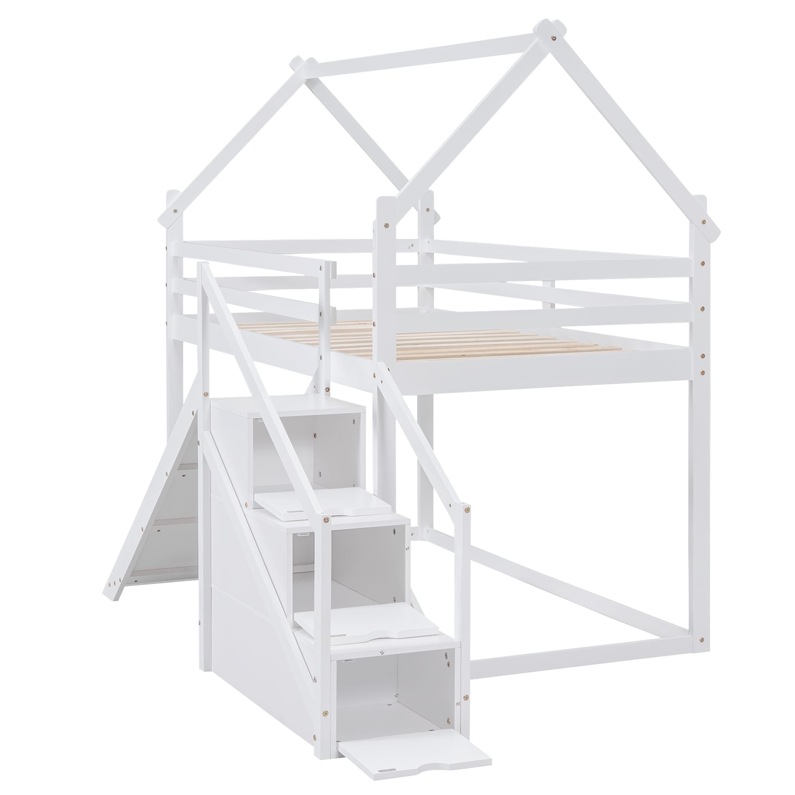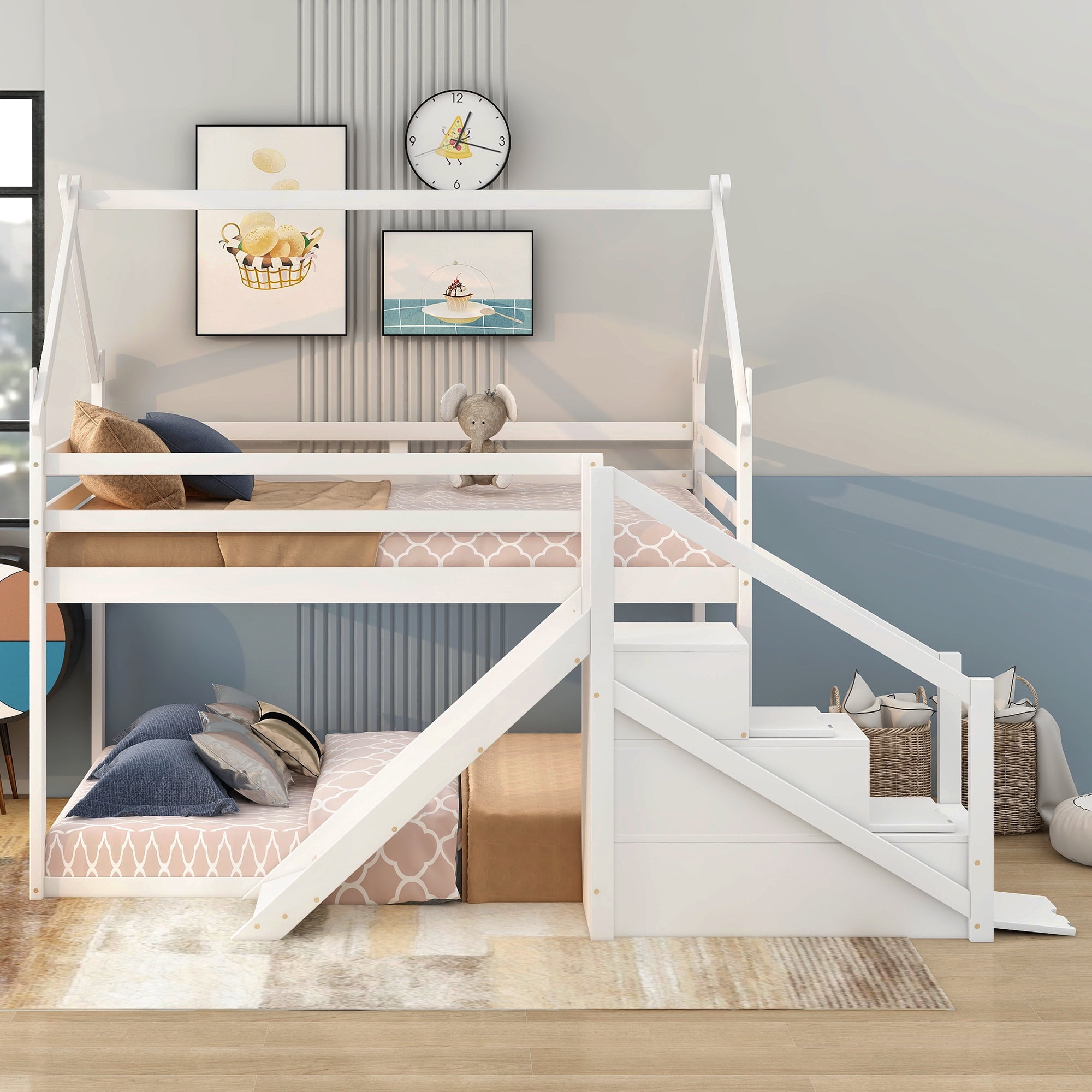 Features: [Twin Bunk Bed]: The twin over twin size bunk bed will provide more space for your child. The storage staircase will provide more storage room for you, so that save your space and make your room tidy and organized. [Low Profile Bed] The low bed is low to the ground, so your little one will be easy and safe to enter. Attached slide will add more fun to kids and the staircase will also protect your bare foot. [Safe and Comfortable]: Full-length guardrails on the house bed will prevent accidental falls. The attached staircase will provide easy access and wobble-free footing. [Solid Construction]: Made of solid pine wood and MDF board, this bed is built to withstand the test of time and serve your family for years. The bed frame is manufactured for sound stability and security that can withstand playing without dangerous wobbling. [Easy to Assemble]: With detailed instructions included, you can easily assemble this bed on your own. White or natural painted finish is smooth and easy to clean. All the parts and tools needed will be packed in the package. Specification: Size: Twin over Twin Overall Product Dimension: 77.4”L x 41.7”W x 73”H Loft Bed Size: 75.4” x 38.6” Overall Product Weight: 155lb Weight Capacity: 250lb Mattress Included: No Total Height: 73″ Assembly Required: Yes Recommend Bed Mattress Thickness: 6”/6-8”