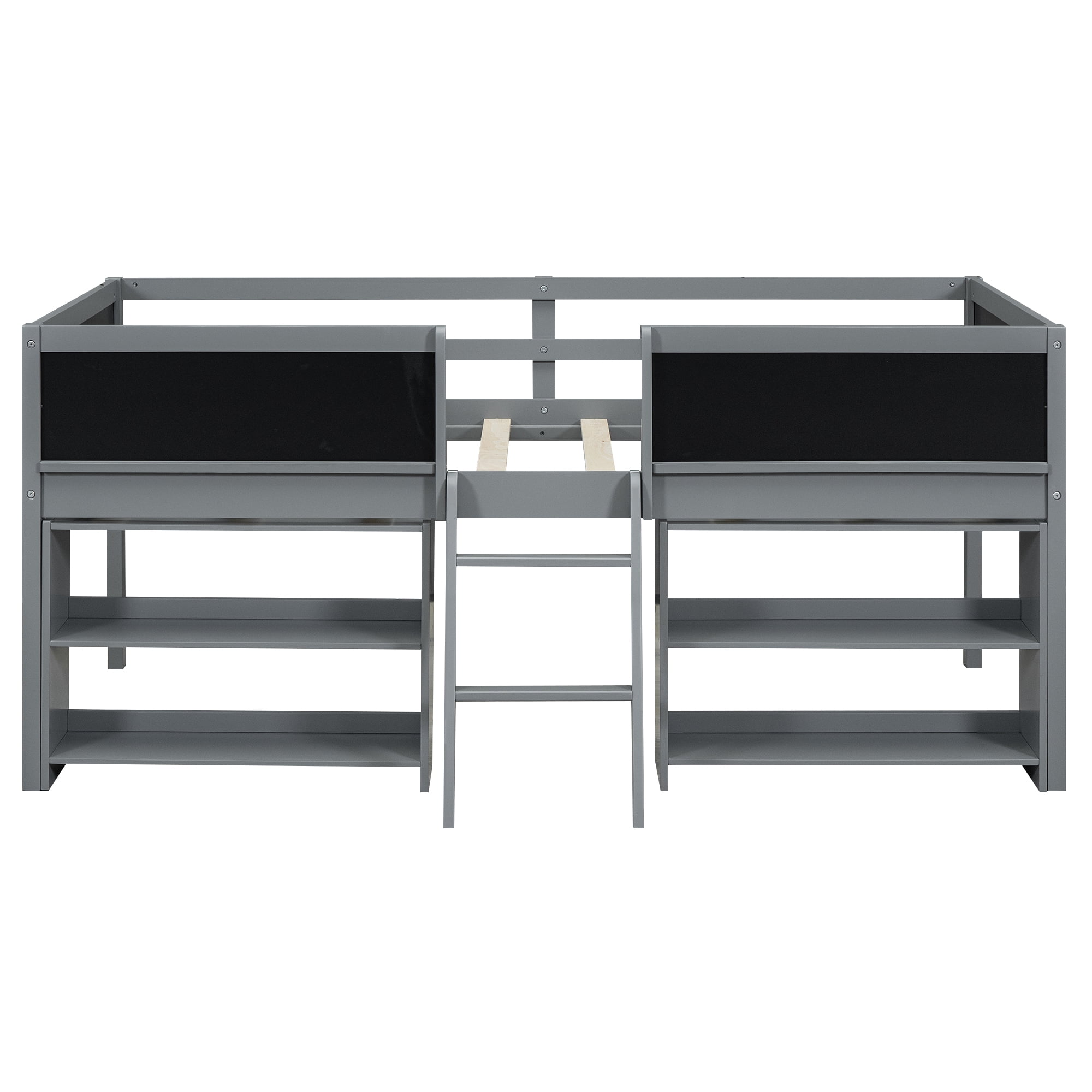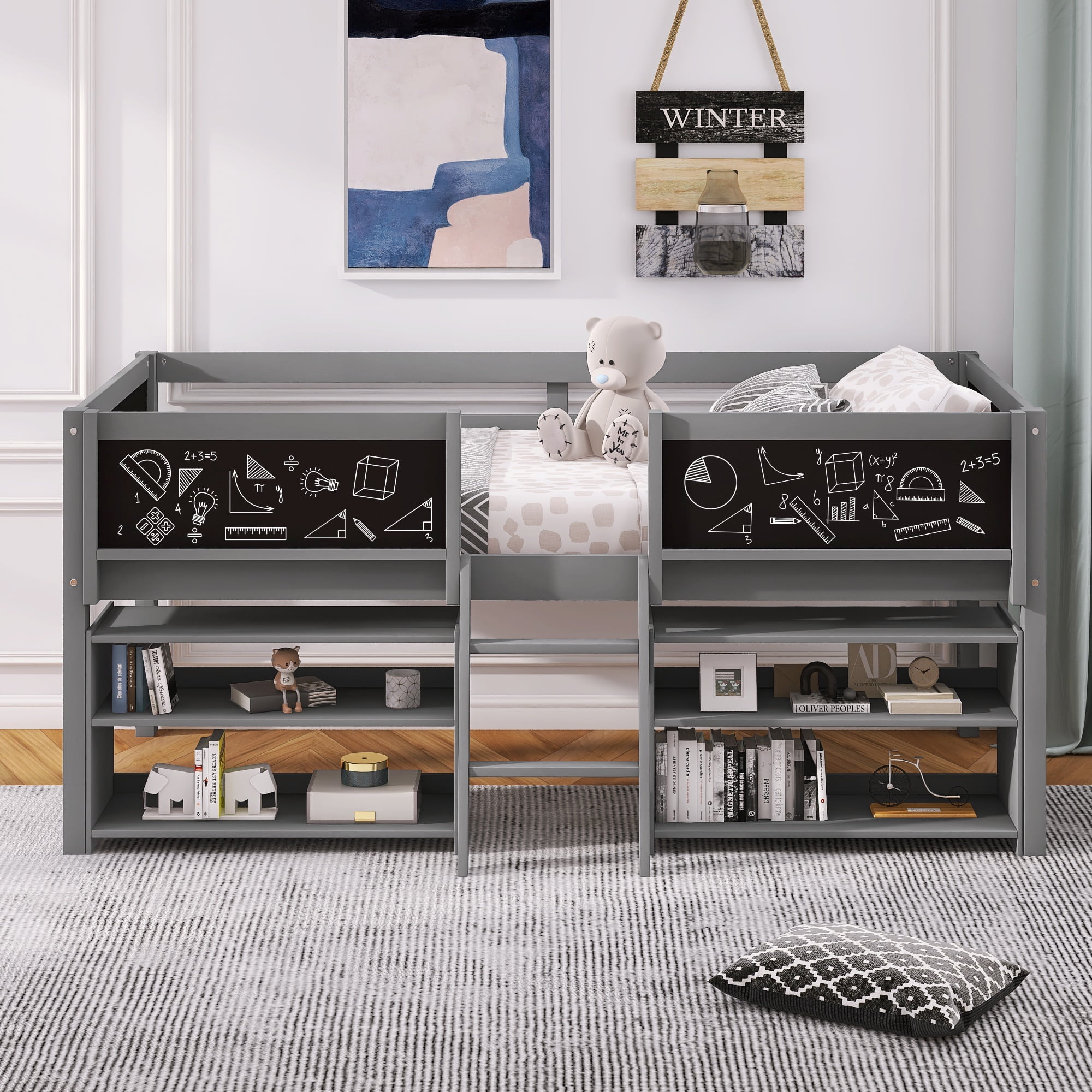 Euroco Wood Twin Loft Bed with Chalkboards for Bedroom, Low Profile Bed with Blackboard and Shelves for Kids Teens, Gray