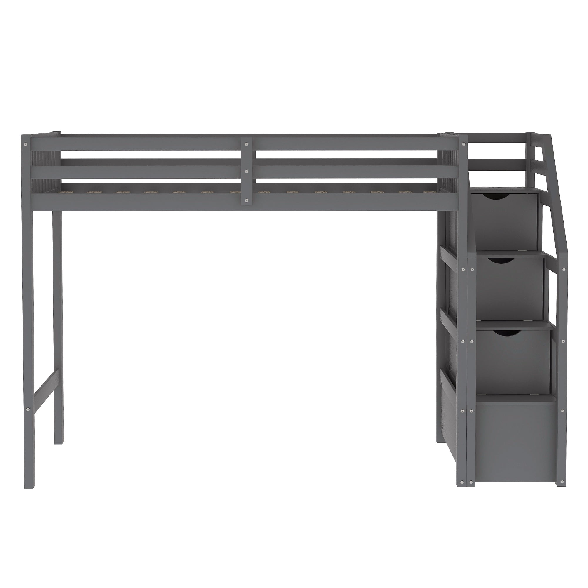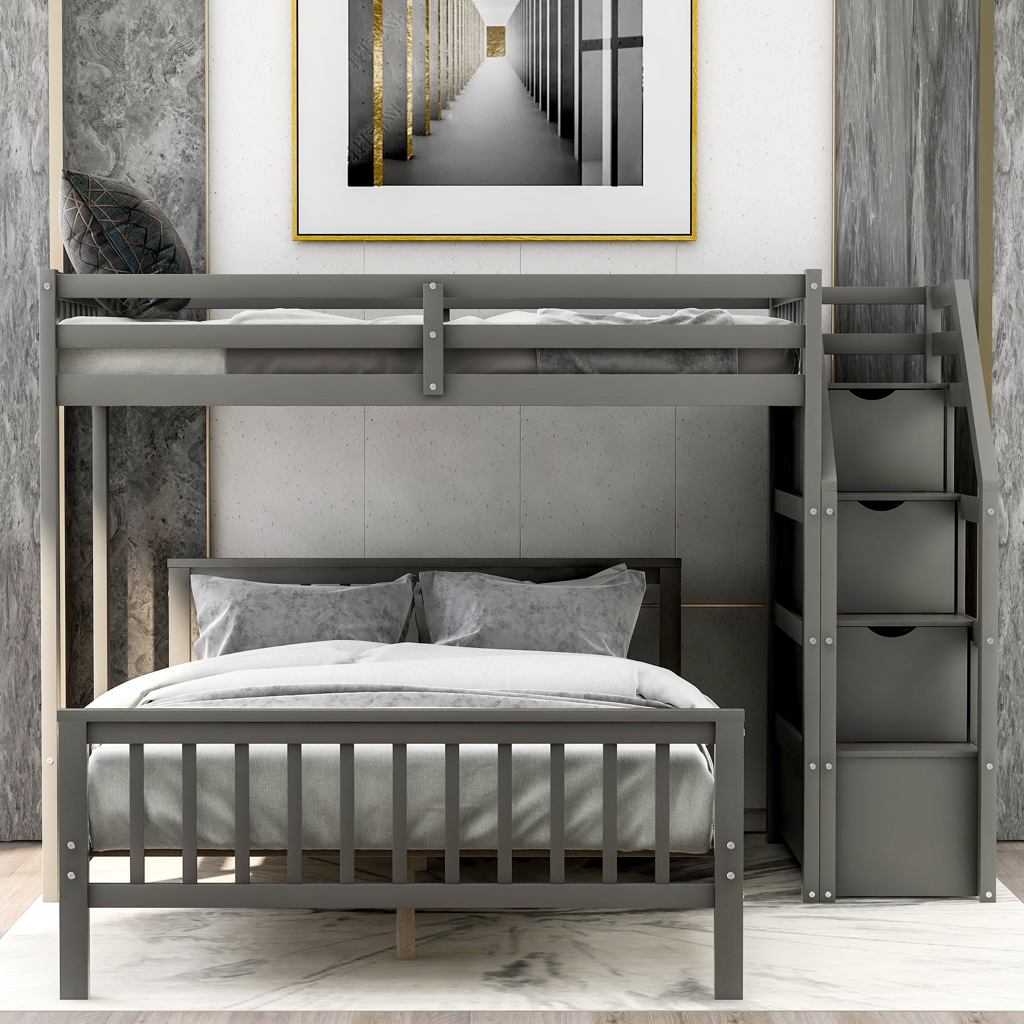 Features: Modern Appearance: The clean aesthetic blends with the classic grey color, making this loft-style bunk bed pairs with and enhances your kid’s bedroom decor. Storage Stairway: The stairway with built-in storage cabinets makes the most of your limited space, and helps you to organize and store extra items and accessories. Child-safe Design: The smooth finish is meticulously prepared to ensure the safety of your children and prevent injury. The fully-secured, high guardrails protect them during their slumber. You don’t need to worry about falling, and it is safe for kids to access the loft with a sturdy stairway. Convertible Use: This bunk bed can split into one loft bed and one platform bed on the bottom as needed, and also provides a more spacious play area or storage underneath. Durable & Sturdy: Both upper and bottom bunks feature 14 wooden slats to provide extra mattress support. The solid pinewood structure ensures additional weight capacity. It is suitable for kids of all ages. Perfectly Sized: Overall Dimensions: 97.2 x 78.4 x 61.4 inches (L x W x H). Recommend mattress thickness for upper bunk: 6″, bottom bunk: 8 – 10″. Simple Assembly: All parts and fittings are numbered sequentially, in order to help you to finish assembly quickly. Specifications: Upper bed: 42.4″ x 78.7″ Down bed: 57.6″ x 78.4″ Upper guardrails: 14.7″ Bed Weight capacity: 400 lbs