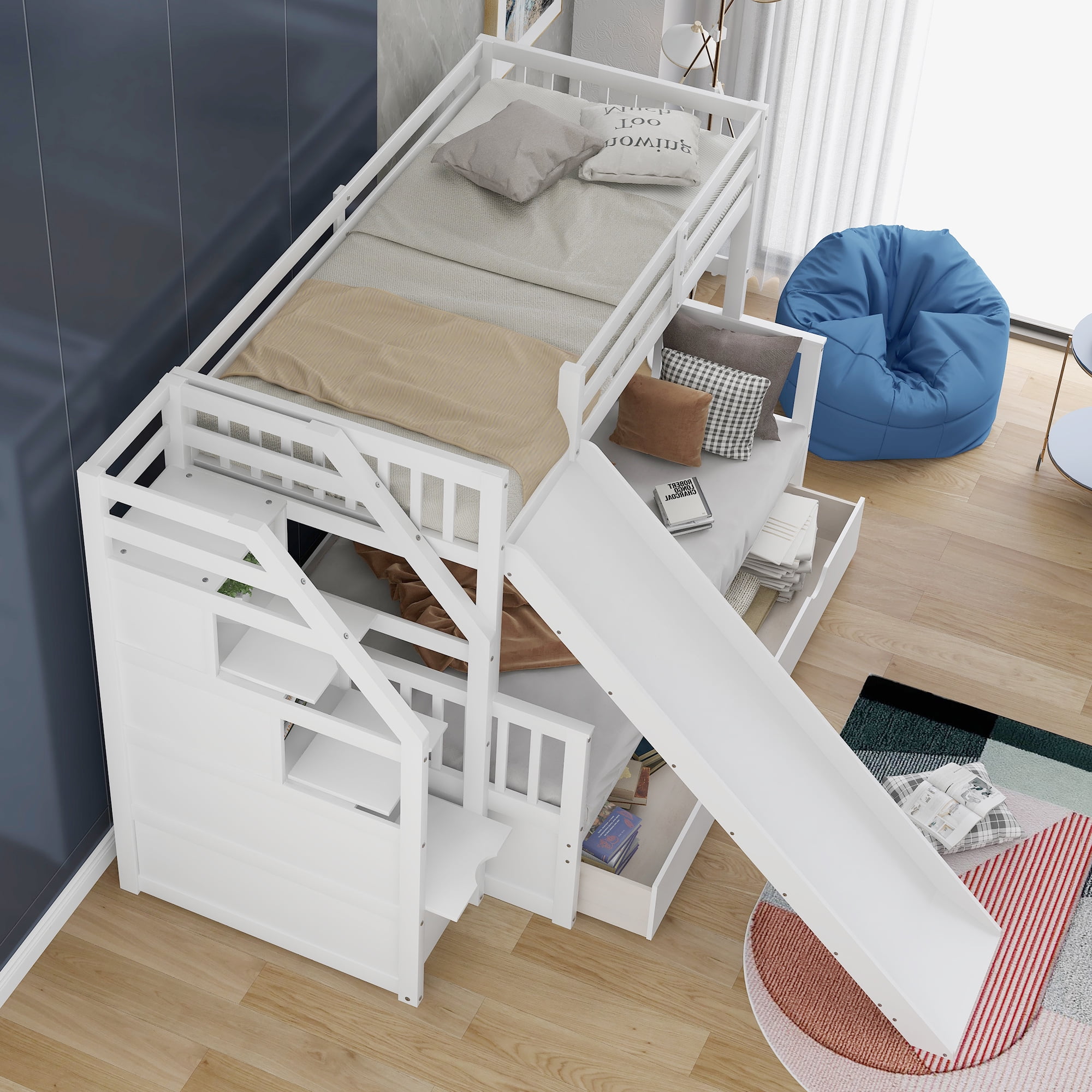 Euroco Wood Twin over Full Bunk Bed with 2 Drawers and Slide, Storage Staircase for Bedroom, White