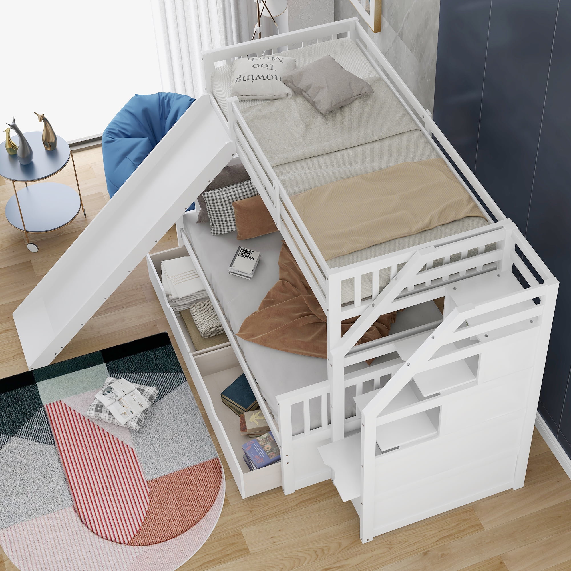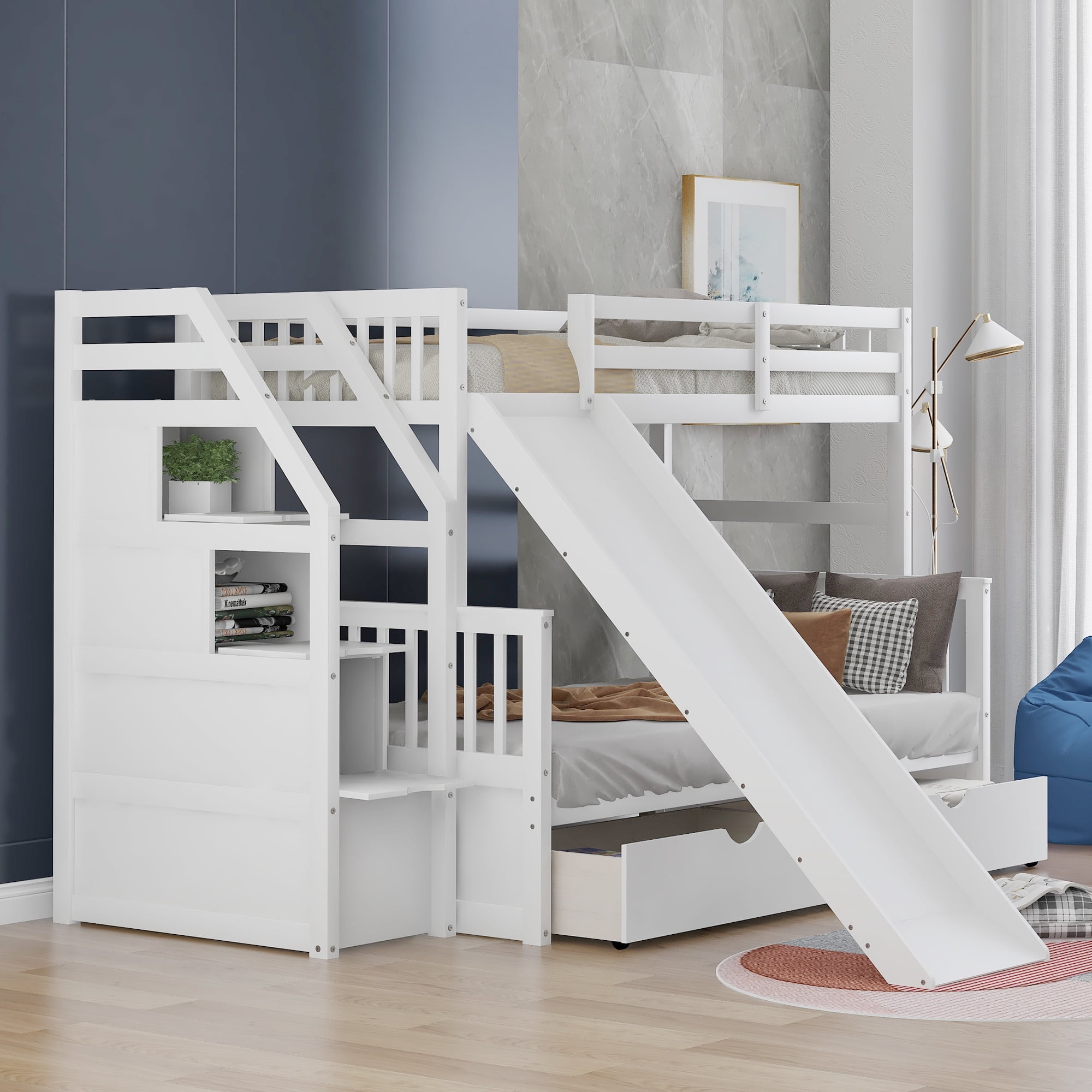 Features: Storage Space: Built-in Stairway instead of a ladder for easy access to the Top bunk with 3 drawers built into the Stairway and 2 under bed drawers shave space for extra comforters, pillows, linens, or other Need to Assemble: Assembly required with included tools, sale is for bunk bed, drawers, and slide only excludes mattresses An Ideal Bunk for Kids and Their Friends: This bunk bed features one twin size top bunk, one full size lower bunk, and two under drawer sand slides which are perfect for families with multiple children. Fun For Kids: The versatile bed provides great fun for kids not only during bedtime but also during the day. Adjustable Function: This bunk bed could be used as two separate beds (1 twin platform bed,1 full platform bed) when your kids grow up. The stairs could be assembled on the left or right according to your need. Shipped Into 3 Boxes: If you don’t receive them all at the same time, please wait for the other a few days. Specification: Weight capacity: 450 lbs Upper bed: 42.4″*77.9″ Down bed: 57.6″*77.9″ Total height: 61.8″ Railing: 14.6″ Drawer: 20.2″ x 37.8″