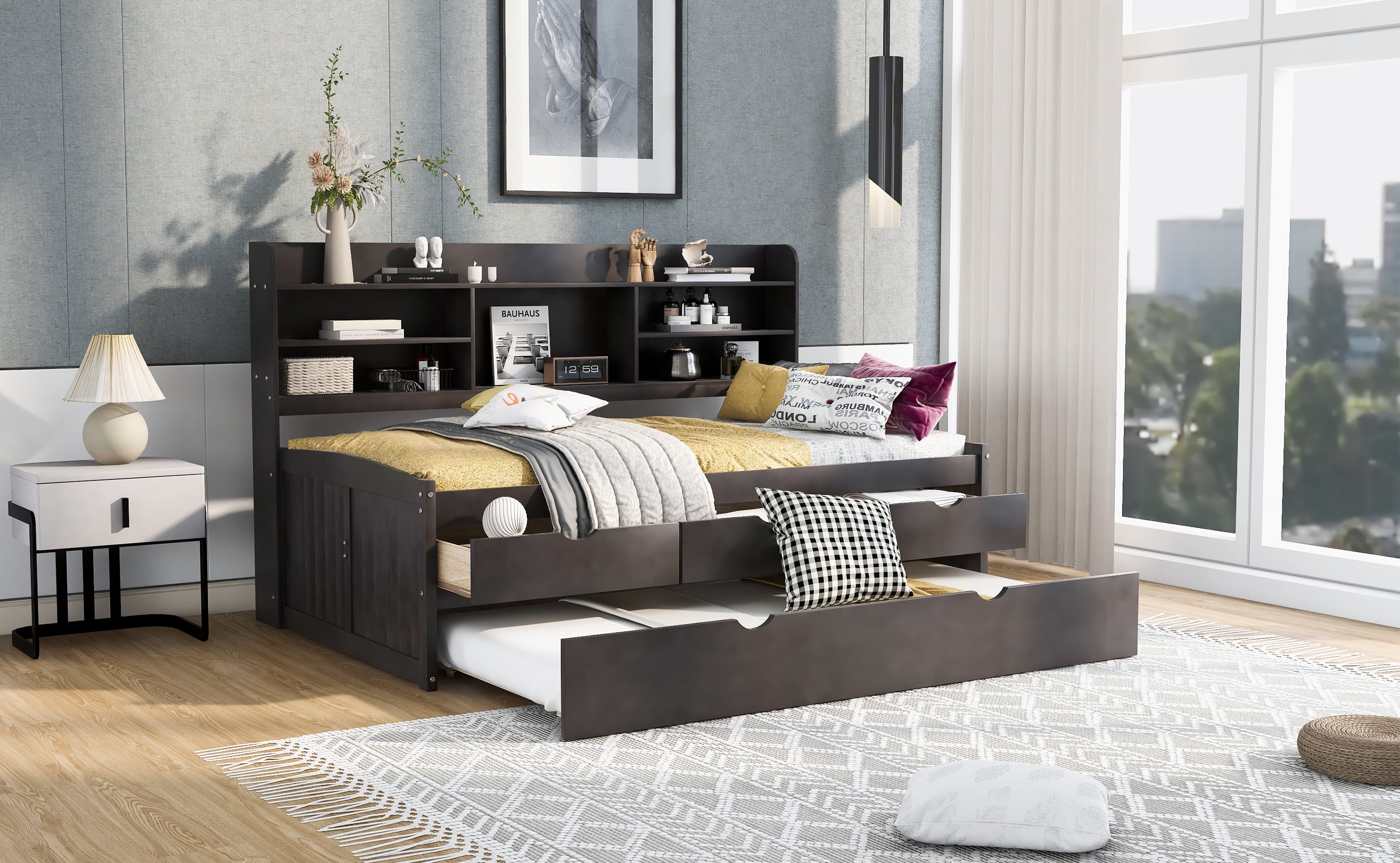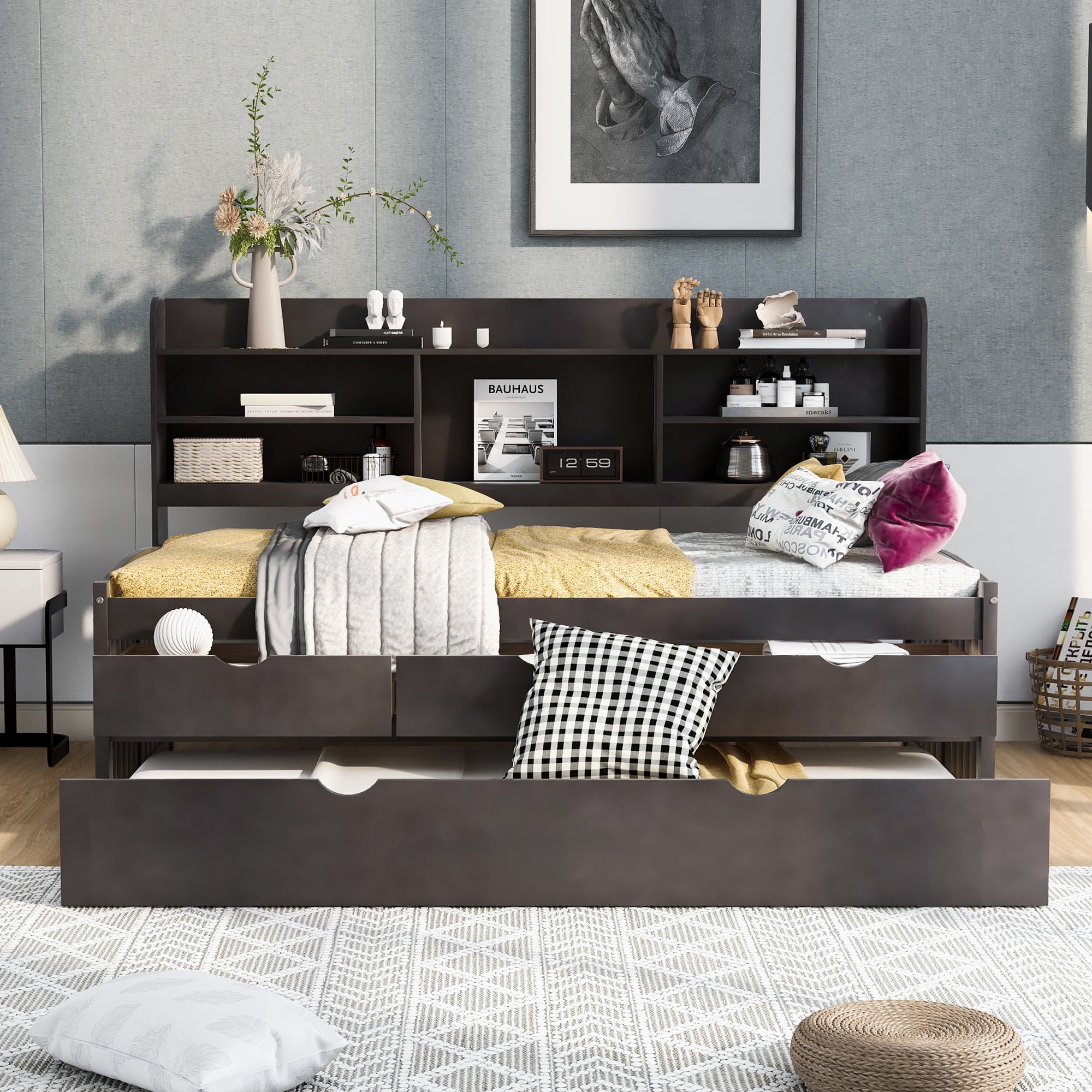 Features: [Special Shelf]: This daybed is equipped with a three tier shelf for your books and little stuff. It has been divided into small cabinets for you to place different things. The design will be easy for you to make it a display case. [Storage Drawers]: There are three drawers under the daybed, which is good place to store books, toys and clothes. With wheels on them, you can pull them in when you are not need them. Three drawers will save a lot space for your kids bedroom or guests room for kids and adults. [Pull out Trundle]: Besides the three drawers, this daybed also has a twin size trundle for your extra guests. Or you can pull it in for an extra storage to save more space for your bedroom. The trundle also has the wheels. [Solid Construction]: This daybed is made from solid pine wood and MDF, which will stand the test of time to serve your family for many years. The whole bed frame will be low and safe for your little one [Easy to Assemble]: This expertly crafted piece comes with everything you need to put it together, including all hardware and simple tools to get you from box to bedroom in less time than you’d think. Specification: Size: Twin Overall Product Dimension: 77.5″L*88″W*47.2″H Bed Inner Size: 74.8″x 39.4″ Overall Product Weight: 163lb Bed Weight Capacity: 220lb Mattress Included: No Total Height: 47.2″ Assembly Required: Yes Recommend Bed Mattress Thickness: 6”