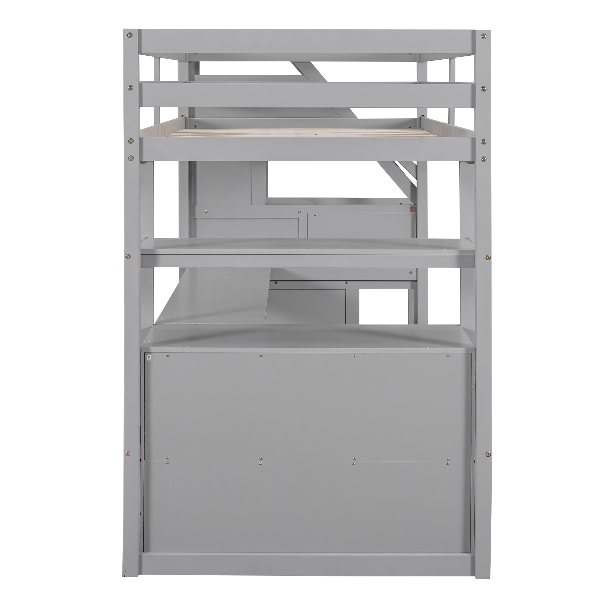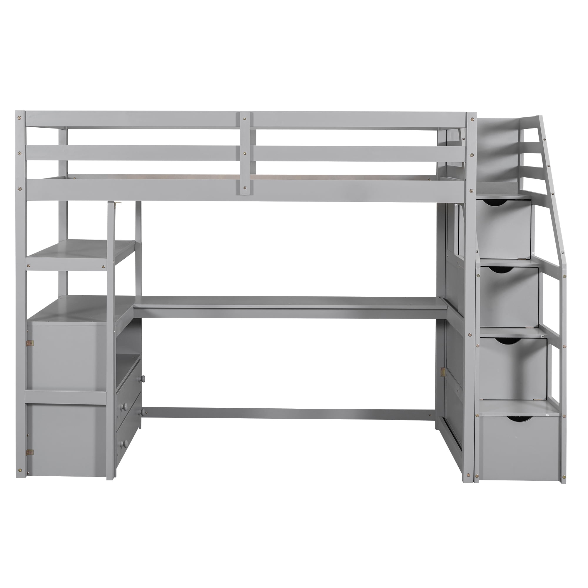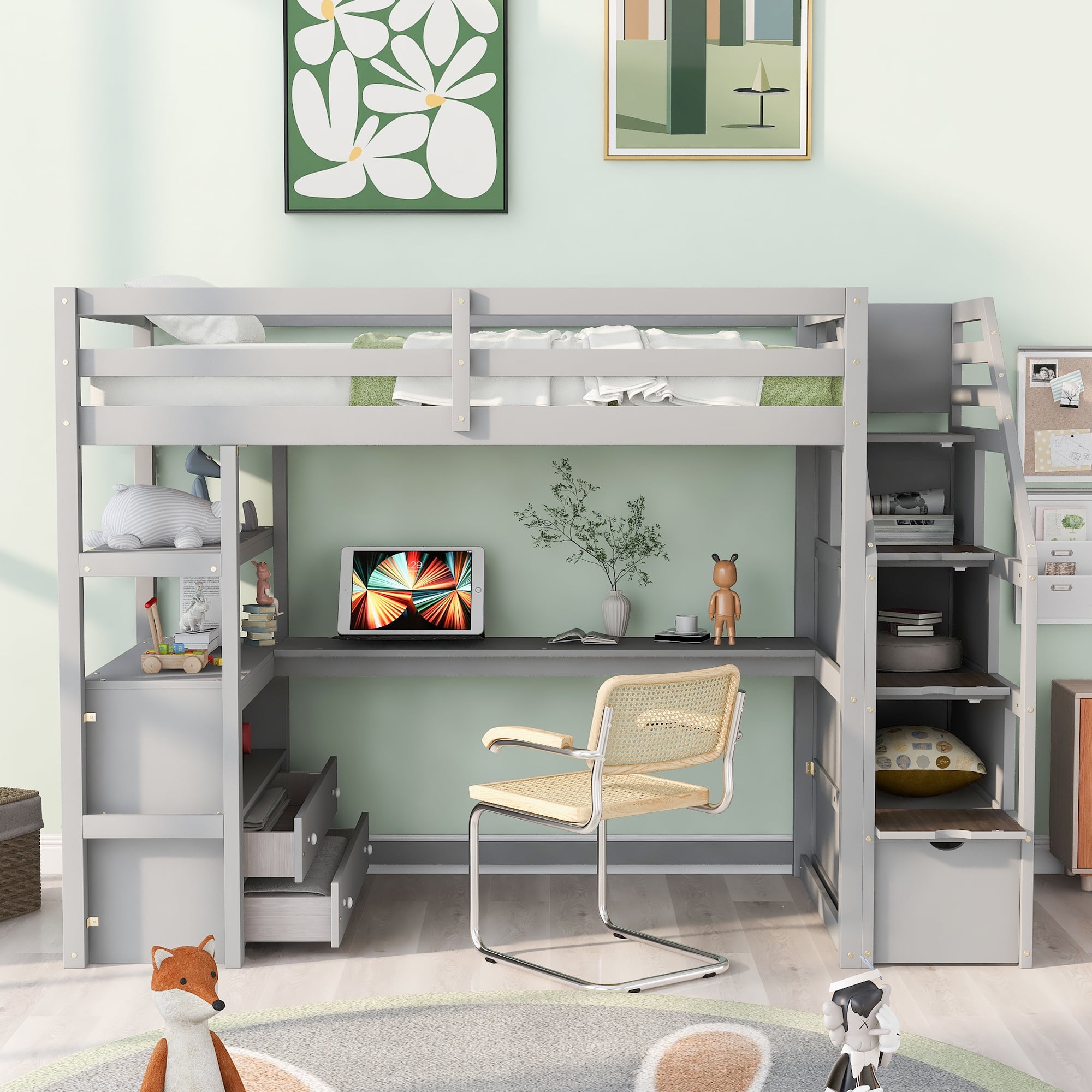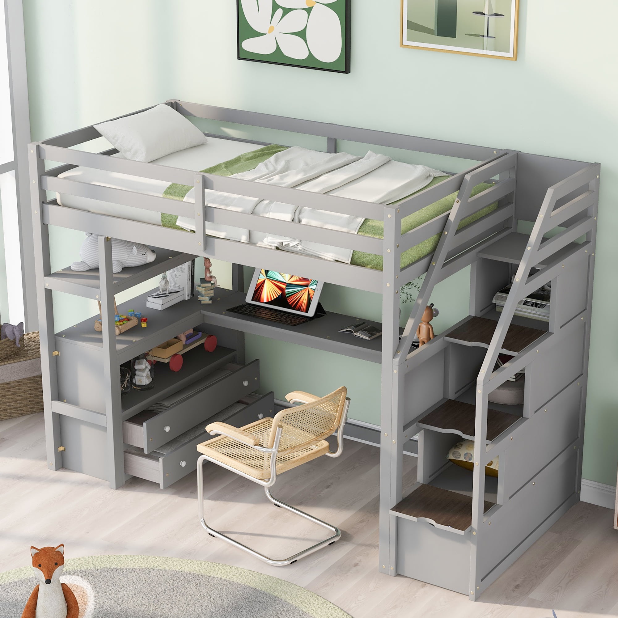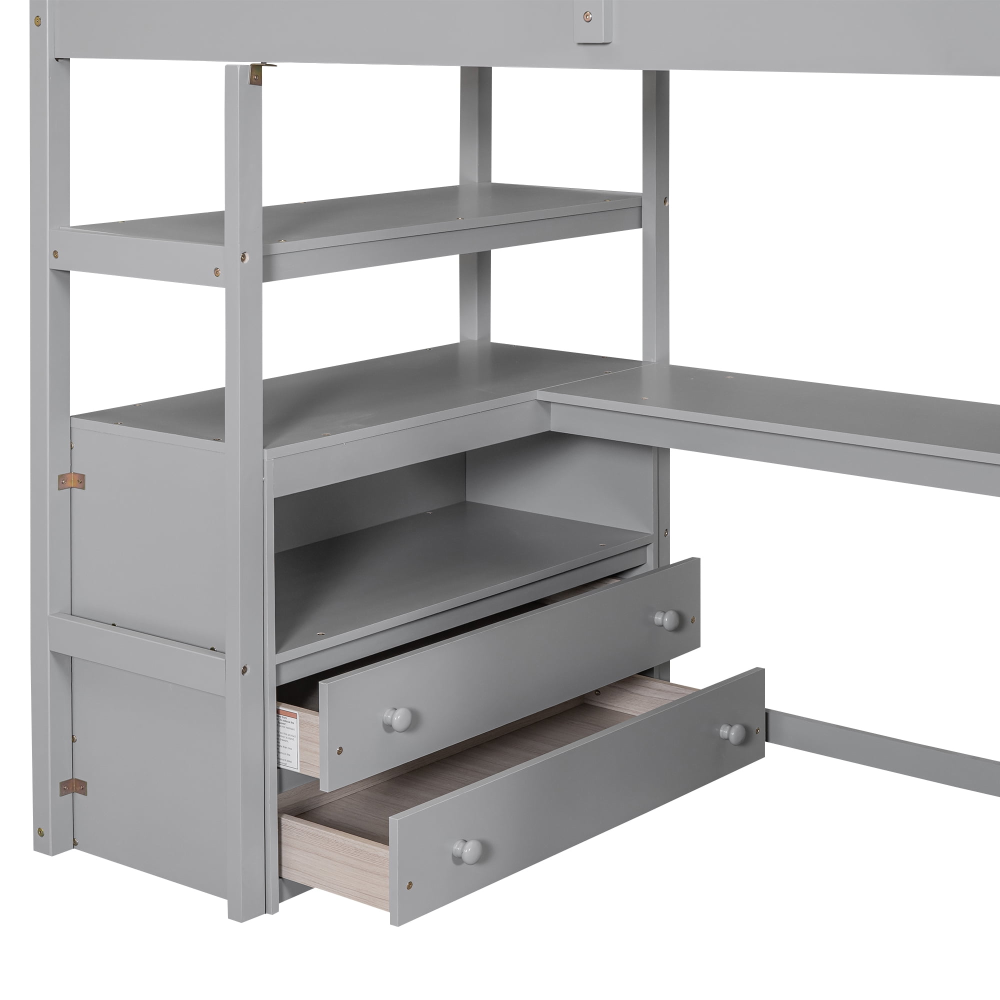 Euroco Wood Twin Size Loft Bed Frame with Desk, Shelves and Drawers for Kids Teens, Gray