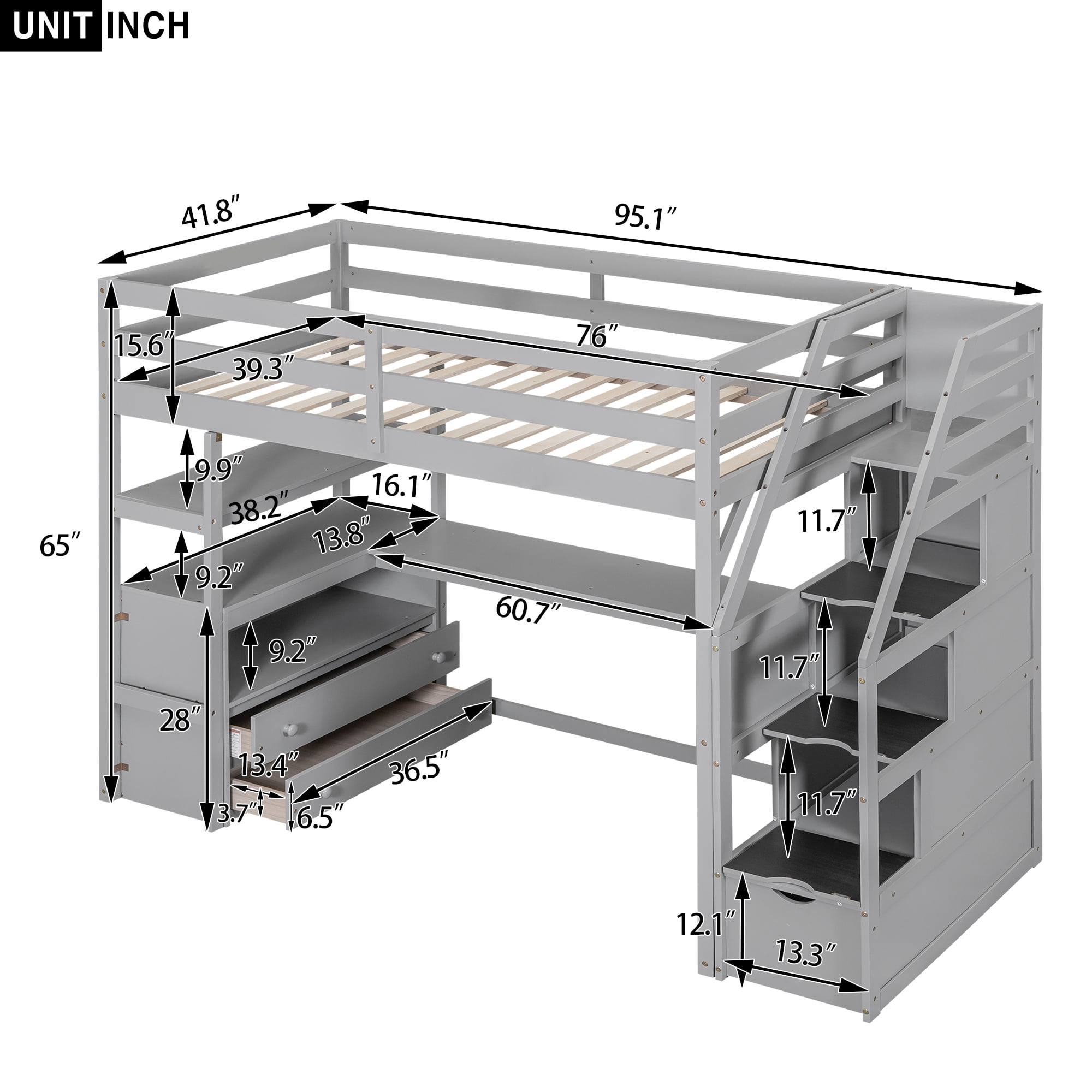 [Solid Wood]: This multi-functional loft bed is crafted from solid pine wood frame, with MDF board for durability. The storage staircase is great for tricky rooms where space is a concern. Guardrails are solidly attached for added safety. [Desk, Drawers and Shelf]: The space underneath the wood loft bed is a good place for reading, doing homework or playing and creating own world. Coming with spacious bookshelves, cabinets and drawers, the loft bed helps to store books, display decorations, or place a laptop. [Space-Saving]: The loft bed perfectly serves homes with limited space. It takes advantage of the floor space, and allows for a cozy rest, extra work and play space and makes a great piece of furniture for growing families. [Safe and Comfortable]: This loft bed is designed to last for a lifetime as well as maintain its stylish look with clean lines that blend well with the surroundings. Our designs promote both comfort and elegance. [Easy to Assemble]: All the parts and hardware needed will be shipped in your box. Follow the assembly instructions to quick and easy assemble your own loft bed. No additional box spring or foundation required. Specification: Size: Twin/Full Overall Product Dimension: 95.1”L*41.8”W*65”H Inner Size:76”x 39.3” Overall Product Weight: 251.5lb Bed Weight Capacity: 300lb Mattress Included: No Total Height: 65″ Assembly Required: Yes Recommend Bed Mattress Thickness: 6” Loft bed with drawers, desk, shelves, books adn cabinets Solid bed with guardrails and slats