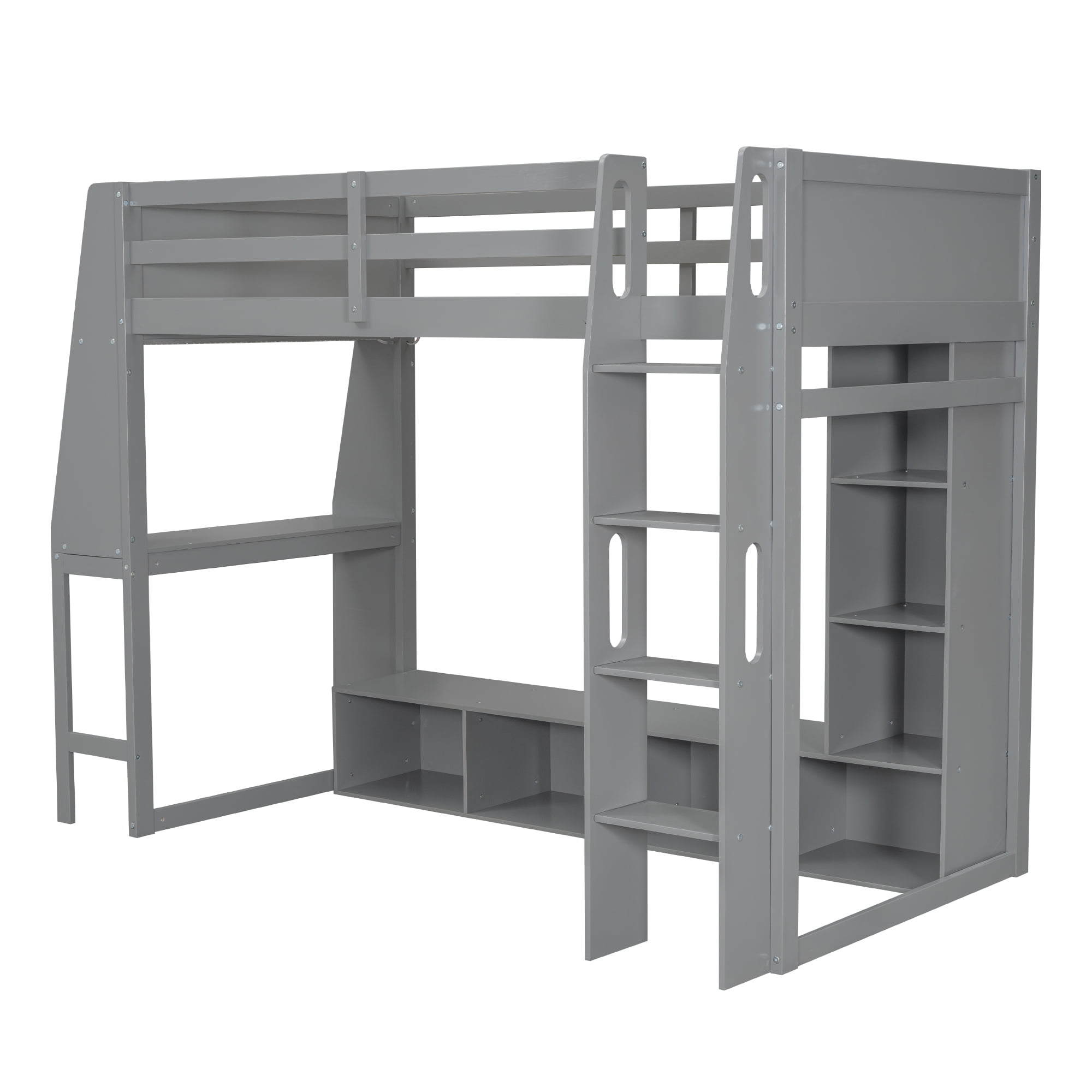 Euroco Wood Twin Size Loft Bed with Desk and Shelves, Gaming Bed with LED Light and Clothes Rack for Kids Teens, Gray