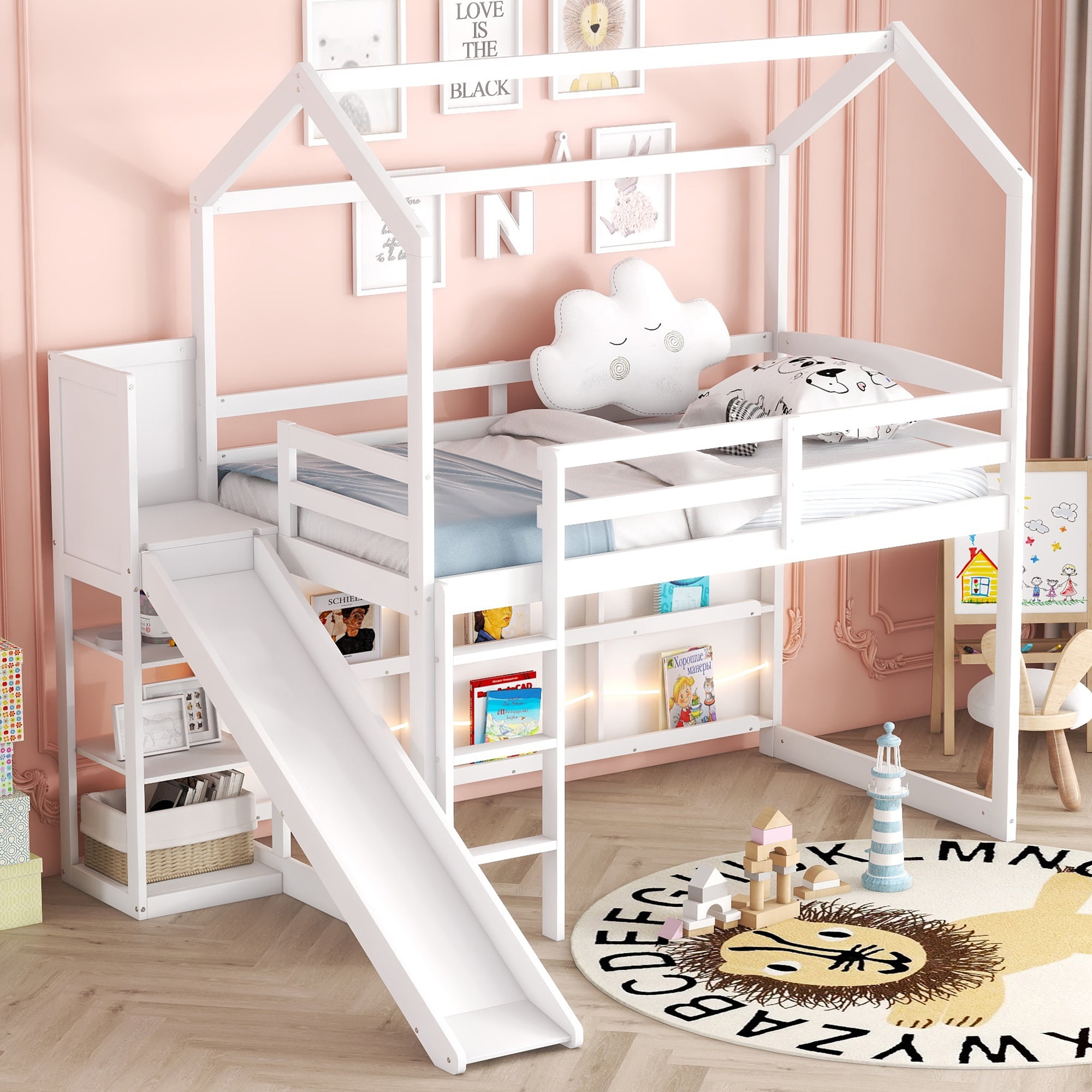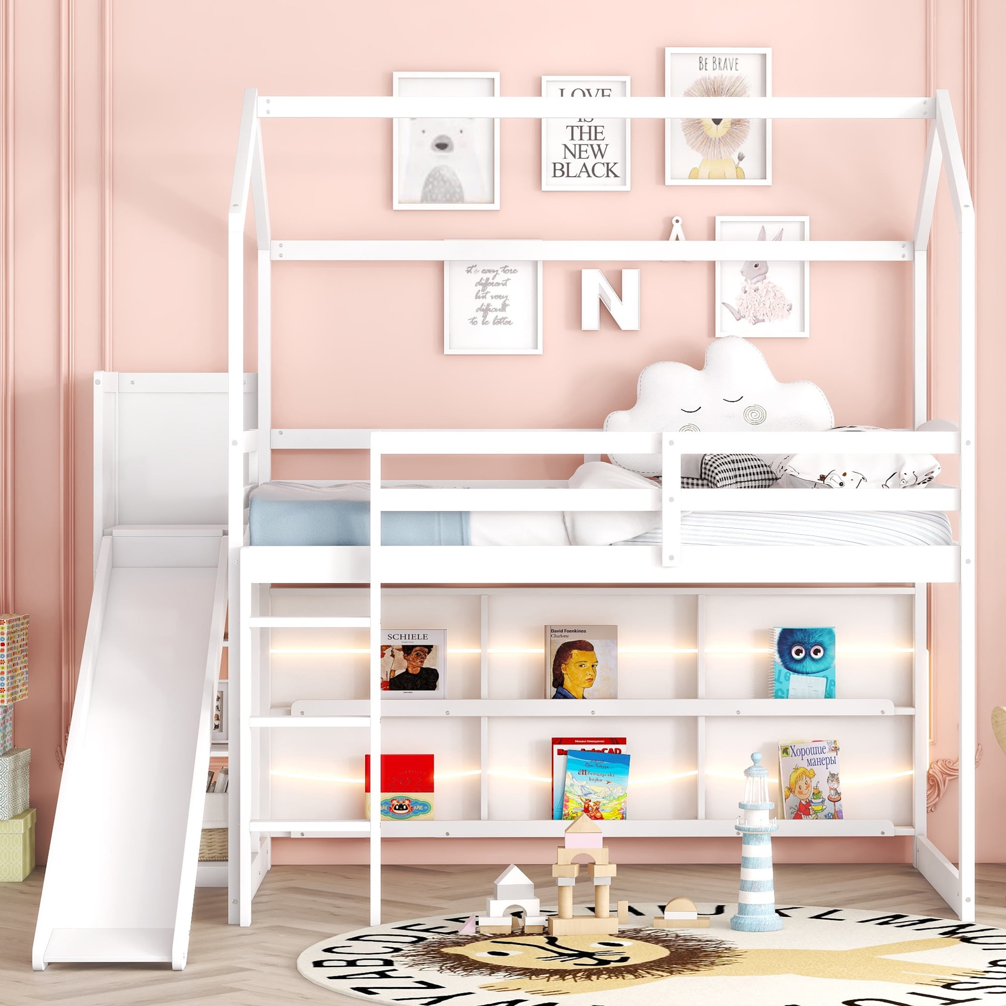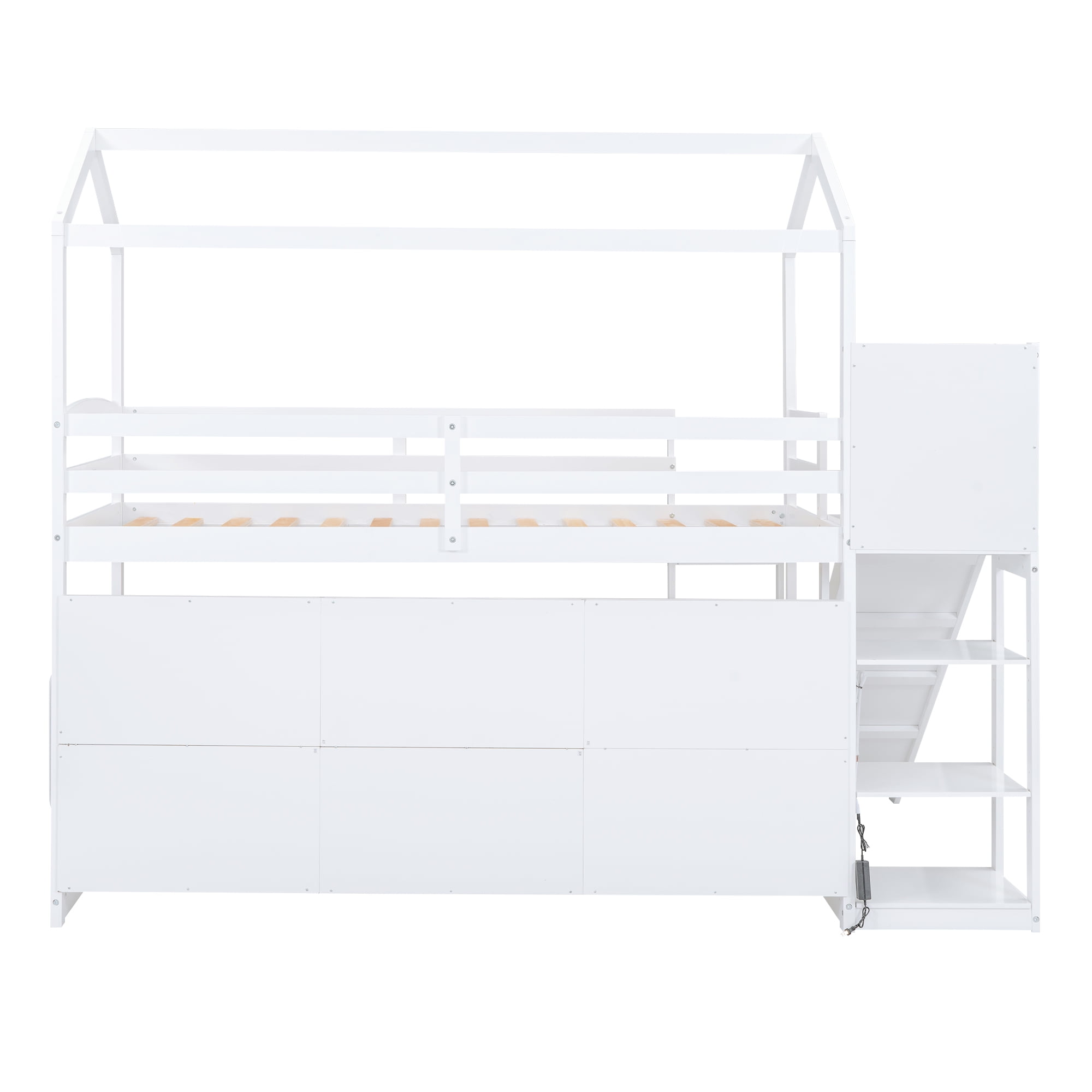 Features: [Storage Open Shelf]: The space under the loft bed is fully used. Big and divided open shelf can be a bookcase or showcase for your little one. The upper loft bed also has shelf for storage. [Solid Construction]: Quality tested sturdy wood construction features solid support and heavy-duty strength, the bed frame is sturdy enough to last for long time use. No box spring needed, more sturdy than ordinary bed frame. [Safe and Comfortable]: Full-length guardrails and solid frame make more safe. Featuring full-length guardrail on top bed, providing all-round protection, so you don’t have to worry about your child accidentally falling and getting injured. [Easy to Assemble]: All the necessary accessories and the detailed installation instructions are packaged well in the product parcel, and it will help you assemble and use it quickly and easily. It is very easy to assemble and don’t worry for assembling and moving. Specification: Size: Twin Overall Product Dimension: 96.1”L x 70.7”W x 80.7’H Inner Size:75.2” x 39.2” Overall Product Weight: 170lb Bed Weight Capacity: 400lb Mattress Included: No Total height:80.7” Spring box:No Need Assembly Required: Yes