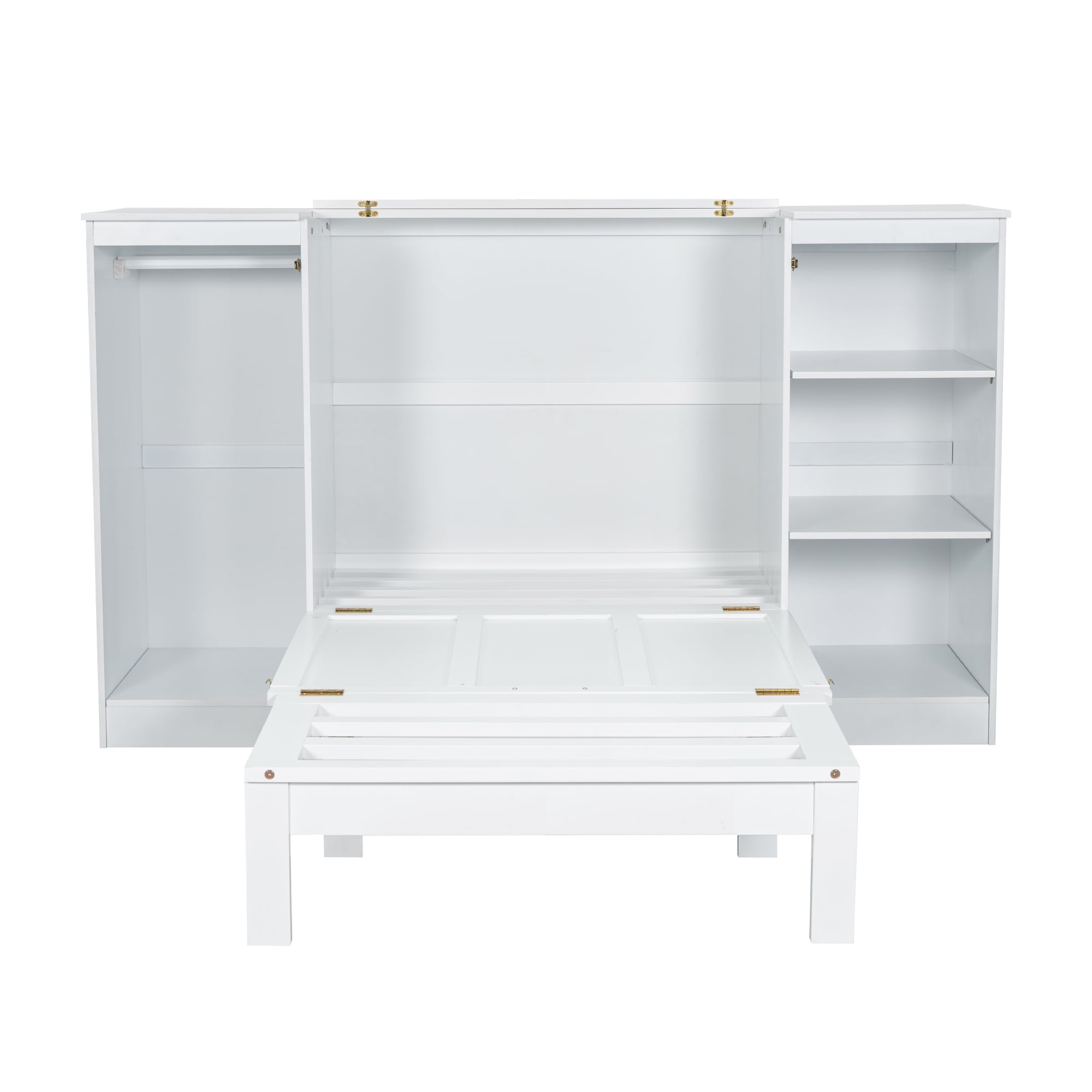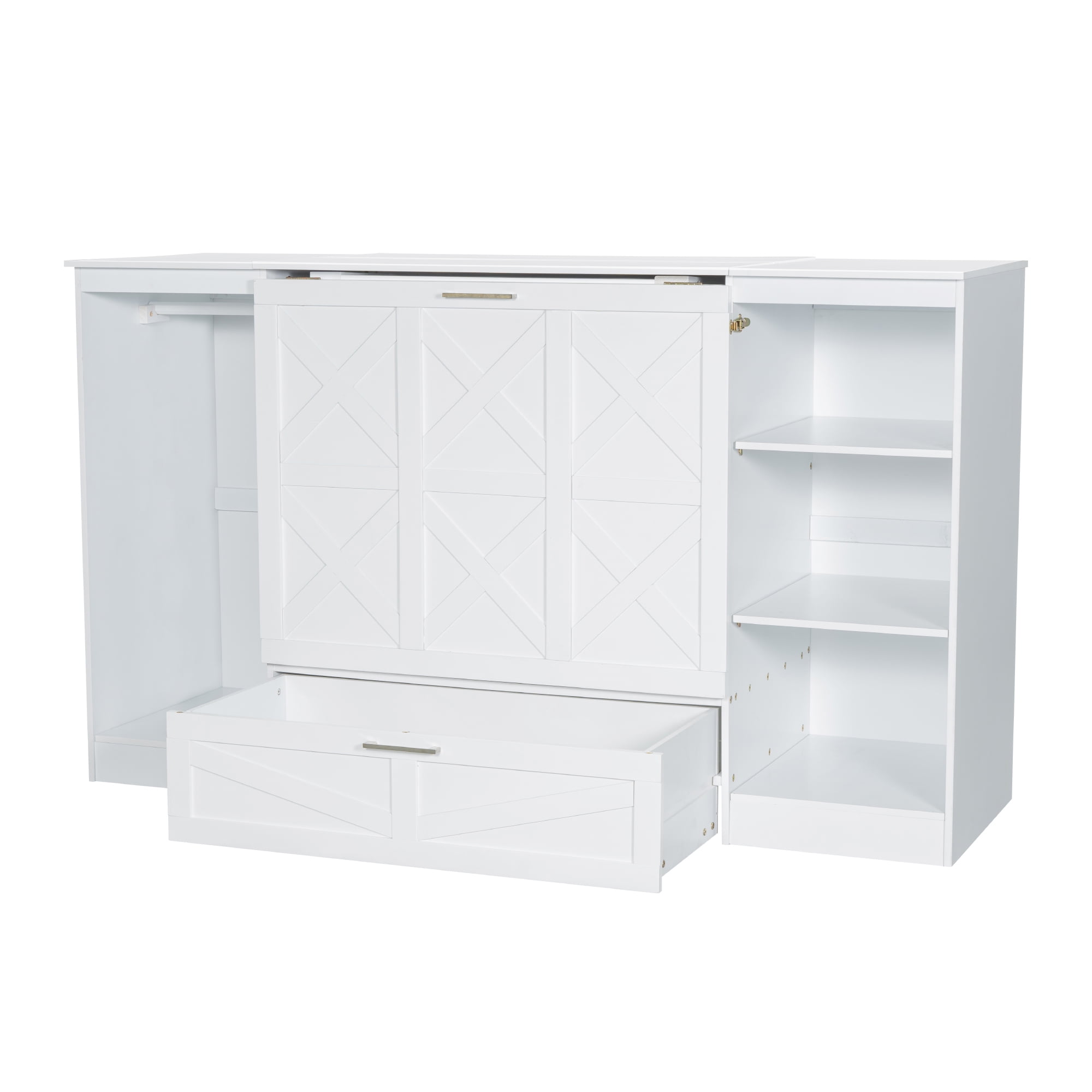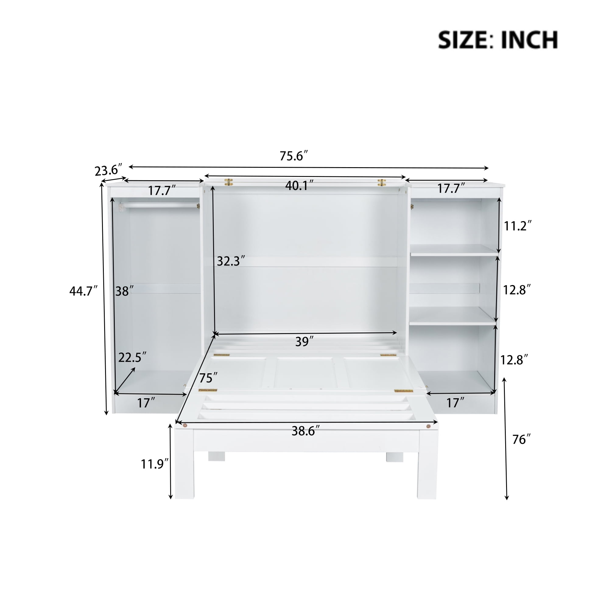 Features: [Space-Saving Murphy Bed]: If you want to save more space for your bedroom or guests room, this murphy bed is what you want. Murphy bed can be easily turned to a twin size platform bed or a storage cabinet when you fold it. [Wardrobe and Shleves]: This bed has a wardrobe and three tier shelves for you to store extra stuff. One big drawer can also be usef for clothes and bedding. [Solid Construction]: Sturdy wood slats support and this bed will extend the life of your latex, memory foam or spring mattress without the need of a box spring. High quality wood frame will stand the test of time and serve your family for many years for kids and adults. [Easy to Assemble]: All the parts and tools needed will be packed in the package. The instruction and the accessories are also included in the package. Just follow the instruction, and then you will get your own functional bed. Specification: Size: Twin Overall Product Dimension: 76”L x 75.6”W x 44.7”H Inner Size: 75” x 39” Overall Product Weight: 207.5lb Bed Weight Capacity: 250lb Mattress Included: No Total Height: 44.7″ Assembly Required: Yes Recommend Bed Mattress Thickness: 6” Spring Box: No need Material: Pine Wood+MDF