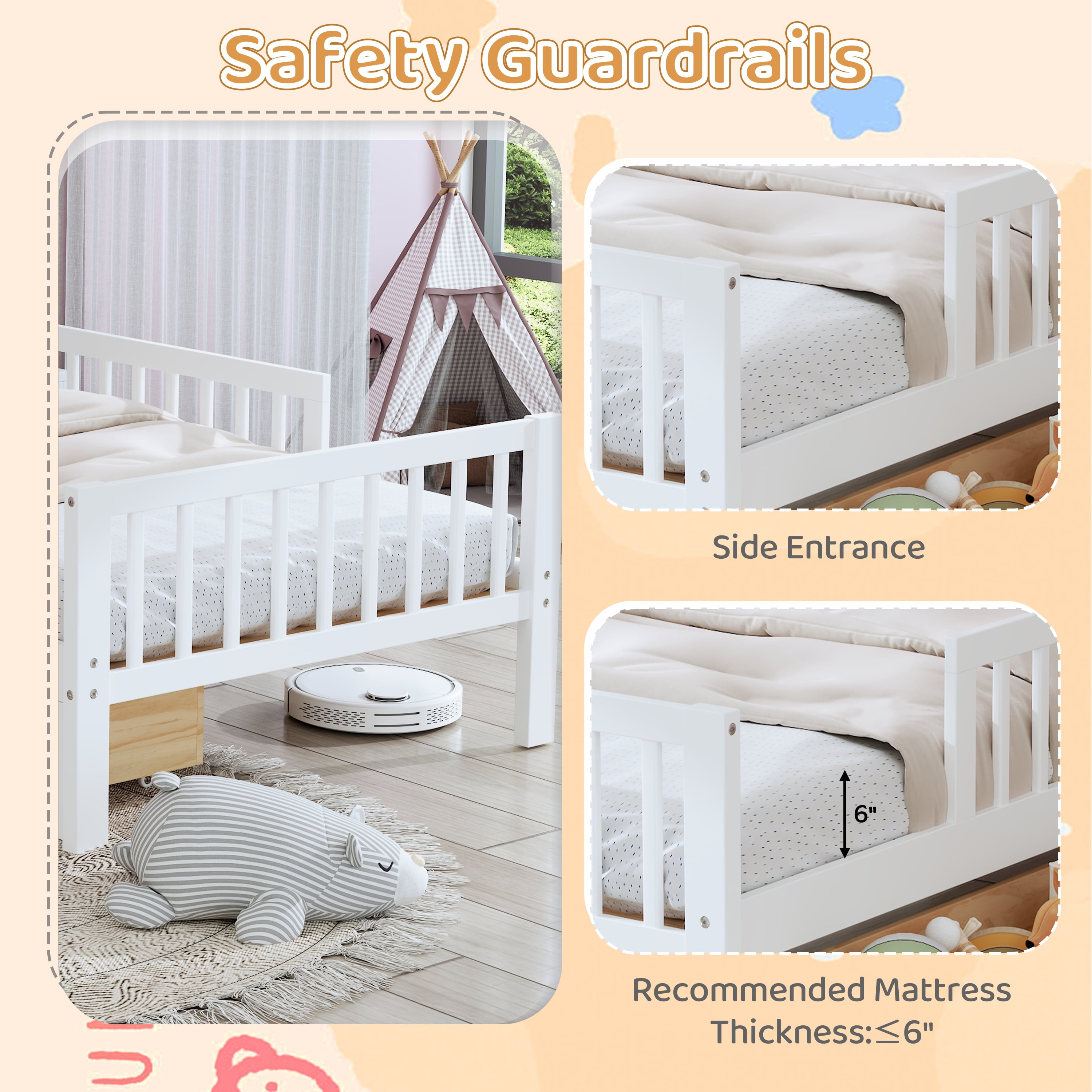 Key Features: All-in-One Storage Solution: Featuring a headboard storage rack and two under-bed drawers, this bed offers ample space to organize books, toys, clothes, and more, keeping your room tidy and clutter-free. Enhanced Safety Design: The three-side guardrails provide added protection, making this bed a safe choice for children, toddlers, or anyone who values a secure sleeping environment. Space-Saving Wonder: Designed for small rooms, apartments, or dormitories, this bed maximizes floor space without sacrificing style or comfort. Durable and Easy to Clean: Crafted from high-quality, scratch-resistant materials, this bed is built to withstand daily wear and tear while maintaining its sleek appearance. Modern Aesthetic: With its clean lines and neutral finish, this bed seamlessly blends into any decor style, from playful kids’ rooms to minimalist teen spaces. Product Specifications: Size: Twin Overall Product Dimension: 84.6″L X 43.5″W X 30.3″H Material: Pinewood+Plywood+MDF Color: White/Pink/Walnut/Gray Weight Capacity: Supports up to 300 lbs Drawer Dimensions: Each drawer offers ample storage space for your belongings. Assembly Required: Yes