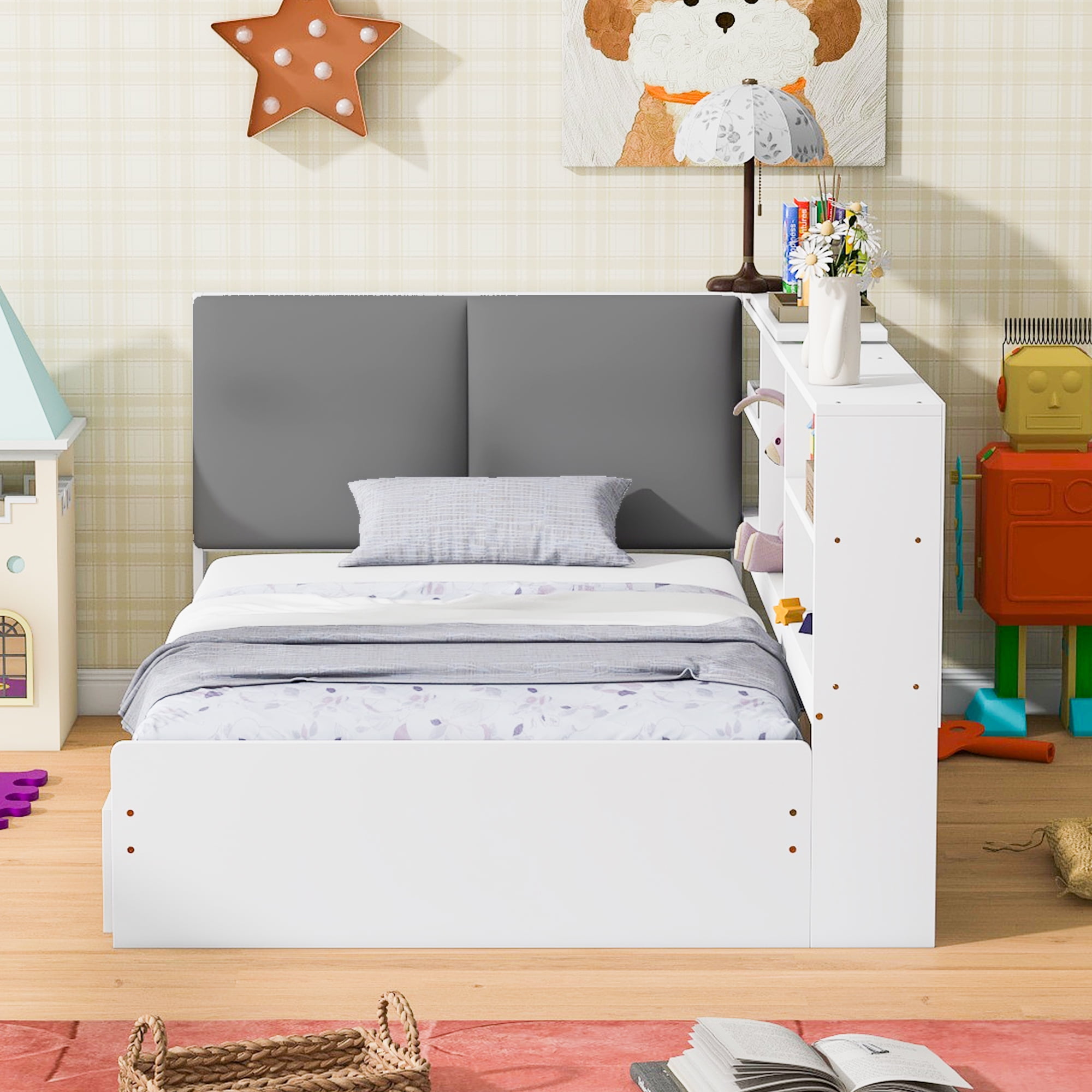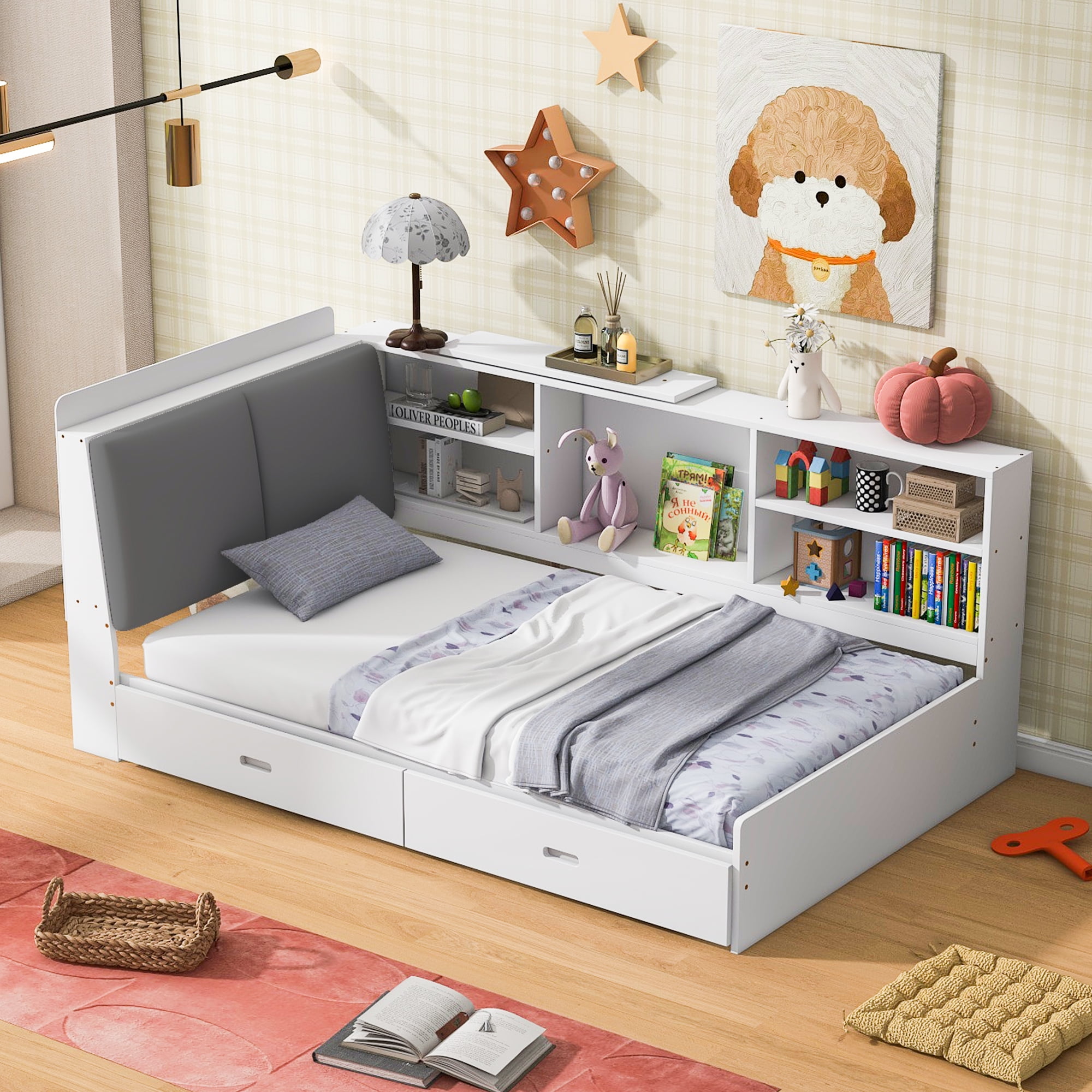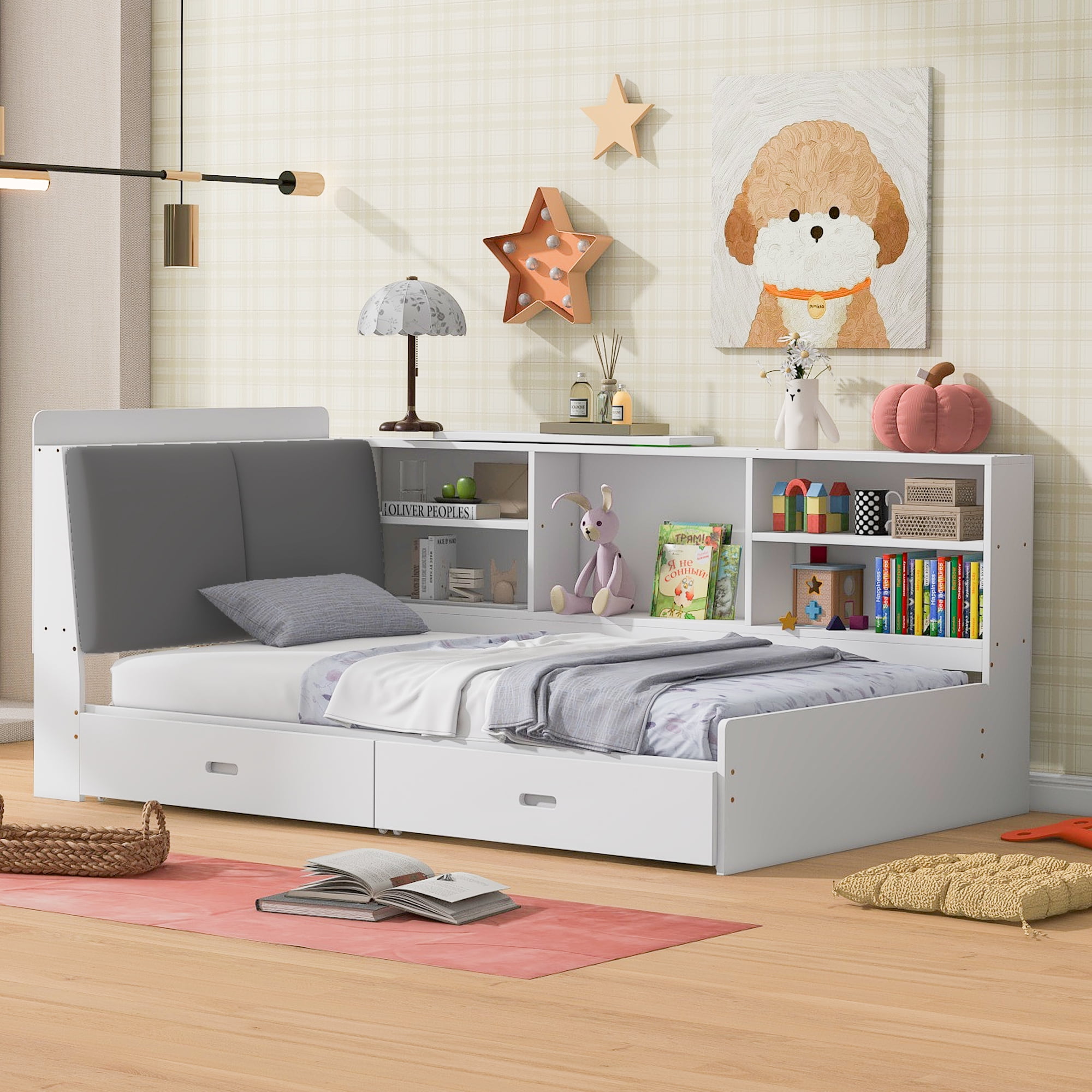 Features: [Storage Headboard]: This platform bed is equipped with a functional two tier shelf for your books and little stuff. It has been divided into small cabinets for you to place different things. The design will be easy for your to make it a display case. The upholstered cushion door can protect your private and you can lean on it when reading or watching. [Storage Drawers]: There are two drawers under the bed, which is good place to store books, toys and clothes. With wheels on them, you can pull them in when you are not need them. Two drawers will save a lot space for your kids bedroom or guests room. [Solid Construction]: This bed is made from solid pine wood and MDF, which will stand the test of time to serve your family for many years. The whole bed frame will be low and safe for your little one to enter for kids and adults. [Easy to Assemble]: This expertly crafted piece comes with everything you need to put it together, including all hardware and simple tools to get you from box to bedroom in less time than you’d think. Specification: Size: Twin Overall Product Dimension: 81.3”L x 50.7’W x 33.9”H Inner Size: 75.2” x 39.4” Overall Product Weight: 124.4lb Weight Capacity: 250lb Mattress Included: No Total Height: 33.9″ Assembly Required: Yes Recommend Bed Mattress Thickness: 6”- 8” Storage headboard Drawers and cushion