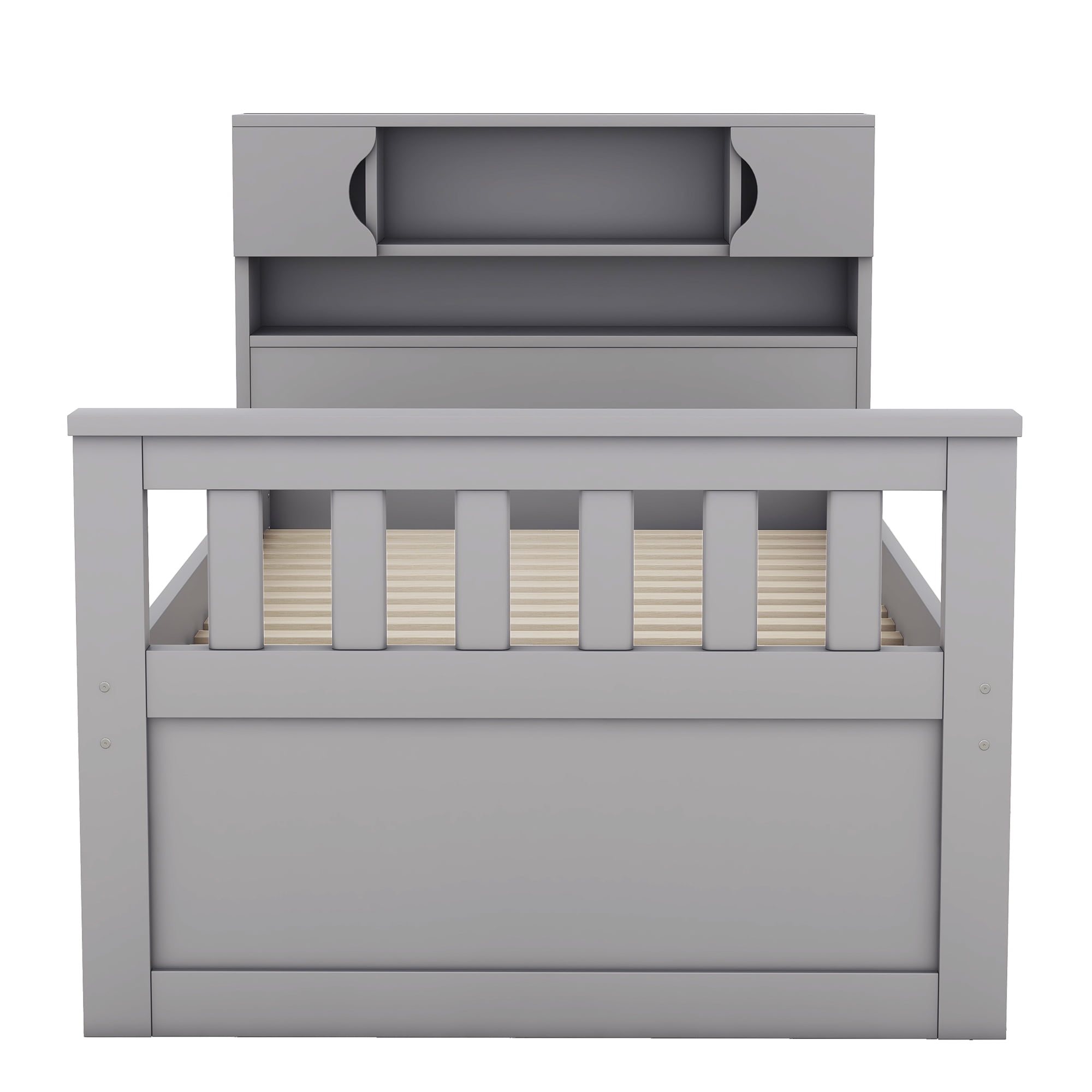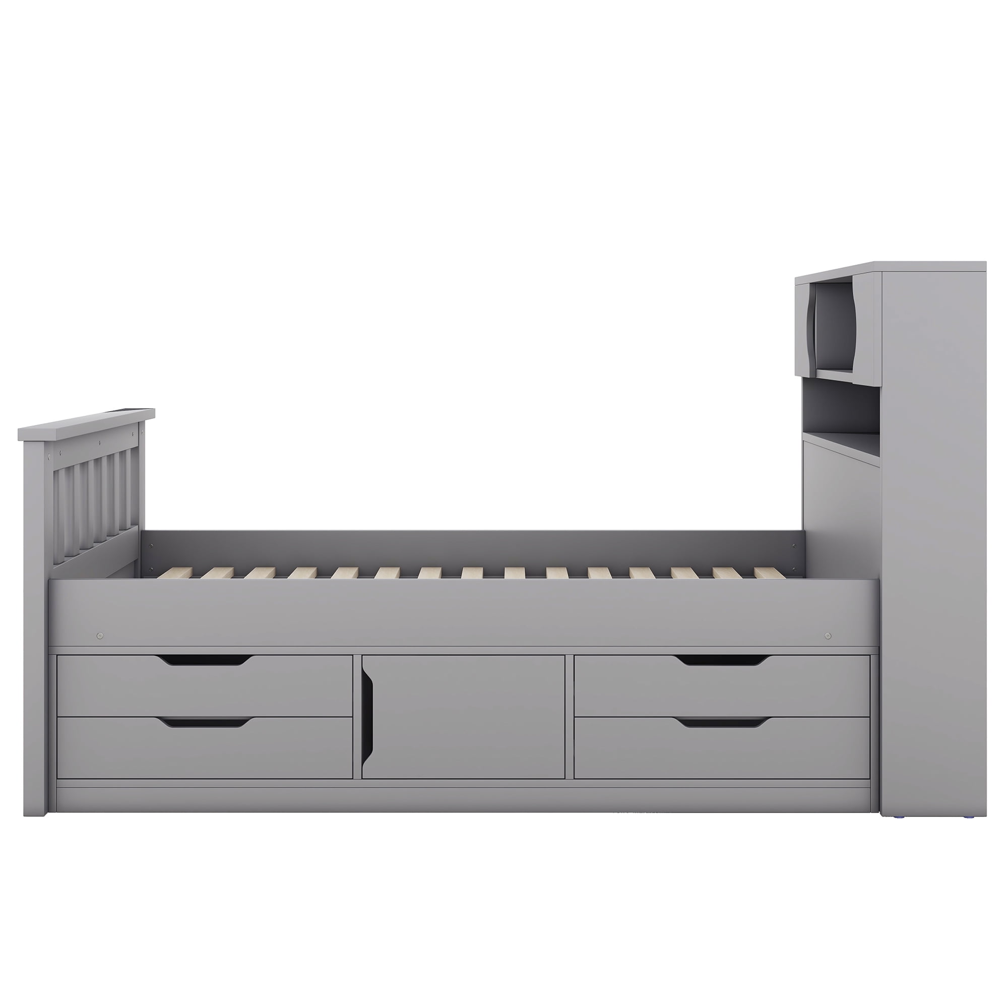 Euroco Wood Twin Size Platform Bed with Storage Headboard, Captain Bed with 4 Drawers, Bookcase and Cabinets, Gray
