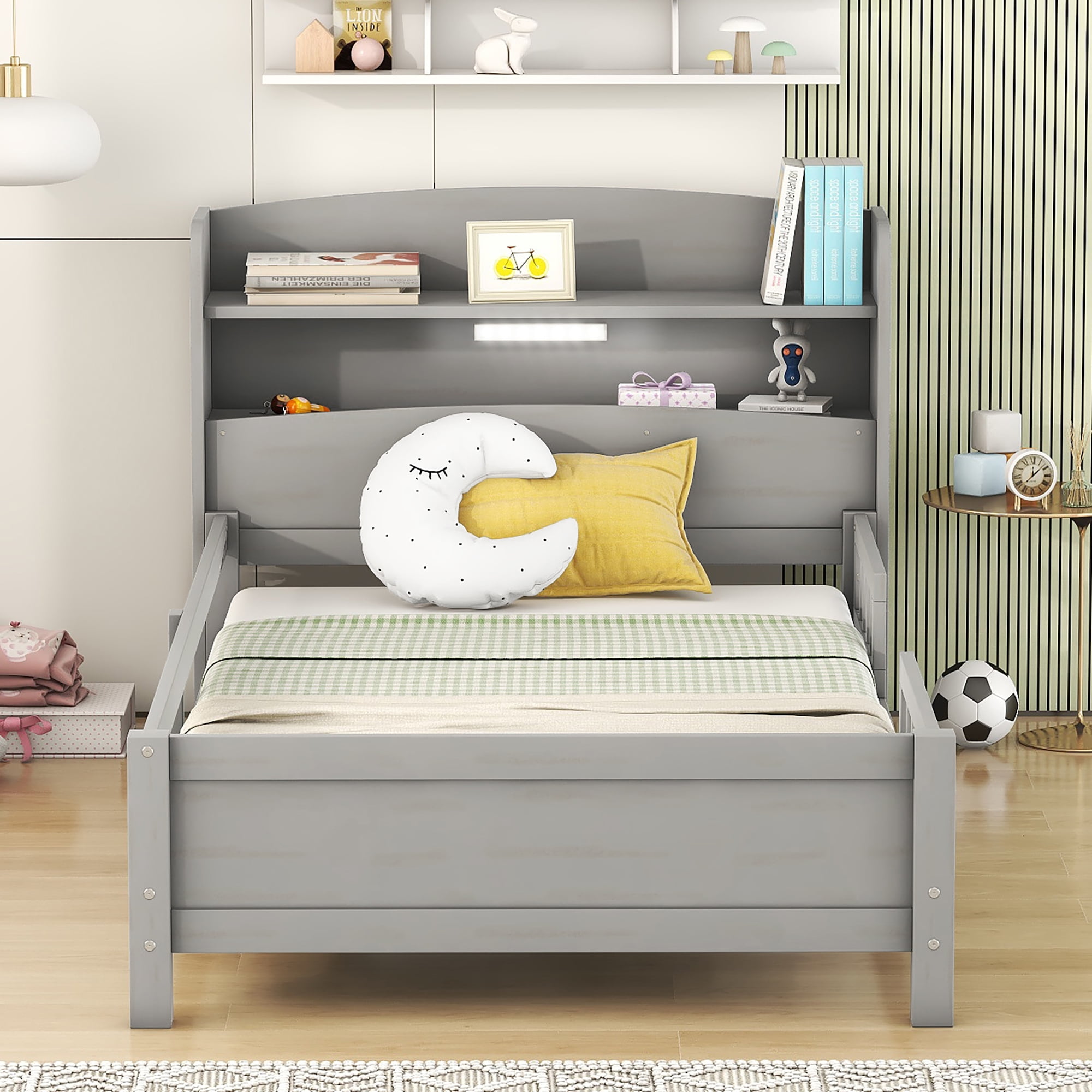 Euroco Wood Twin Size Platform Bed with Storage Headboard, Shelves and LED Light for Kids, Gray