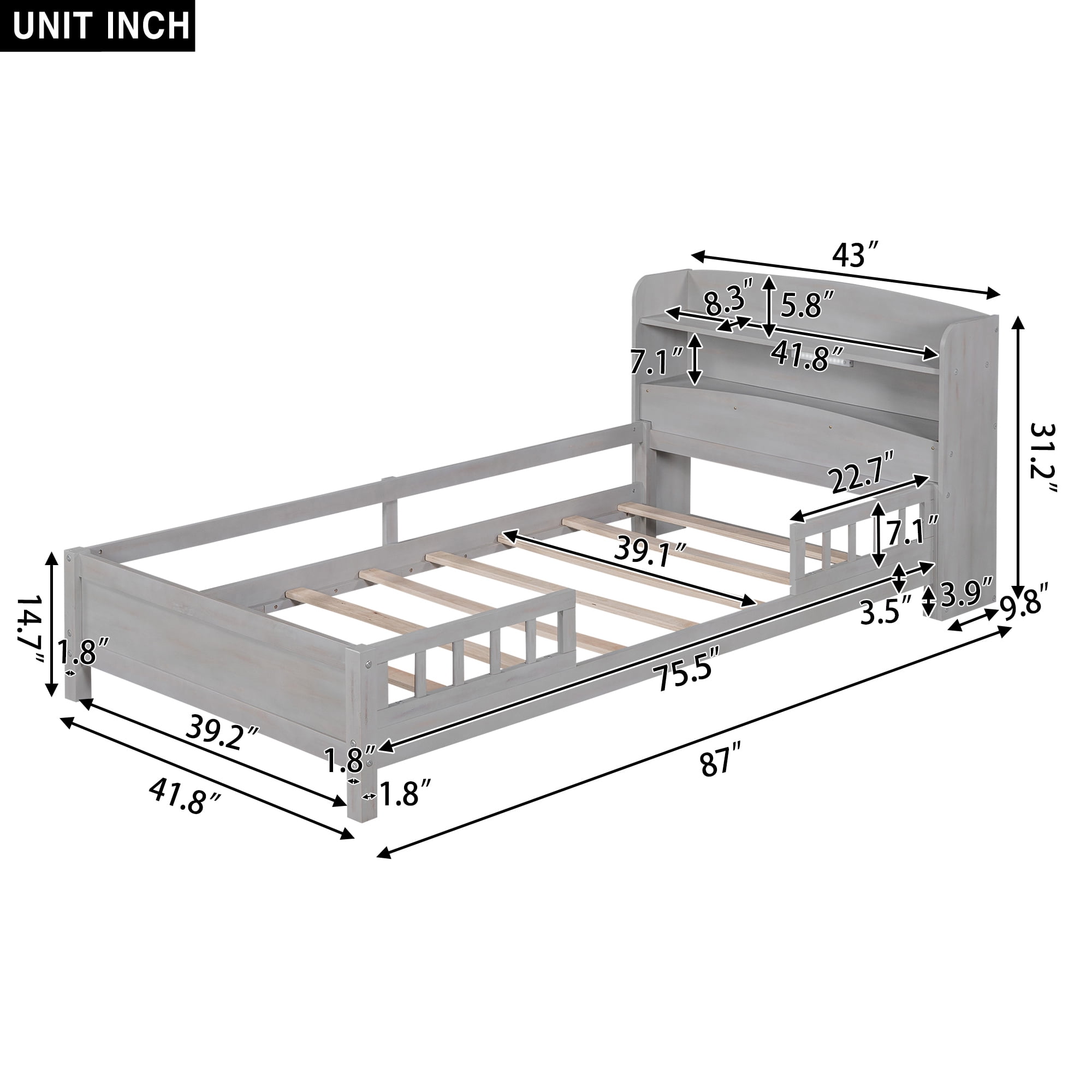 Features: [Storage Headboard]: Storage headboard save more space for kids bedroom. Two tier shelf can be used as a bookcase. You can store books or toys on it to serve more room. [LED Light]: Attached LED lgith will be easy to access. It also can be used as a night light when you reading or sleeping. [Solid Construction]: Made of solid wood, this bed is built to last. The design and color are suitable for any room decorations, thanks to its simple classic design and available in non-toxic, beautiful finishes. [Easy to Assemble]: This expertly crafted piece comes with everything you need to put it together, including all hardware and simple tools to get you from box to bedroom in less time than you’d think. Specification: Bed Dimension: 87”L x 43”W x 31.2”H Inner Size: 77” x 39.1” Overall Product Weight: 70.5lb Bed Weight Capacity: 220lb Mattress Included: No Total Height: 31.2″ Assembly Required: Yes Recommend Bed Mattress Thickness: 6” Storage headboard for book LED light