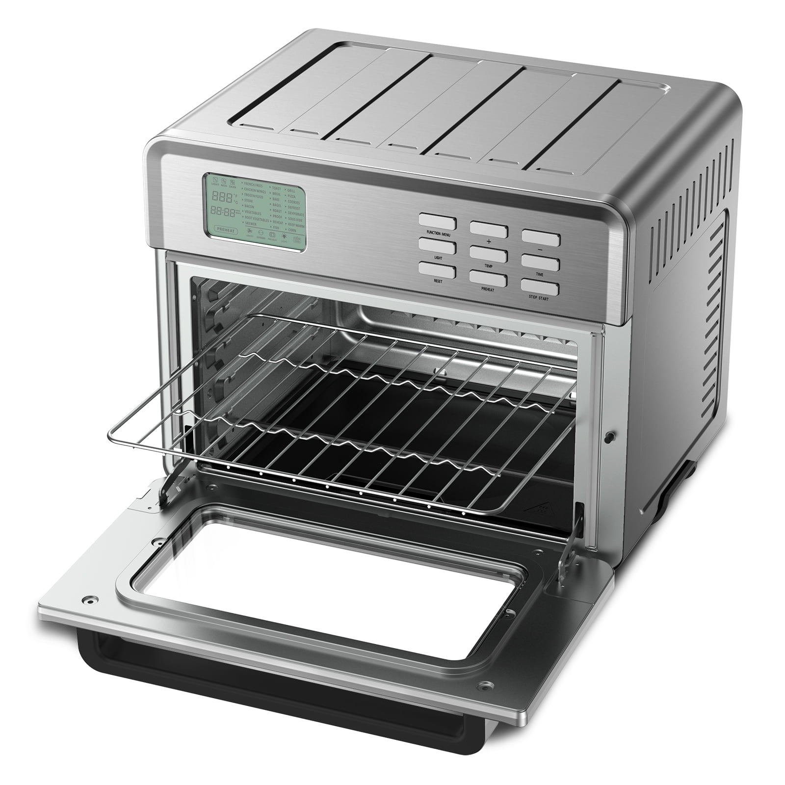 DELICIOUS, FAST, POWERFUL: 360° hot air circulation with 1800W strong power and 4+2 heating elements help you to cook every food evenly, more crispy, golden-fried taste and texture on all sides, no oil required. 24-IN-1 PRESETS: 24 Preset option included French Fries, Chicken Wings, Frozen Food, Steak, Bacon, Vegetables, Root Vegetables, Skewer, Toast, Broil, Bake, Bagel, Roast, Proof, Reheat, Fish, Grill, Pizza, Cookies, Defrost, Dehydrate, Sous Vide, Keep Warm and Corn. PERFECT FOR ANY FAMILY SIZE: 26.8 Quart Capacity, allows you to cook large number of different types of food for your family. EASY TO USE AND CLEAN UP: LCD digital display screen with knobs and buttons, long-press the Light Button around 5s to change the Fahrenheit and Celsius. Stainless steel with nonstick internal wall, easy to clean up after use. EXPAND COOKING OPTION AND RECIPES: Come with accessories including Oven Rack, Dehydrate Tray, Baking Pan, Air Fryer Basket, Built-in Detachable Crumb Tray, cooking recipes, and oven mitts are also included. [TIPS FOR BEST PERFORMANCE] Adjust the temperature and cooking time according to the portion of the food in order to avoid overcooked. Best choice for the holiday gift, house warming, Thanksgiving, Christmas and New Year.