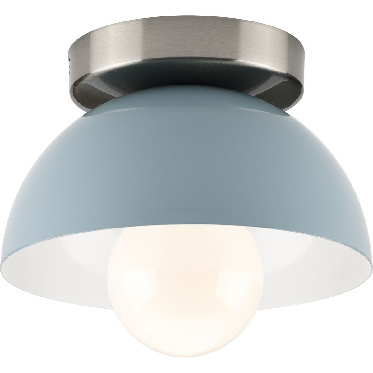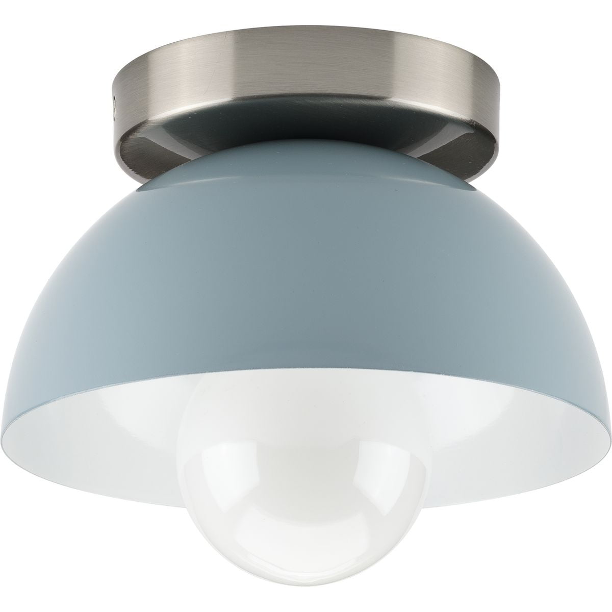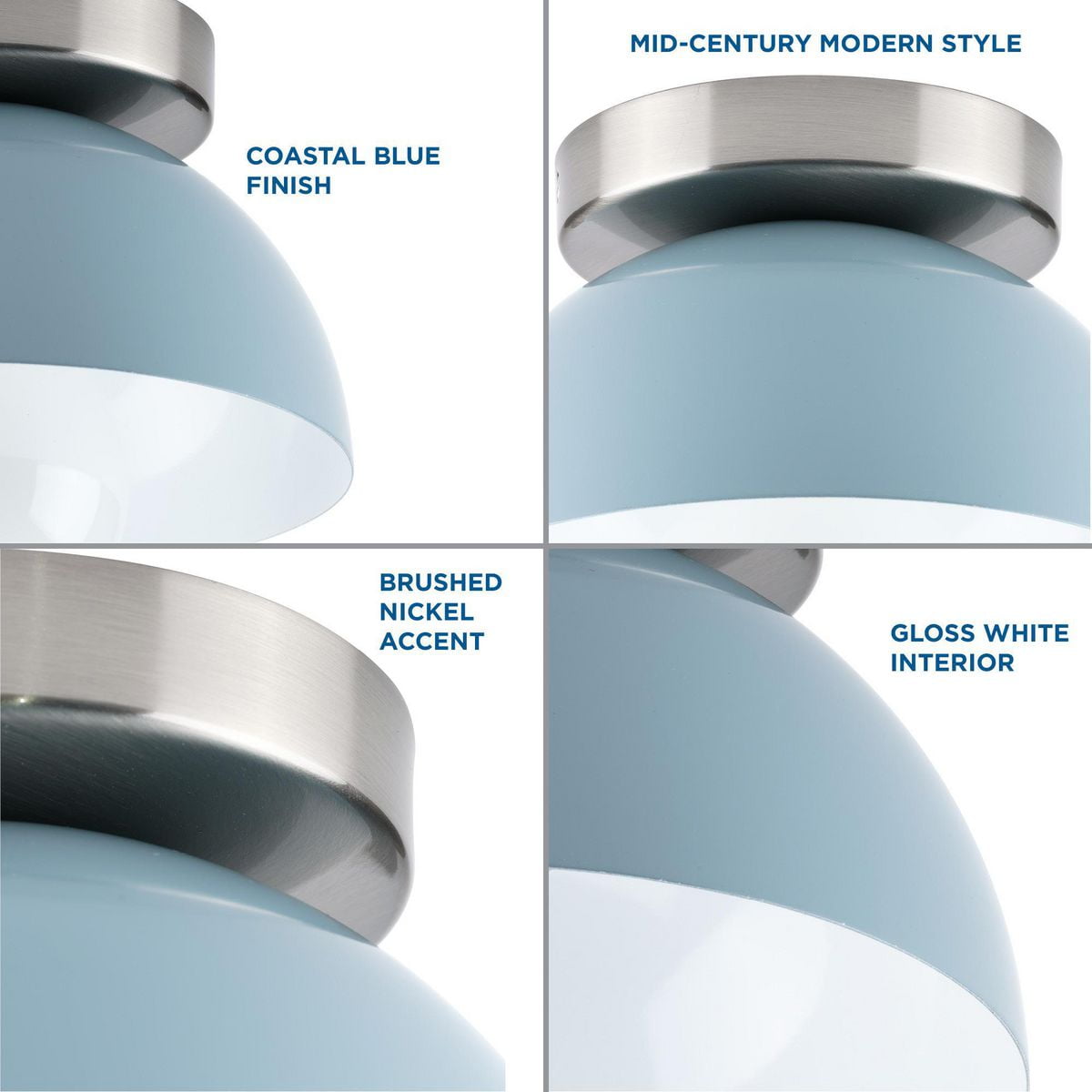 Ideal for a bedroom, hallway, foyer, or kitchen Perfect for mid-century modern style settings Coastal blue shade with beautiful brushed nickel accents Made from steel construction to ensure a long product lifespan Includes installation instructions and mounting hardware Use 1 medium base bulb that is sold separately (60w max – LED/CFL/incandescent), compatible with dimmable bulbs Measures 4-1/2-inch height by 7-3/8-inch diameter Certifications: cCSAus Damp Location Listed Pairs with a variety of lighting fixtures by Progress Lighting Our 1-Year Limited Warranty guarantees your complete satisfaction with your purchase and includes professional after-sales customer service support