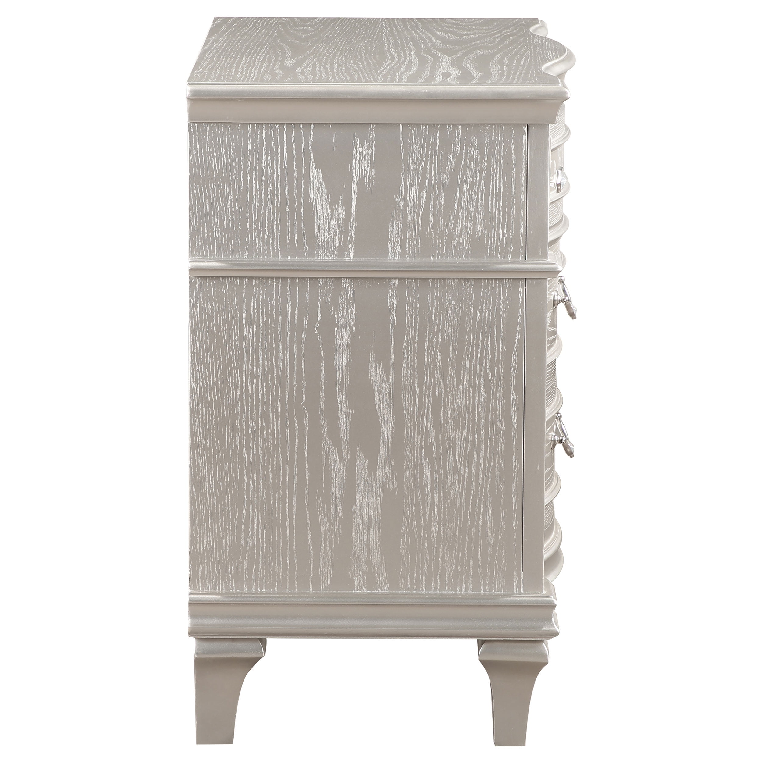 Keep all your bedroom essentials and wardrobe items neatly organized with this glam three-drawer nightstand. A contoured frame design features sparkling side panels flanking the three spacious drawers for a luxurious touch. A silver oak finished wood frame is accented further by modern glam metal knobs and bail handles that help slide each drawer with ease. A soft gray felt-lined top drawer invites you to store more delicate items. A hidden USB outlet creates a convenient charging area for handheld devices.