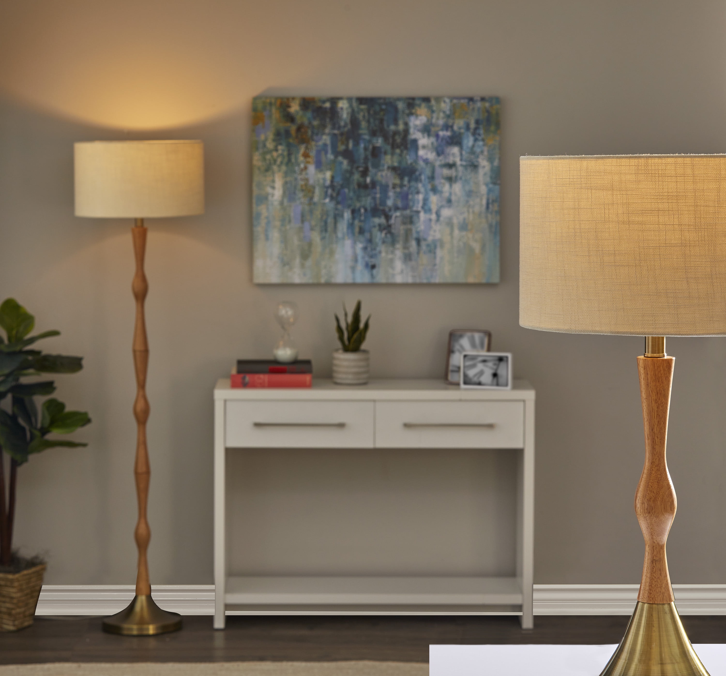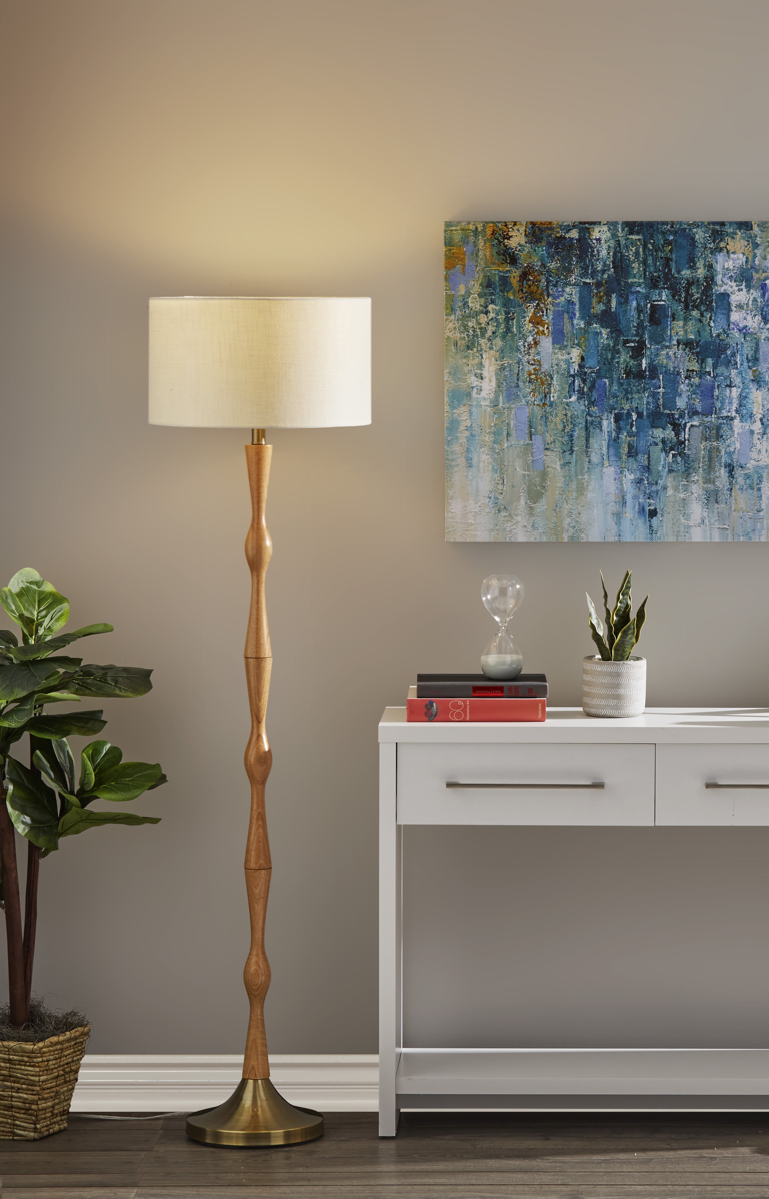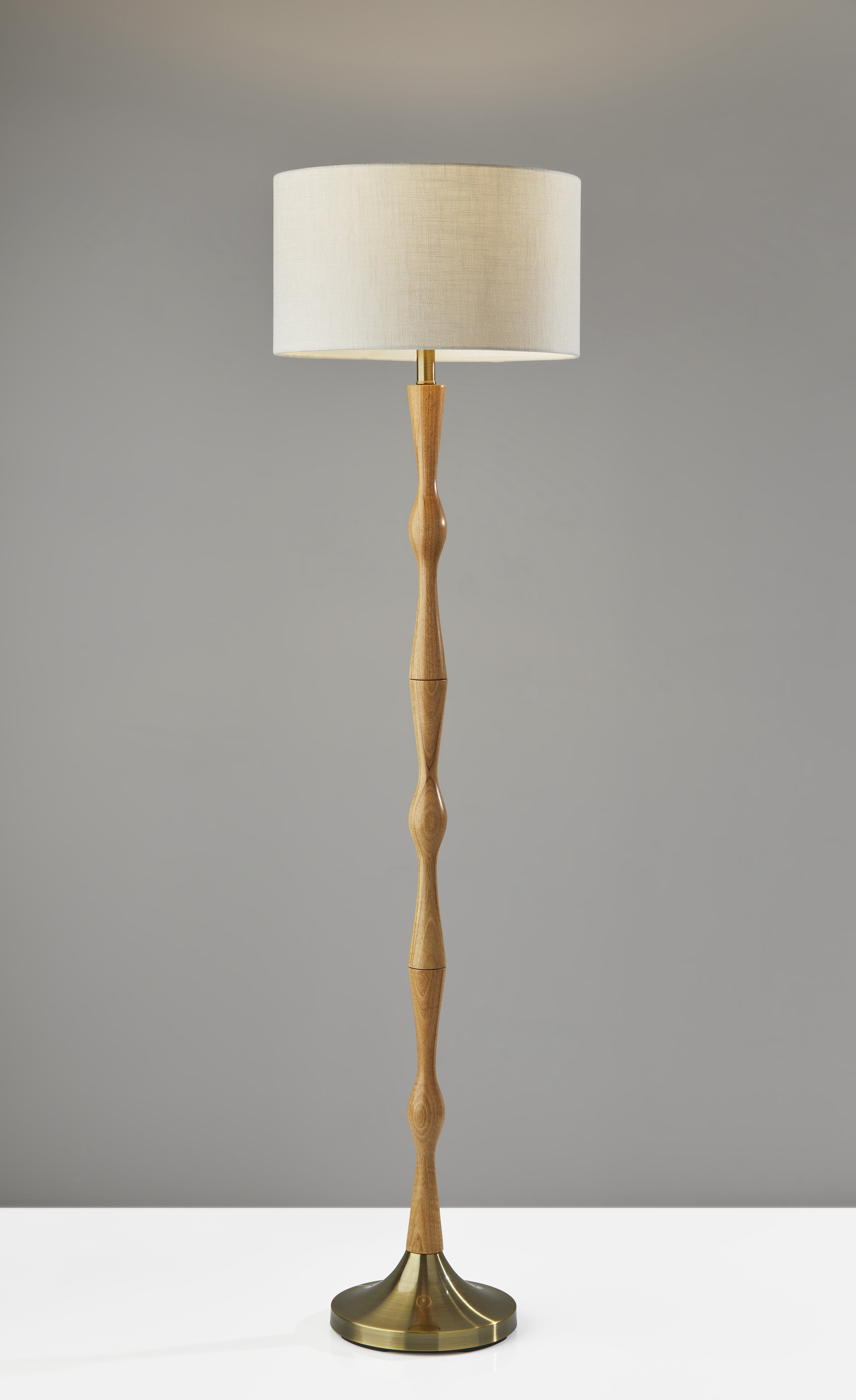 Update your space with a touch of modern bohemian style with the Eve Floor Lamp. The lamp body is made up of a natural oak wood, a durable material that reveals an attractive wood grain. A tapered antique brass metal base provides a decorative accent while also keeping the lamp strong and sturdy. An off-white textured fabric drum shade is the perfect compliment to these soft toned wood and metal materials. A simple on/off switch is located on the socket which is made to house up to 100 Watts.