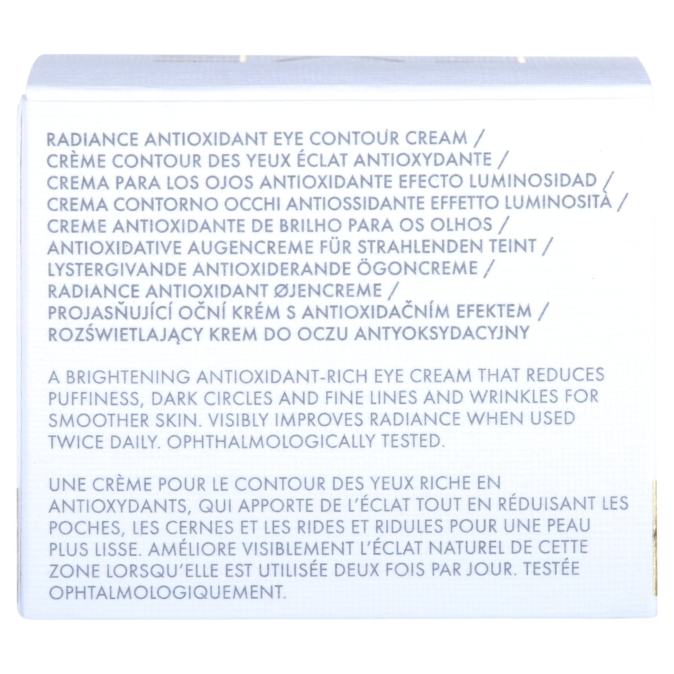 A highly concentrated, yet quickly absorbed formula, the EVE LOM Radiance Antioxidant Eye Cream is the solution for the most common skincare concerns around the delicate eye area. Dark circles, puffiness, and dryness are addressed all in one versatile, nourishing formula.A unique multi-peptide complex helps to illuminate and diminish the appearance of dark circles, while also improving skin tone and restoring firmness. Puffiness is reduced with the aid of Ginseng Blue Plant Extract, which promotes the skin’s oxygenation to achieve an overall balanced and smooth appearance. A 3D Hydration Booster optimizes water circulation to help reinforce the skin’s natural moisture barrier, aiding in the prevention of water loss. External stressors and oxidative damage are combatted with the help of a protective, soothing amino acid derivative.Skin is hydrated for up to 48 hours after use.