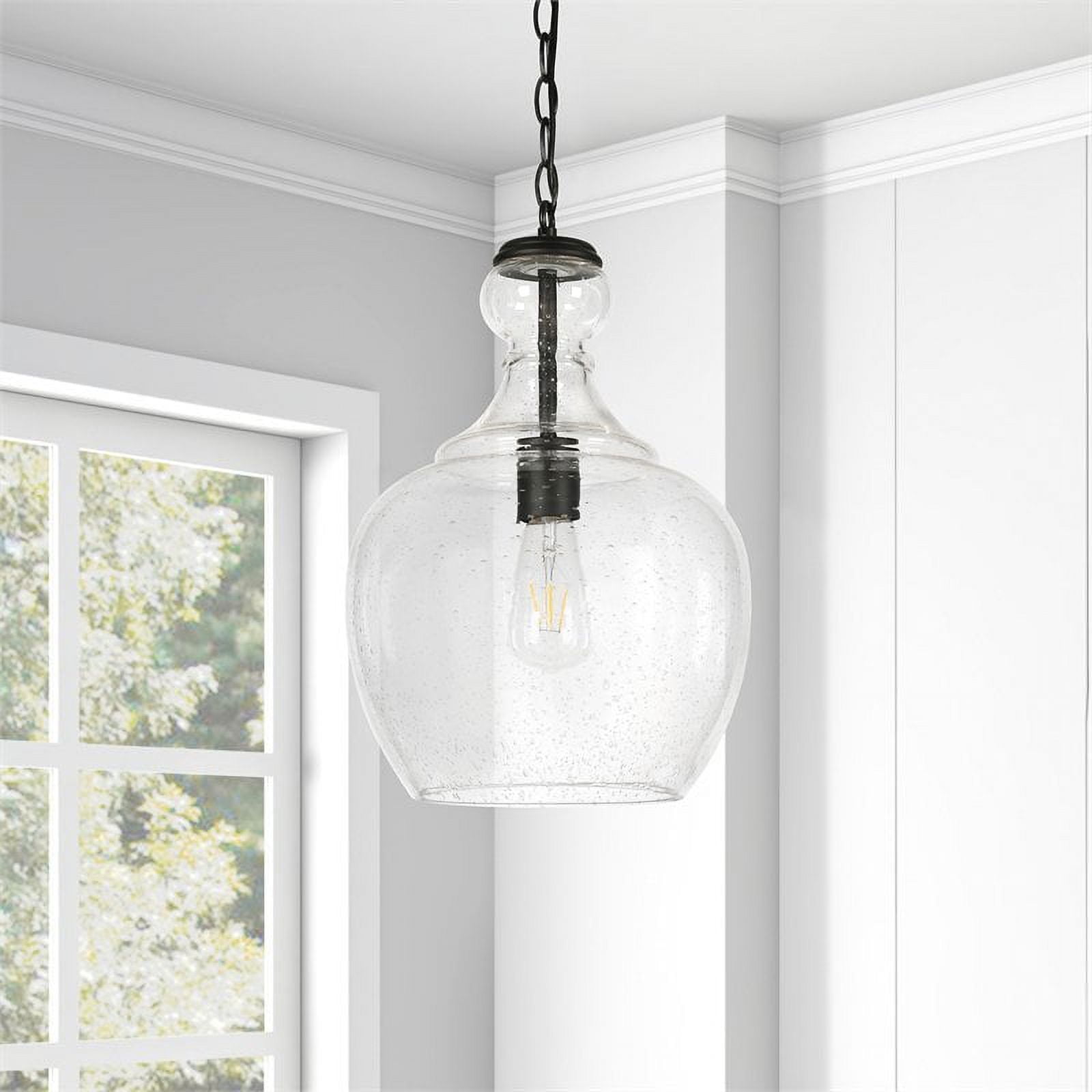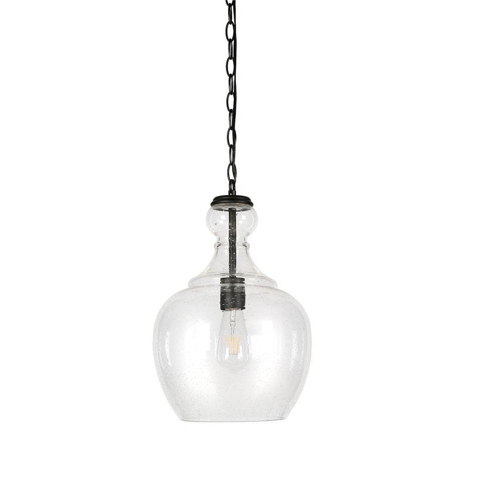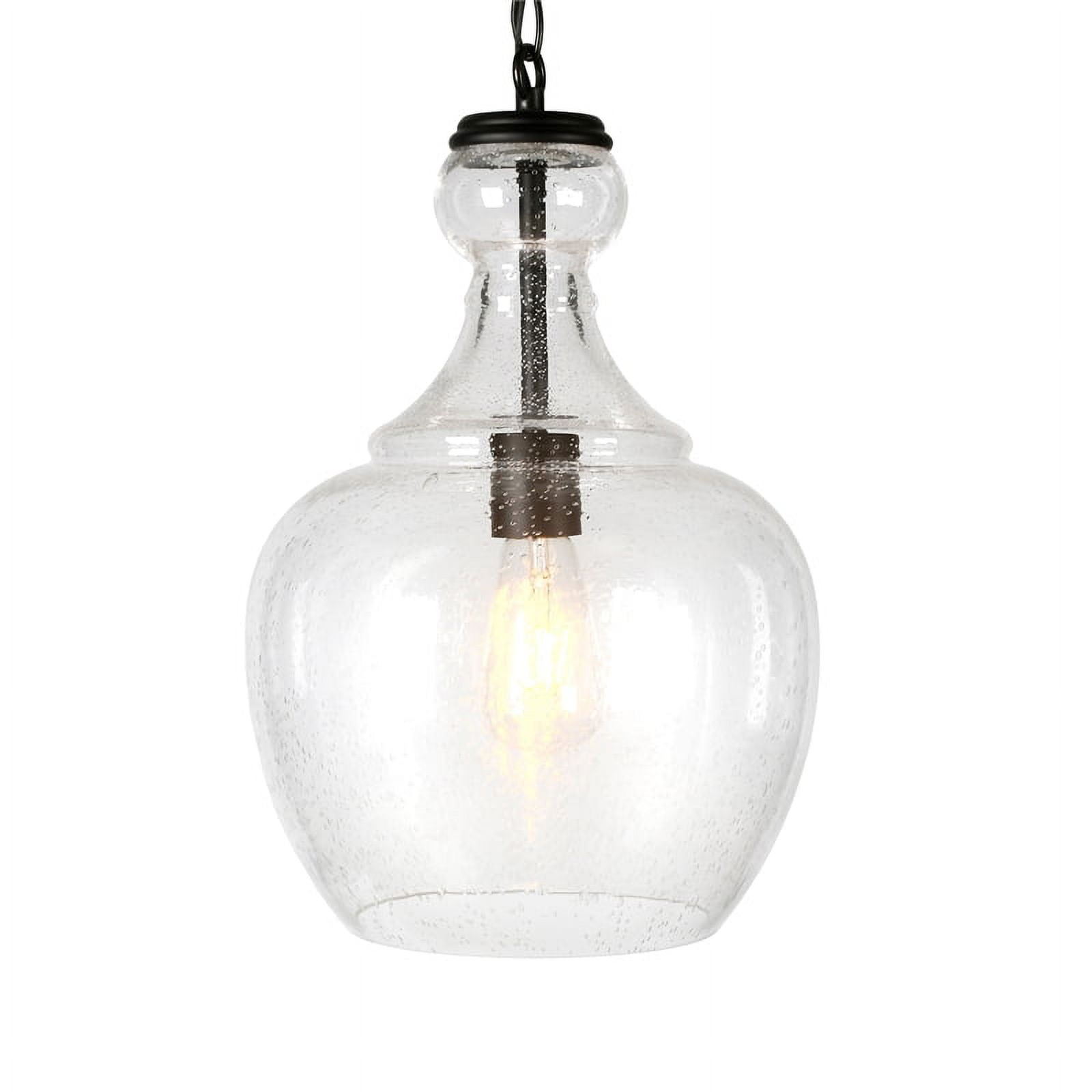 With a style inspired by the industrial revolution but appropriate for a coastal beach cottage, this pendant light is a chic update on a classic look. The domed glass shade is complemented with warm metallic accents that pair effortlessly with your existing color scheme. The hanging chain is fully adjustable to a length of up to 6 feet, allowing you to customize the fixture to your unique space. Features: The base is seeded glass with bronze tones Paired with a domed glass shade. This shade is made from seeded glass. Includes a 6ft cord. Premium materials have been used in the making of this product Specifications: Product Weight: 6.61 lbs Target Audience: Adult (18 Years and Up) Assembly details: Adult Assembly Required, Tools Not Provided Frame Material: Glass