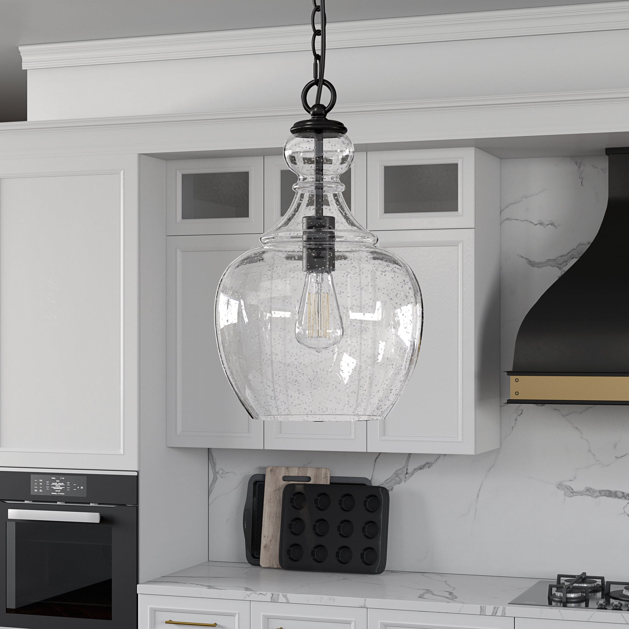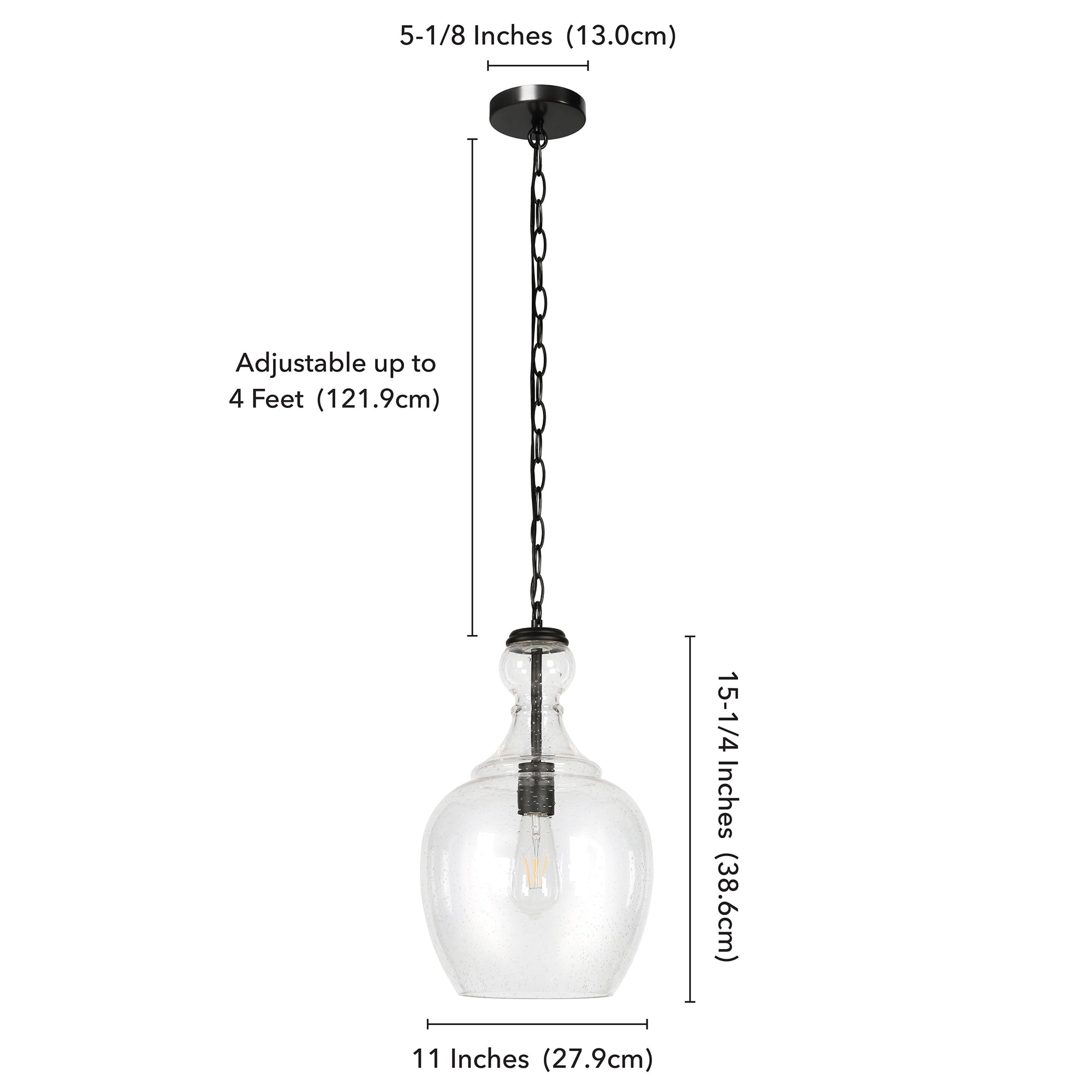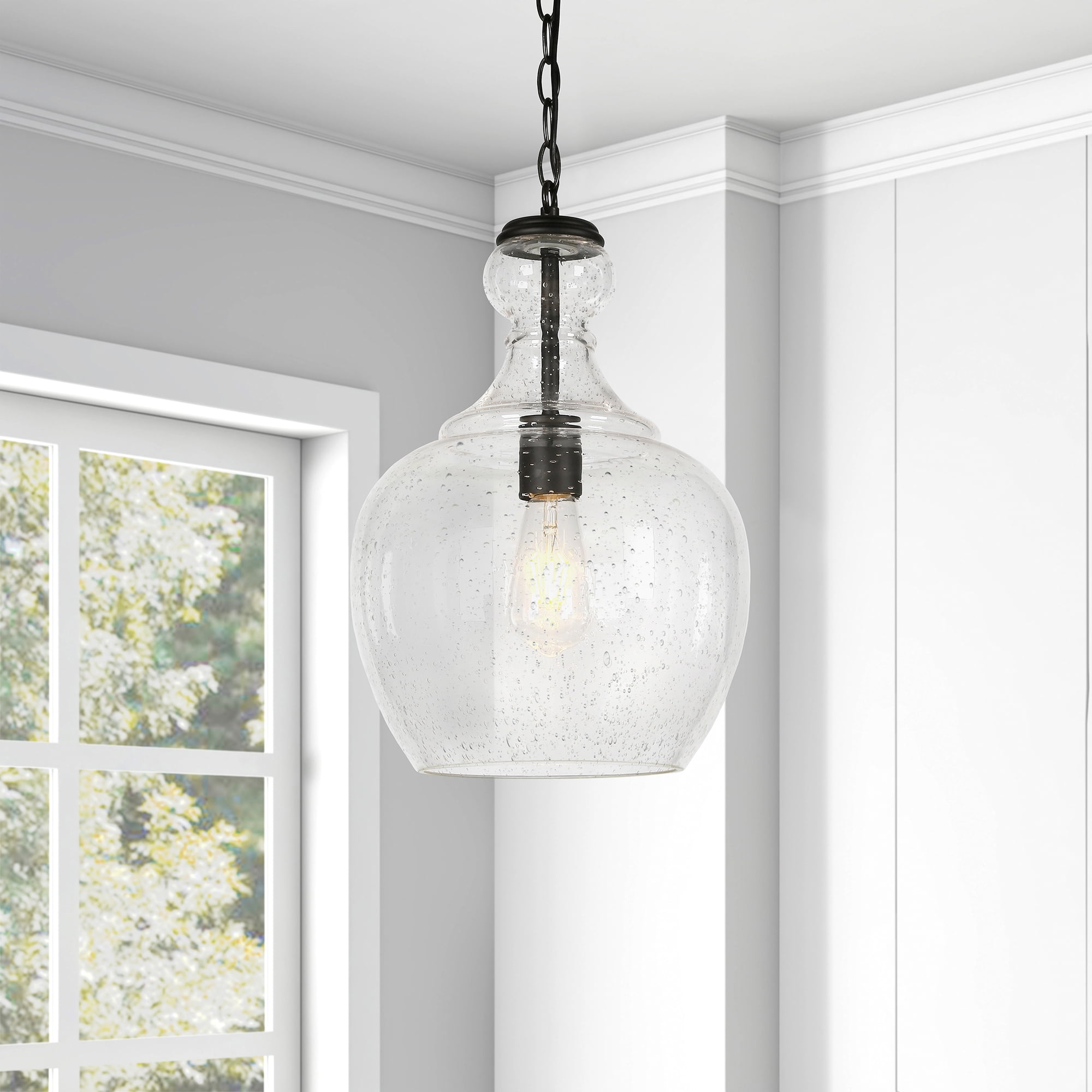 With a style inspired by the industrial revolution but appropriate for a coastal beach cottage, this pendant light is a chic update on a classic look. The domed glass shade is complemented with warm metallic accents that pair effortlessly with your existing color scheme. The hanging chain is fully adjustable to a length of up to 6 feet, allowing you to customize the fixture to your unique space. Features: The base is seeded glass with bronze tones Paired with a domed glass shade. This shade is made from seeded glass. Includes a 6ft cord. Premium materials have been used in the making of this product Specifications: Product Weight: 6.61 lbs Target Audience: Adult (18 Years and Up) Assembly details: Adult Assembly Required, Tools Not Provided Frame Material: Glass