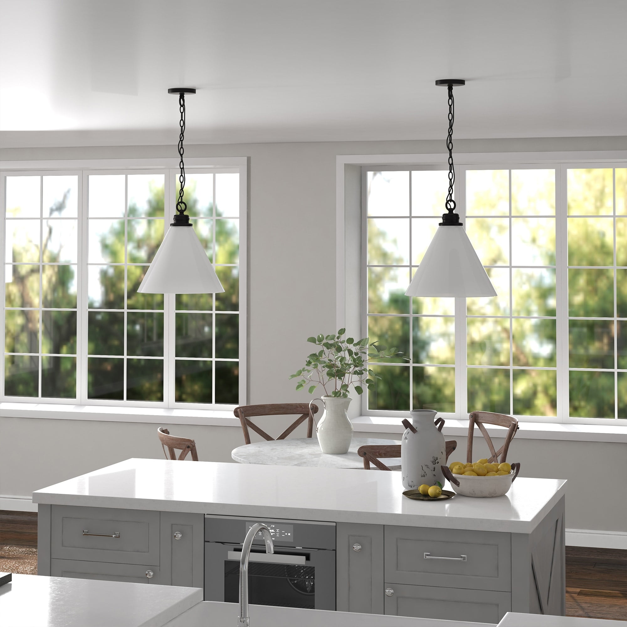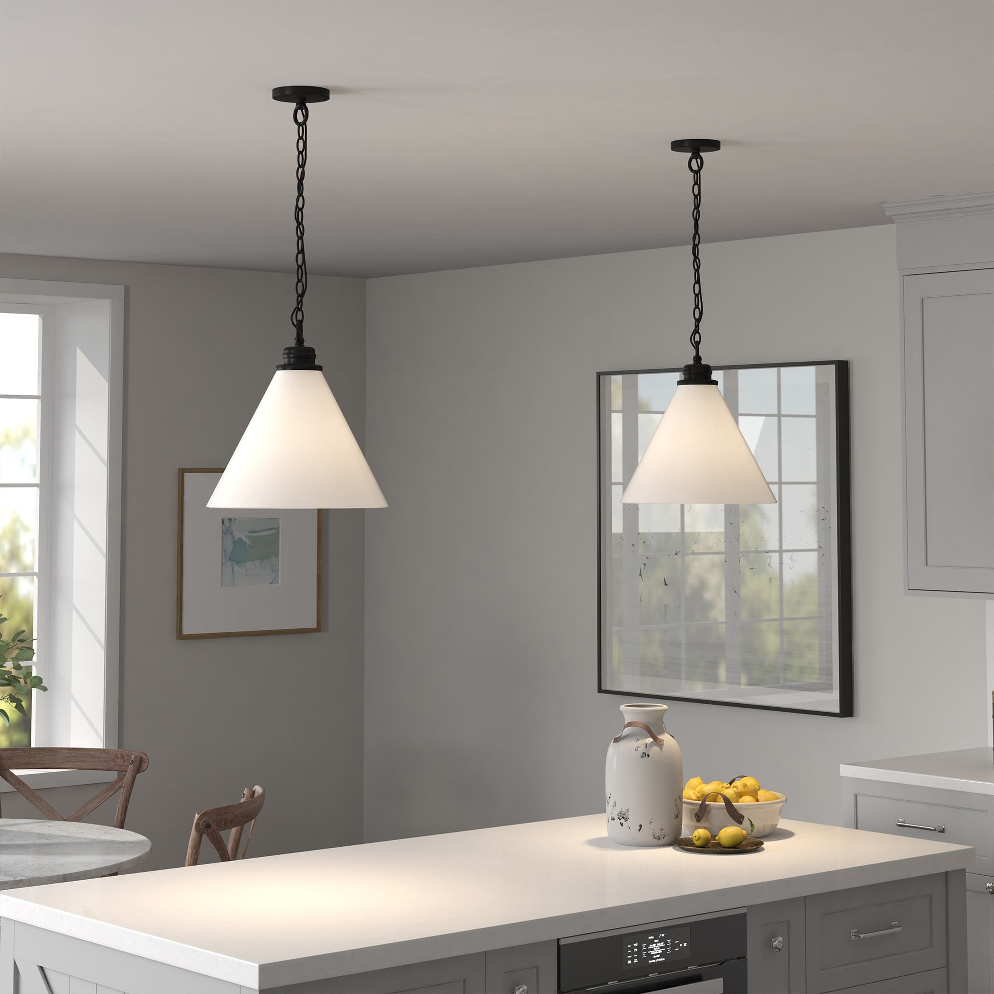 With its classic design and oversized shade, this pendant light is sure to make a statement. Its oversized glass shade and contrasting base make it the perfect addition to your entryway, kitchen or dining area. With an 8′ adjustable cord, it is customizable to fit any space and transition seamlessly into your existing design. Features: Modern and contemporary design for your entryway, foyer, or kitchen. Handcrafted blackened bronze finish is applied to the round metal base. Paired with a white dome glass shade. Rated for one 60W incandescent bulb; 9W LED bulb, 13W fluorescent (CFL) bulb, or 9W self-ballasted LED bulb. E26-base bulb. Bulb not included. Includes an adjustable 8 ft. cord. Compatible with existing dimmer switches and bulbs (not included). Specifications: Product Dimensions: 15″W x 15″D x 12″H Product Weight: 5.51 lbs