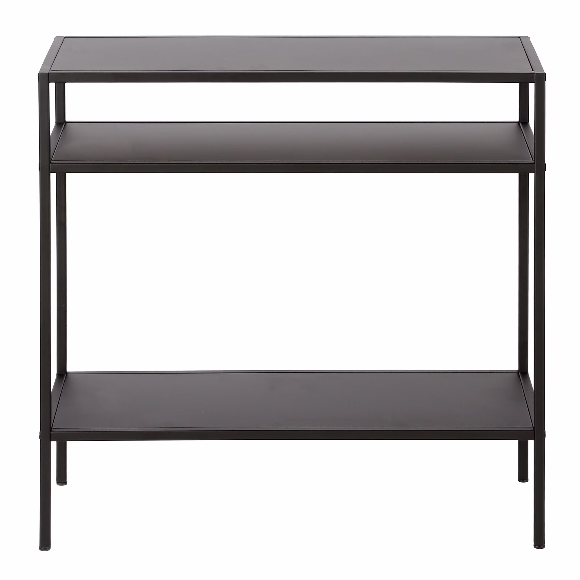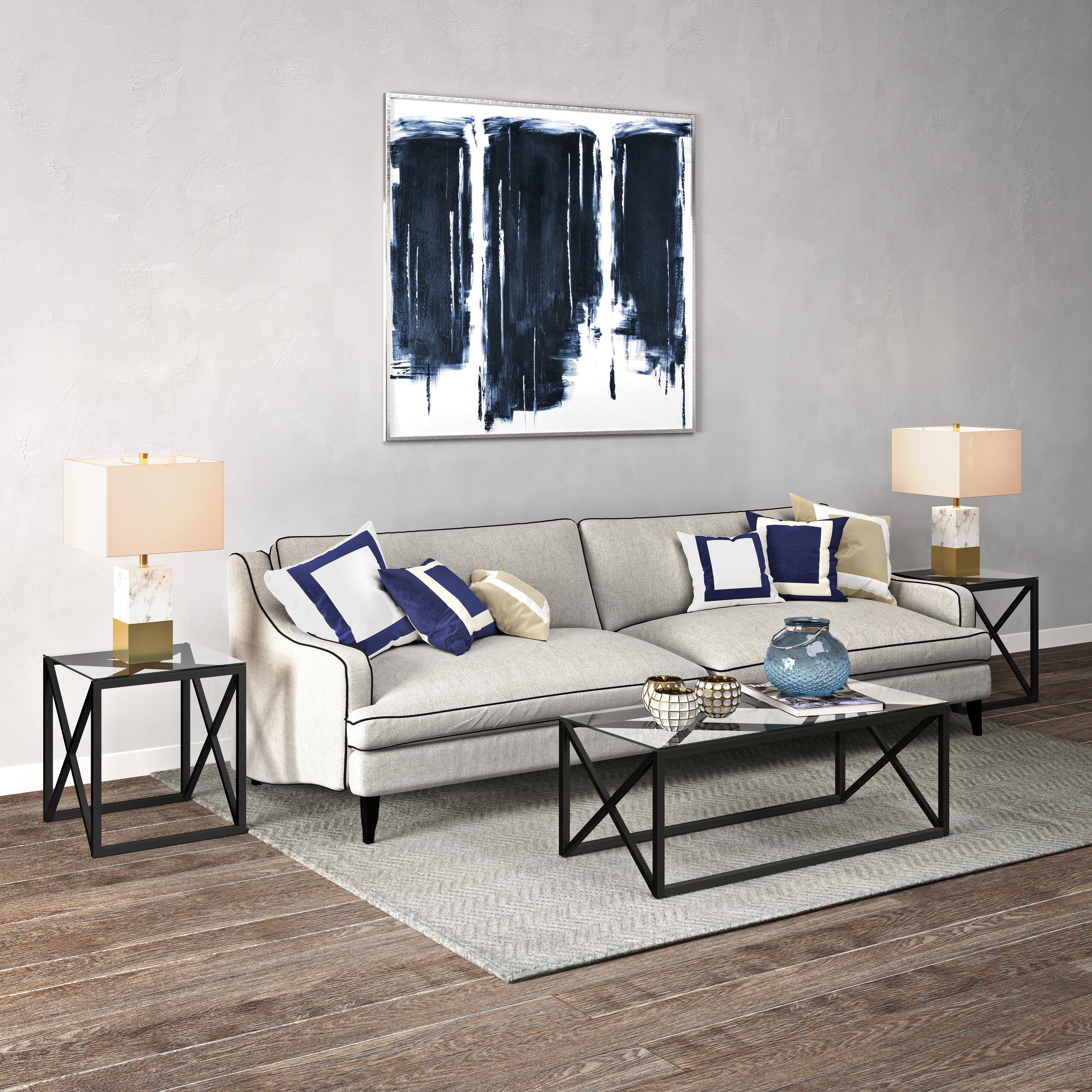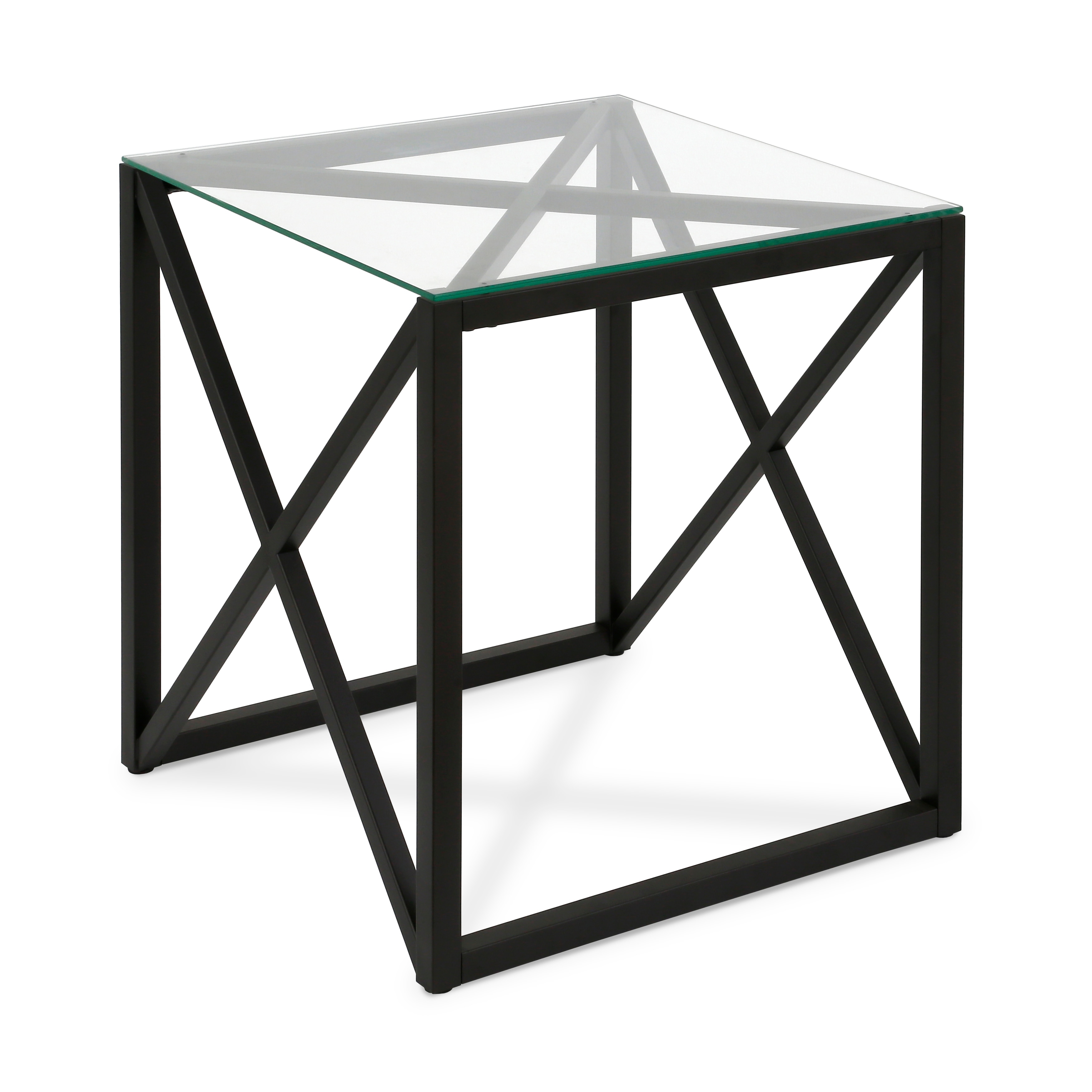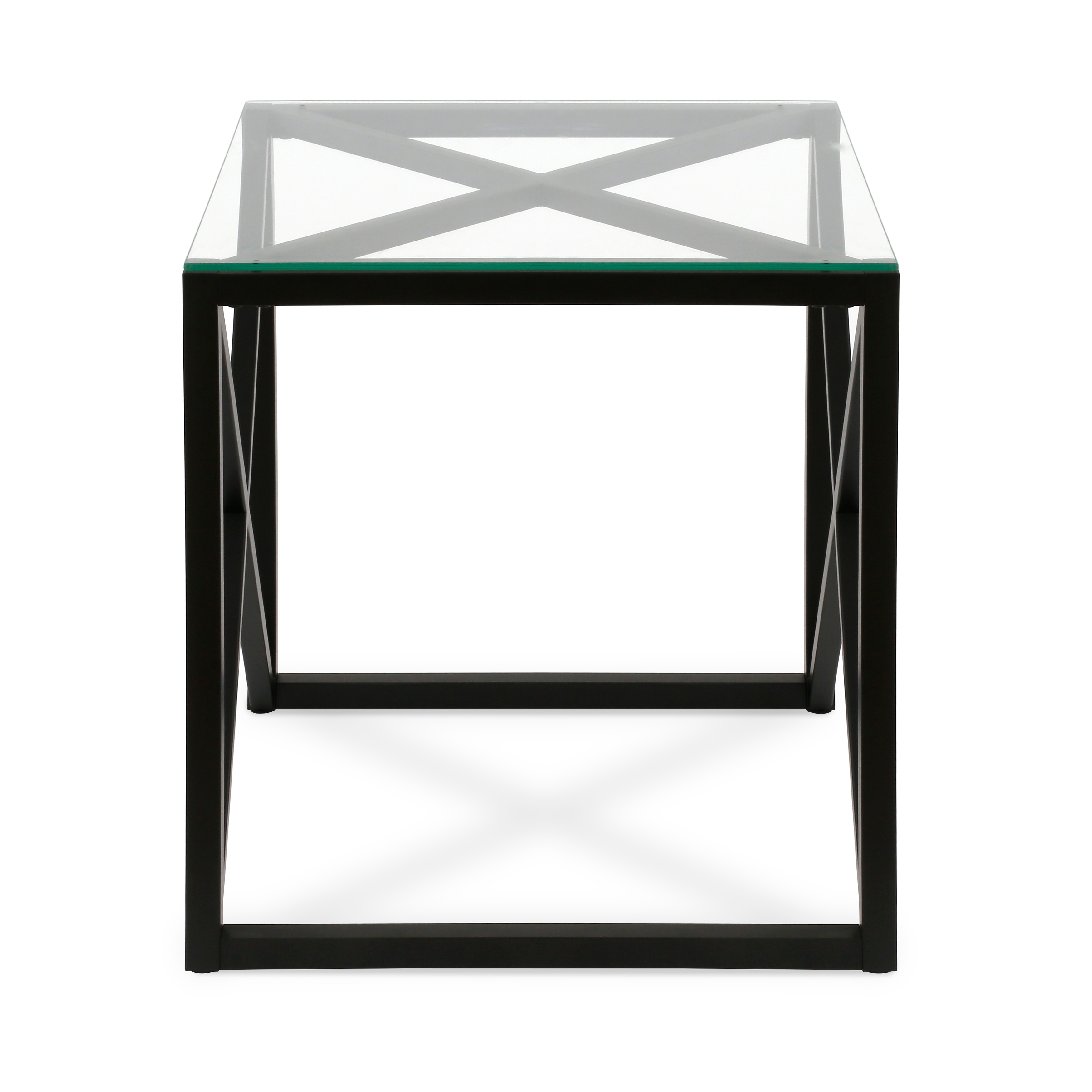 A combination of modern flair with a touch mid-century design will make this glass side table the perfect complement to your bedside or sofa. Geometric X-s in the premium metal frame takes a minimalist table to the next level. The sturdy pedestal legs offer functionality and a sturdy base for your drinks, knickknacks and magazines. Features: Hand crafted blackened bronze finish is applied to the steel frame. Tempered glass top. Clean with a soft, dry cloth; no harsh chemicals or abrasive cleaning materials. Features easy assembly. Weight capacity can support up to 30 LBS. Premium materials have been used in the making of this product Specifications: Product Weight: 23.3 lbs Target Audience: Adult (18 Years and Up) Assembly details: Adult Assembly Required, Tools Not Provided Target Audience: All Ages Frame Material: Metal