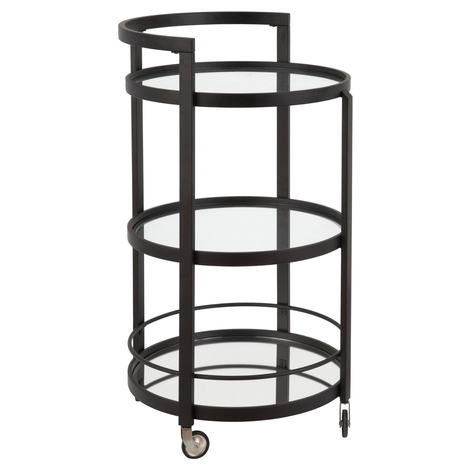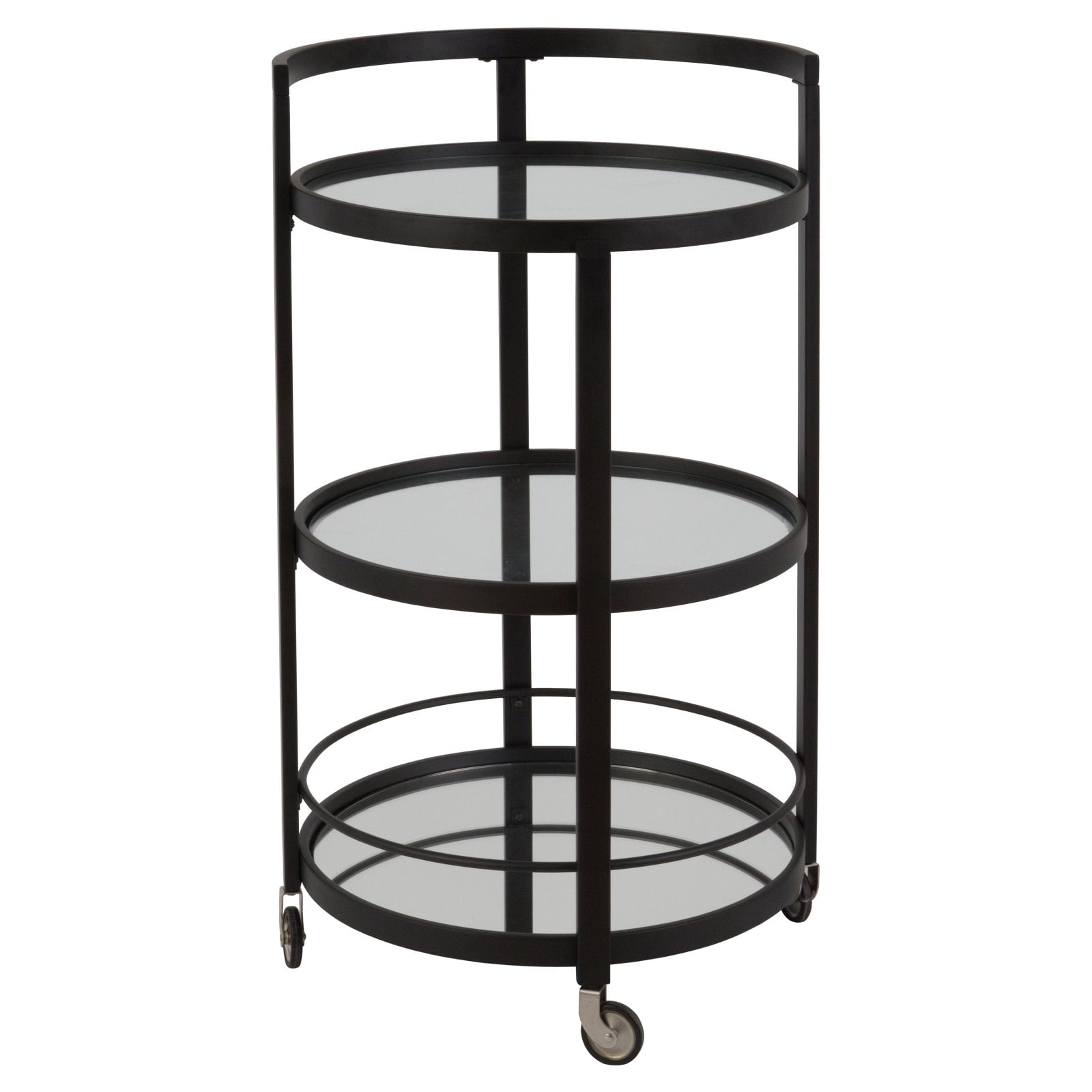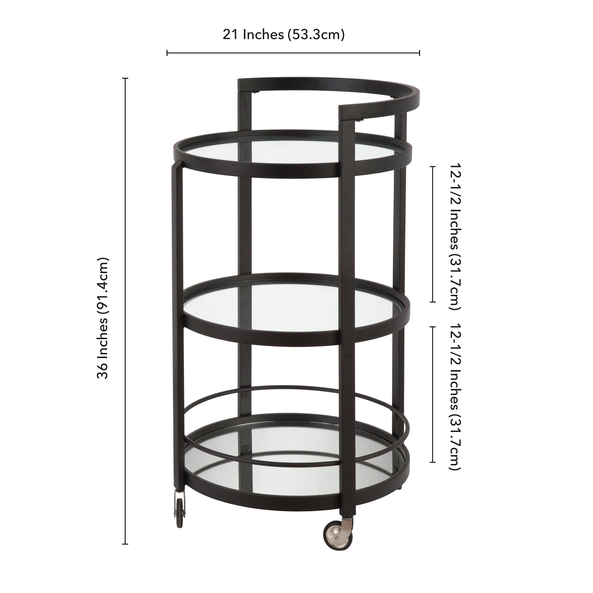Savor the party with this contemporary bar cart. Railings keep your drinks in place, shelves handle mixers and assorted accouterments. Casters keep you on the move or locked in position. Roll with the flow with this serving cart, or mix things up; re-purpose this as a coffee and kitchen accessory center, grab-and-go walk-by closet, or nightstand! Features: Hand crafted Black Bronze finish is applied to the steel frame. Clean with a soft, dry cloth; no harsh chemicals or abrasive cleaning materials. Features easy assembly. Weight capacity can support up to 25 LBS. Premium materials have been used in making this bar cart: tempered mirrored glass throughout the table top and shelves, while a steel frame provides a sleek design and a sturdy base. Specifications: Product Weight: 29.6 lbs Frame Material: Metal