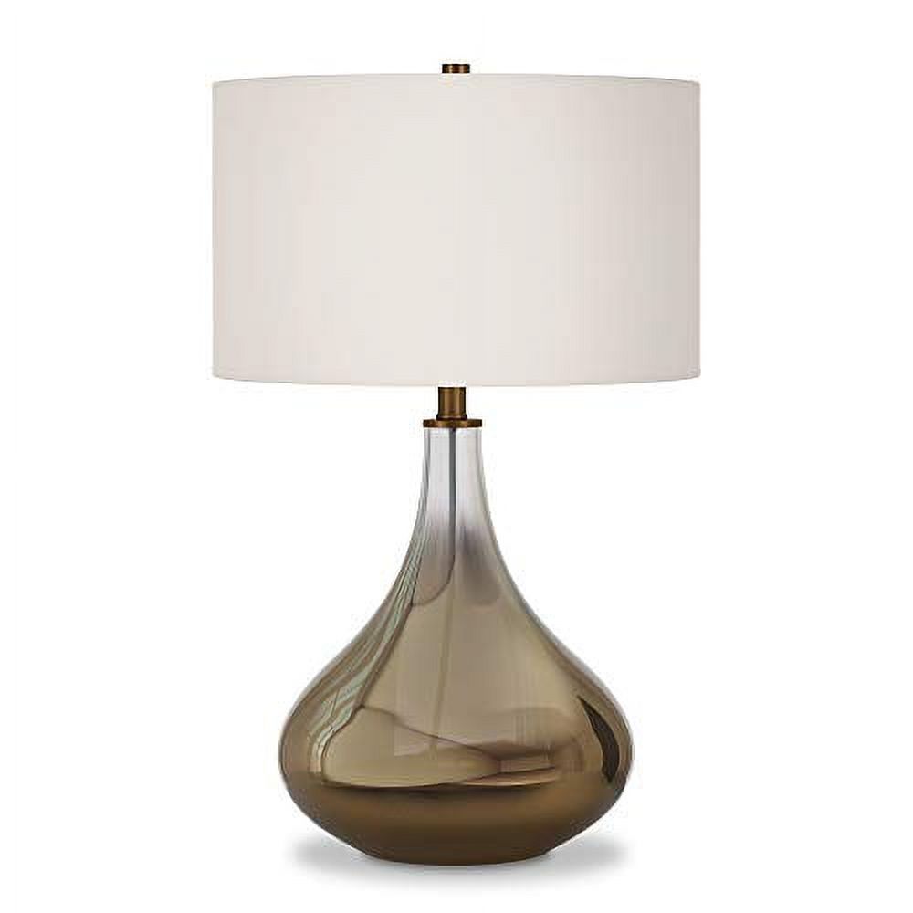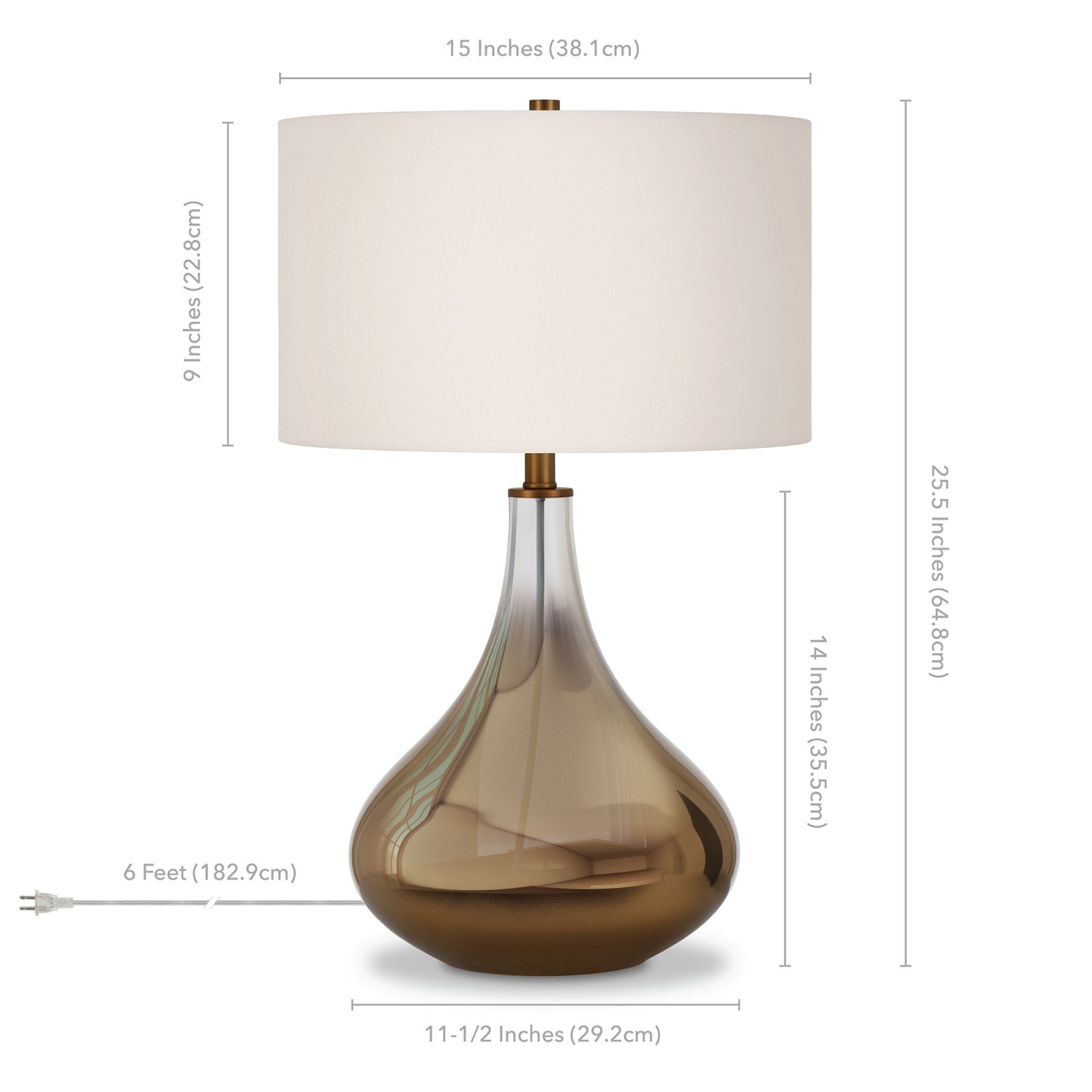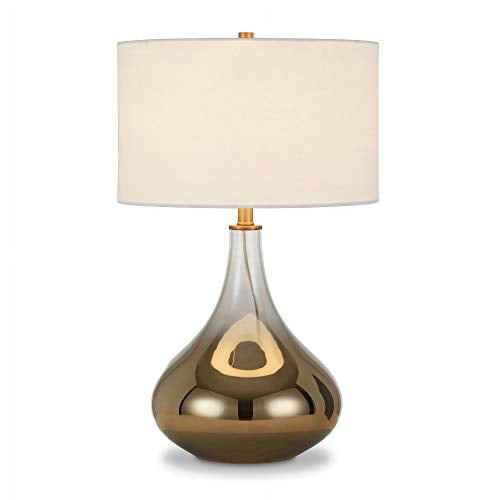 Compatible with smart light bulbs such as Philips Hue, LIFX, IOTTY, TP-Link, Texsens, Flux, Samsung SmartThings, WiZ, and C by GE. Bulb is not included. Uses an E26 base bulb with a max wattage of 60 watts. E26 is considered the standard, basic light bulb. And the lamp is compatible with energy efficient LED bulbs effectively putting out much more light per watt. Ideal use for bedroom lamp, nightstand lamp, kid’s room lamp, living room lamp, dining room lamp, reading lamp, living room lamp, office lamp, task lamp, table lamp, dorm room lamp, buffet table lamp, side table lamp, etc. Premium materials have been used making this lamp: linen in the shade, glass in the frame and base, UL certified wiring components. including durable glass in smoked chrome ombre, a white linen shade, and long-lasting UL certified wiring components for safety. Features versatile design, chic design inspired by mid-century modern designers, it can easily transform into a contemporary lamp, clean line lamp, mid-century modern lamp, modern design lamp, urban modern lamp, transitional lamp, modern farmhouse lamp, industrial lamp, minimalist lamp, Scandinavian lamp, traditional lamp, Hollywood Glam Lamp, Coastal lamp, Hollywood Regency lamp, eclectic lamp, modern country lamp, Art Deco lamp, Asian Zen lamp, Feng Shui lamp, chic lamp. The ombre finish starts in a striking golden bronze tone at the top of the glass base, with the gradient fading to clear glass towards the base creating depth and visual interest. The shade is in a crisp chiffon white color and is made of 100% linen with polystyrene lining for durability. Rated for one 60W incandescent bulb; 9W LED bulb, 13W fluorescent (CFL) bulb, or 9W self-ballasted LED bulb. E26-base bulb. Includes a 6 ft. cord. Clean with a soft, dry cloth; no harsh chemicals or abrasive cleaning materials.
