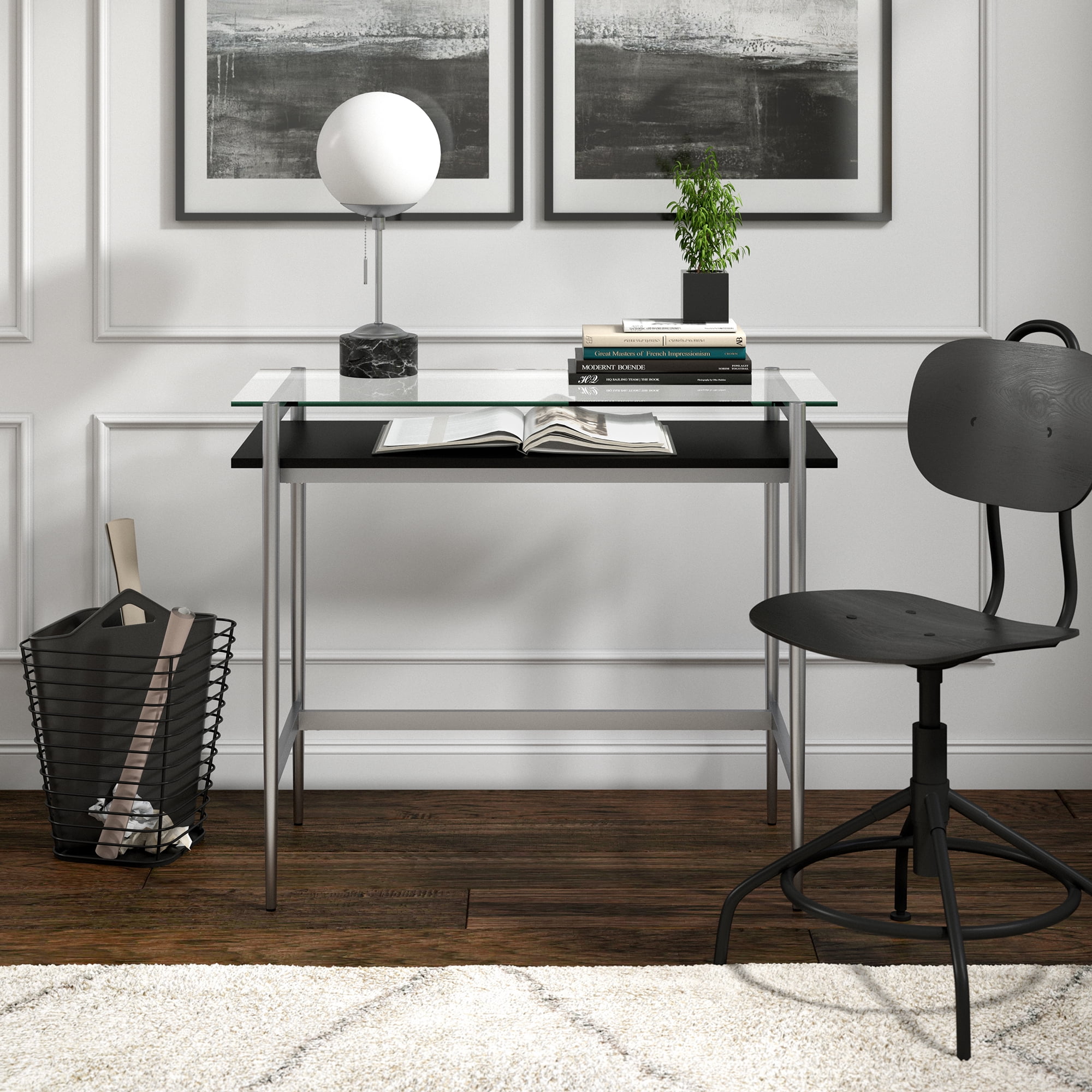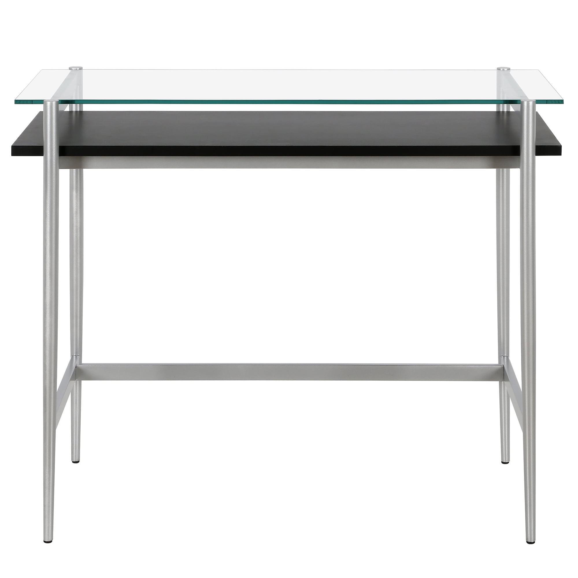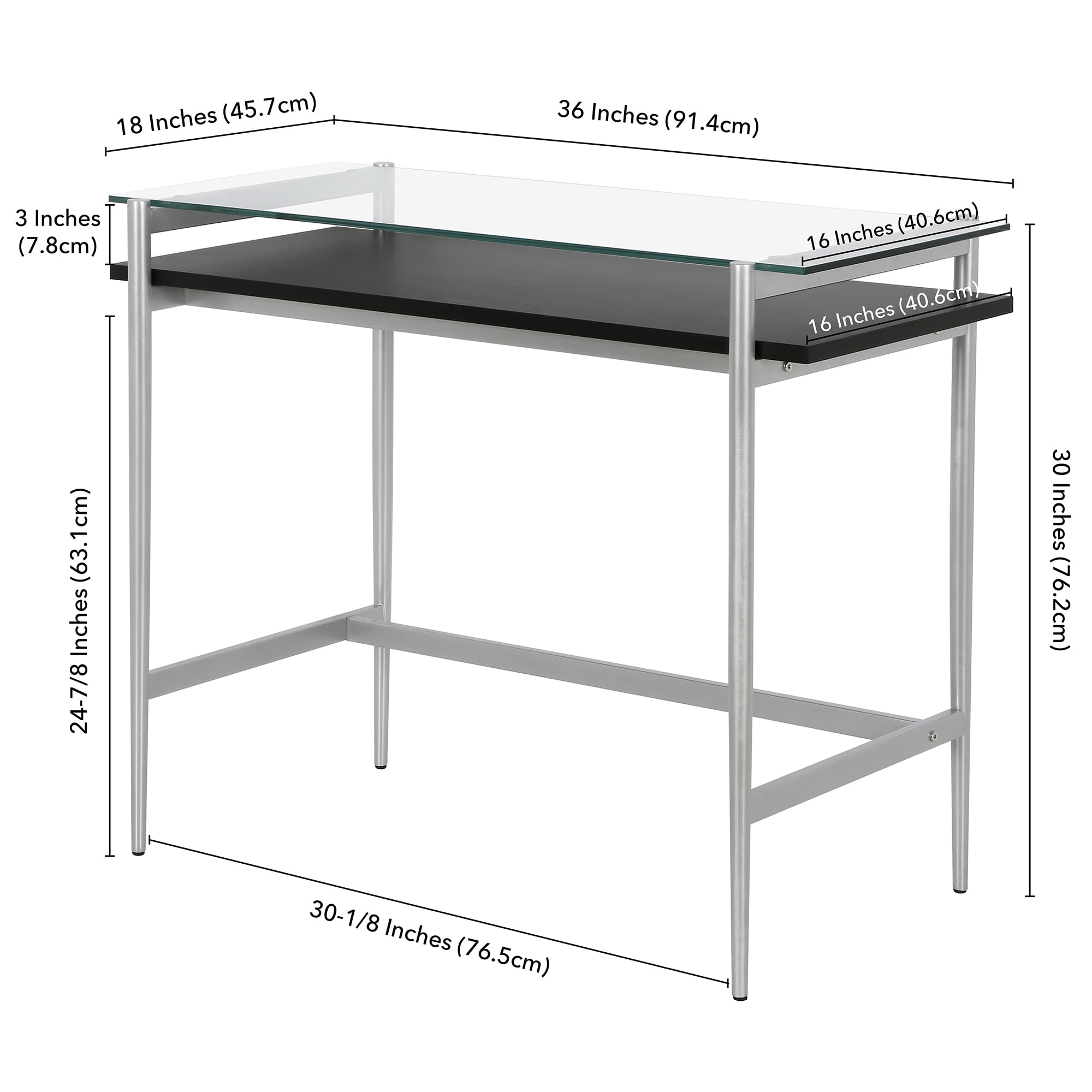 Work from home in mid-century style with this modern desk. The sleek lines of its steel frame are offset by a sturdy tempered glass top, allowing you a clear view to the woodgrained shelf below. Its open lower space provides plenty of room to settle in and take on the day. Go contemporary in blackened bronze or glam in golden brass or silver to elevate your home office, game room, or vanity area. Features: Hand crafted silver finish is applied to the steel frame. Features a durable tempered glass top and black woodgrain shelf. The desktop has a weight capacity of 35 lbs. while the lower shelf can support 15 lbs. Desk features open lower space with wraparound crossbar. Features easy assembly. Clean with a soft, dry cloth; no harsh chemicals or abrasive cleaning materials. Specifications: Product Dimensions: 36″W x 18″D x 30″H Assembly details: Adult Assembly Required, Tools Not Provided Furniture Subtype: Writing Desks Product Weight: 35.7 lbs