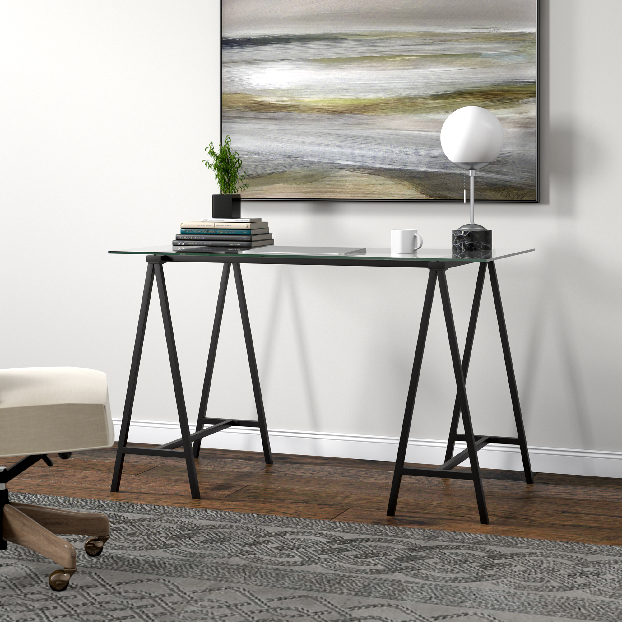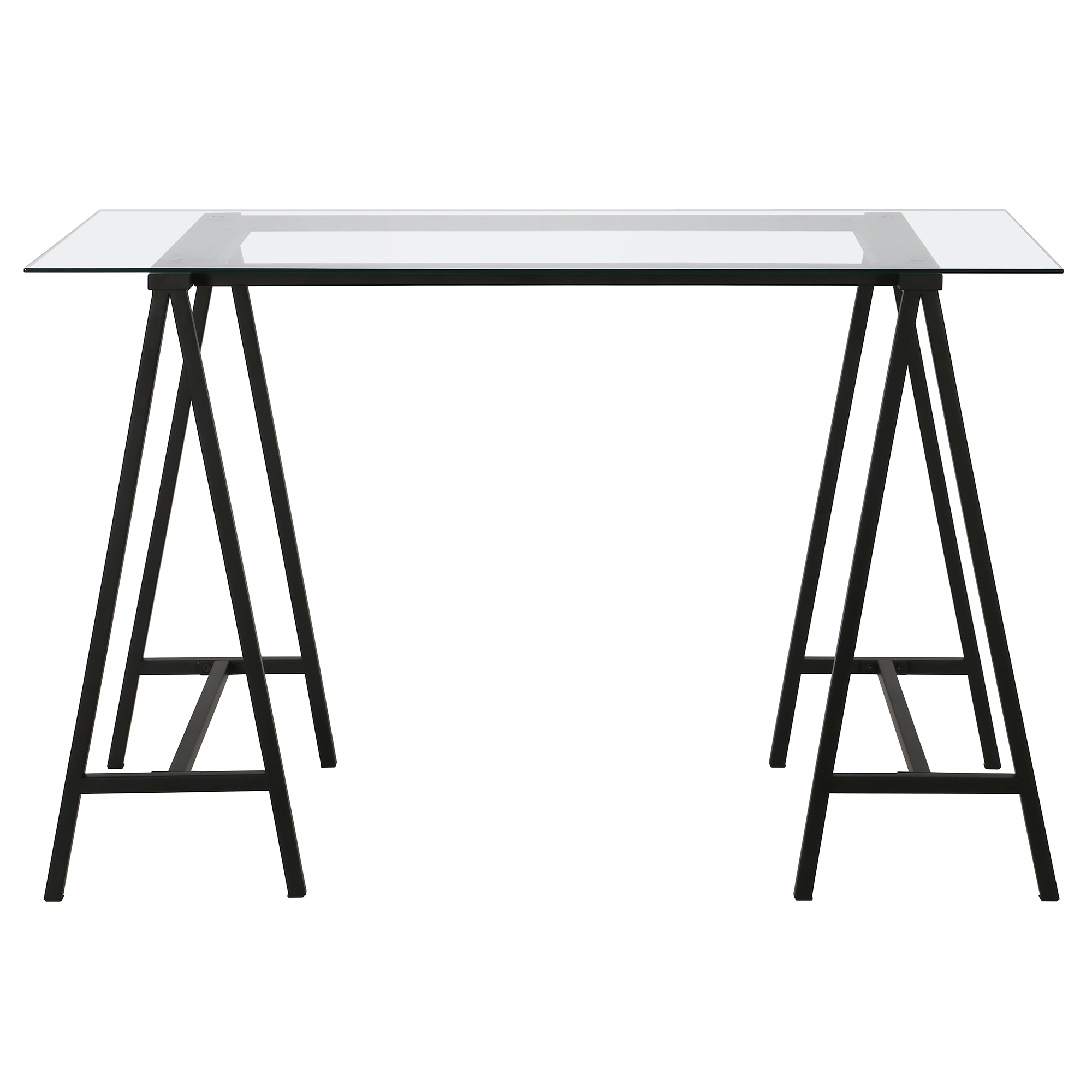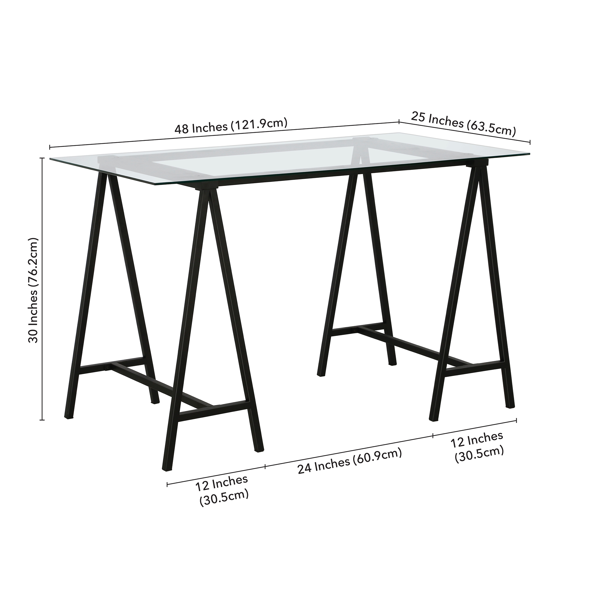 With a modern A-frame design, this desk offers a new transitional piece for you to work from home in luxury. Feel inspired by its sawhorse table design, while working on the open canvas of its tempered glass top. The sleek and simple lines of this desk offer a new element of design for your office, sure to spark creativity. Features: Handcrafted blackened bronze finish applied to the steel frame. Desktop is made of sturdy tempered glass. Tabletop has a weight capacity of 40 lbs. Clean with a soft, dry cloth; no harsh chemicals or abrasive cleaning materials. Features easy assembly. Specifications: Product Dimensions: 48″W x 25″D x 30″H Product Weight: 49.6 lbs