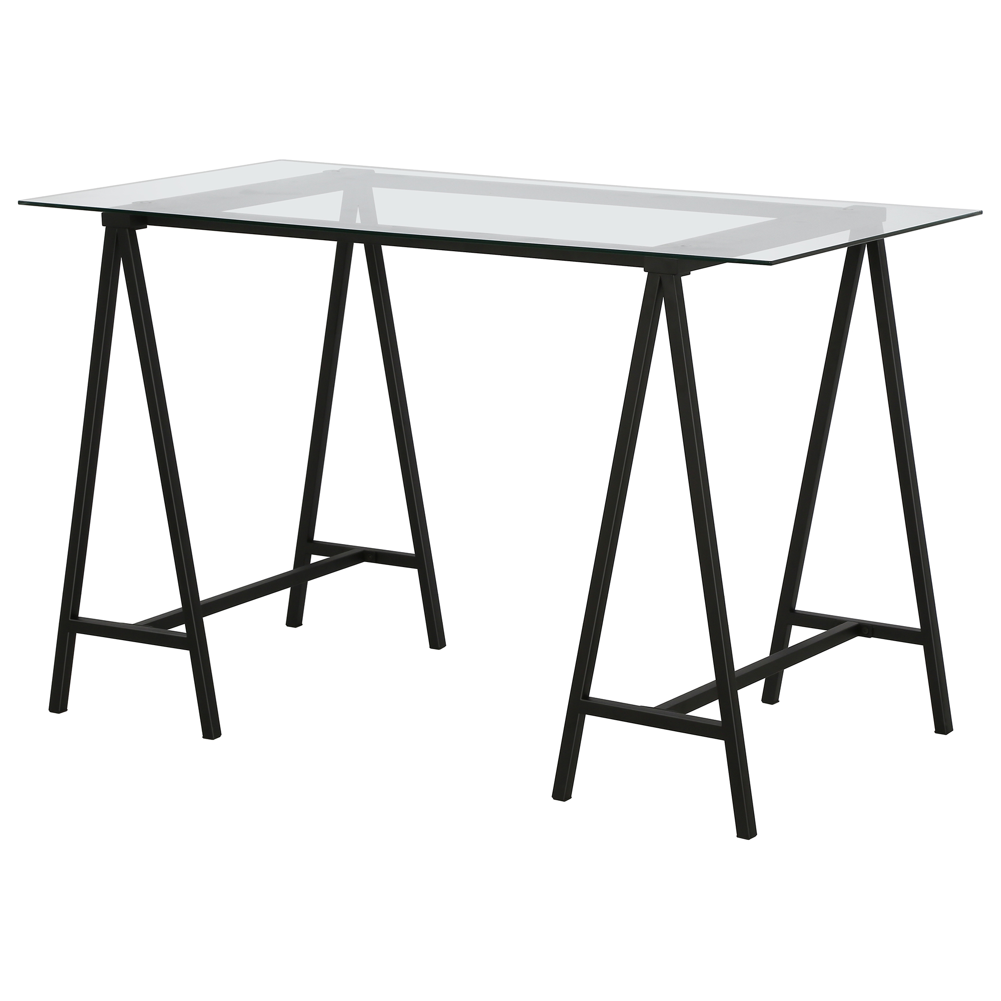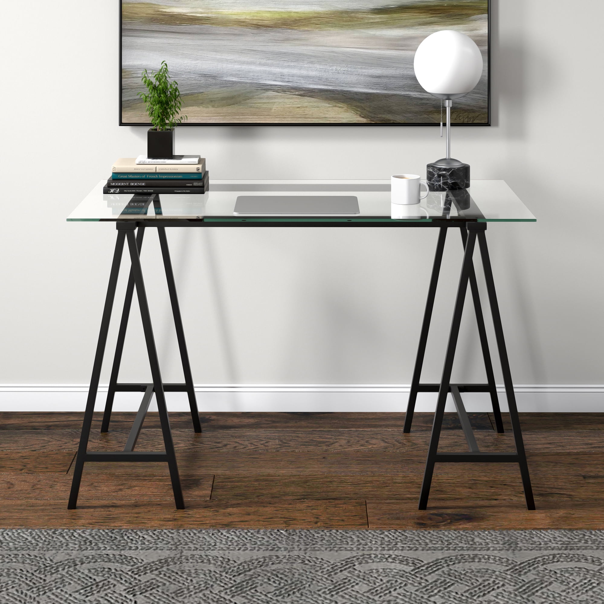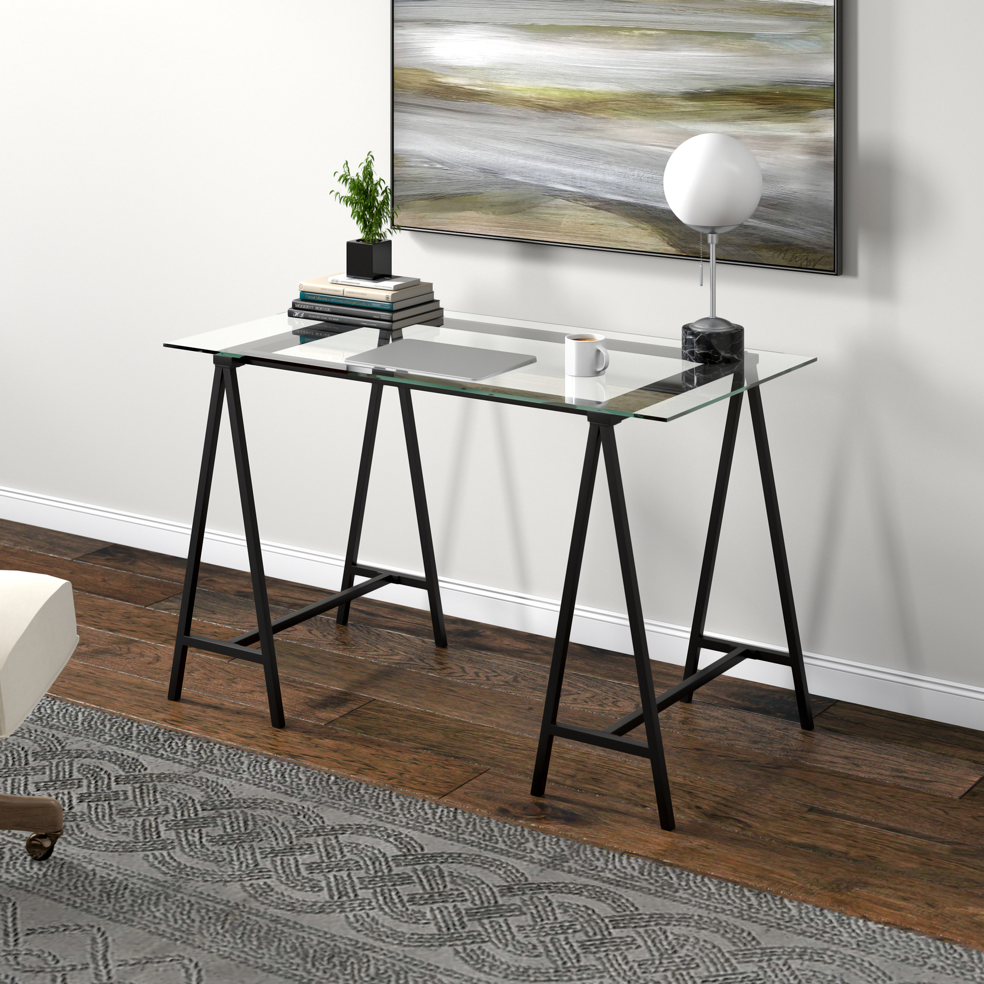 With a modern A-frame design, this desk offers a new transitional piece for you to work from home in luxury. Feel inspired by its sawhorse table design, while working on the open canvas of its tempered glass top. The sleek and simple lines of this desk offer a new element of design for your office, sure to spark creativity. Features: Handcrafted blackened bronze finish applied to the steel frame. Desktop is made of sturdy tempered glass. Tabletop has a weight capacity of 40 lbs. Clean with a soft, dry cloth; no harsh chemicals or abrasive cleaning materials. Features easy assembly. Specifications: Product Dimensions: 48″W x 25″D x 30″H Product Weight: 49.6 lbs