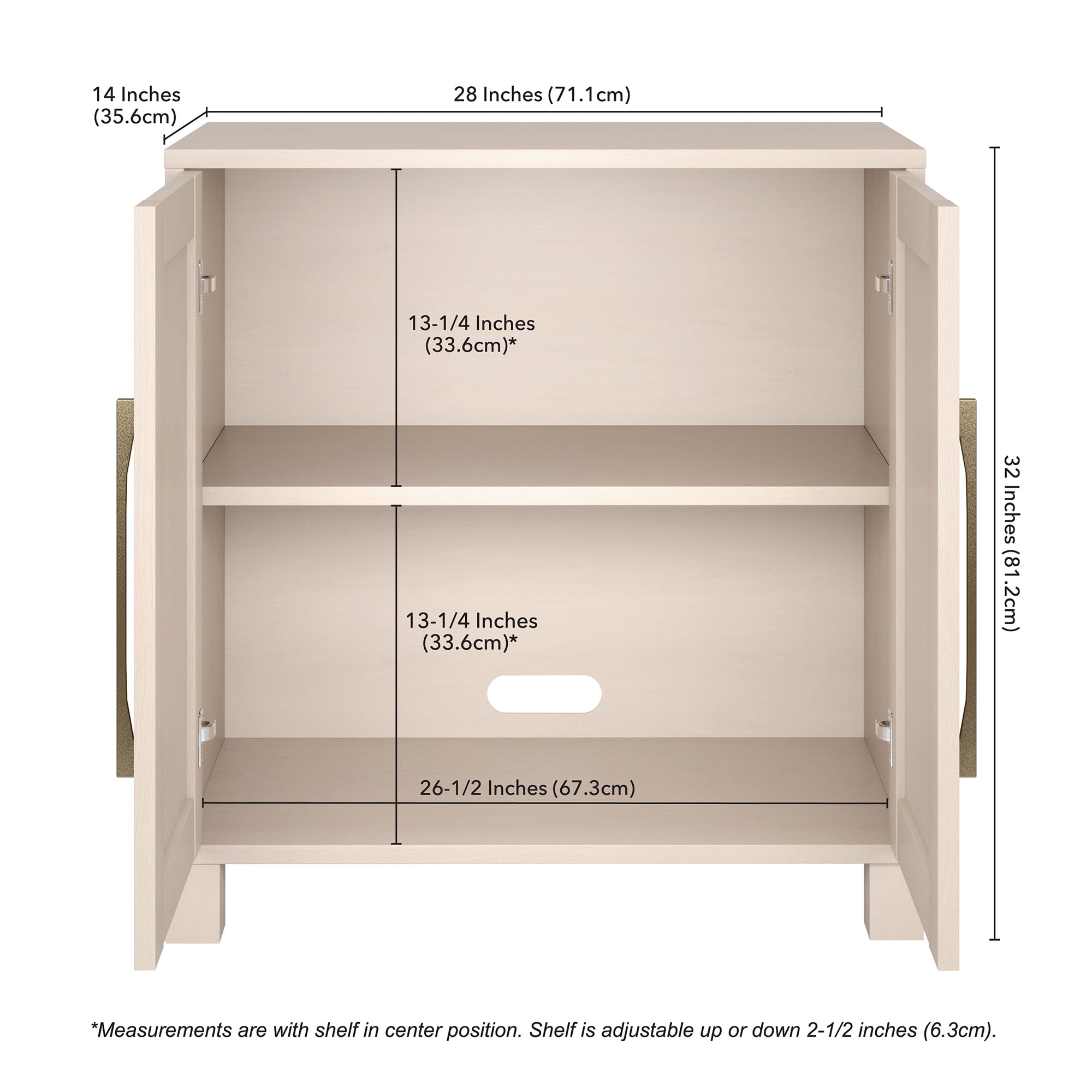 Keep your home office, family room, or bedroom organized without sacrificing style. This sturdy and compact accent cabinet is designed to give you a flexible storage option wherever you need it, whether it’s for office supplies, closet overflow, or just the various knick-knacks and doo-dads that don’t have a space of their own. Featuring an adjustable center shelf and cable management cut-out, this versatile cabinet can even help you organize printers, game consoles, or charging stations. The wood-grained finish adds warmth and casual appeal while the hidden storage behind the two cabinet doors allows you to hide away all the odds and ends that create visual clutter around your home.