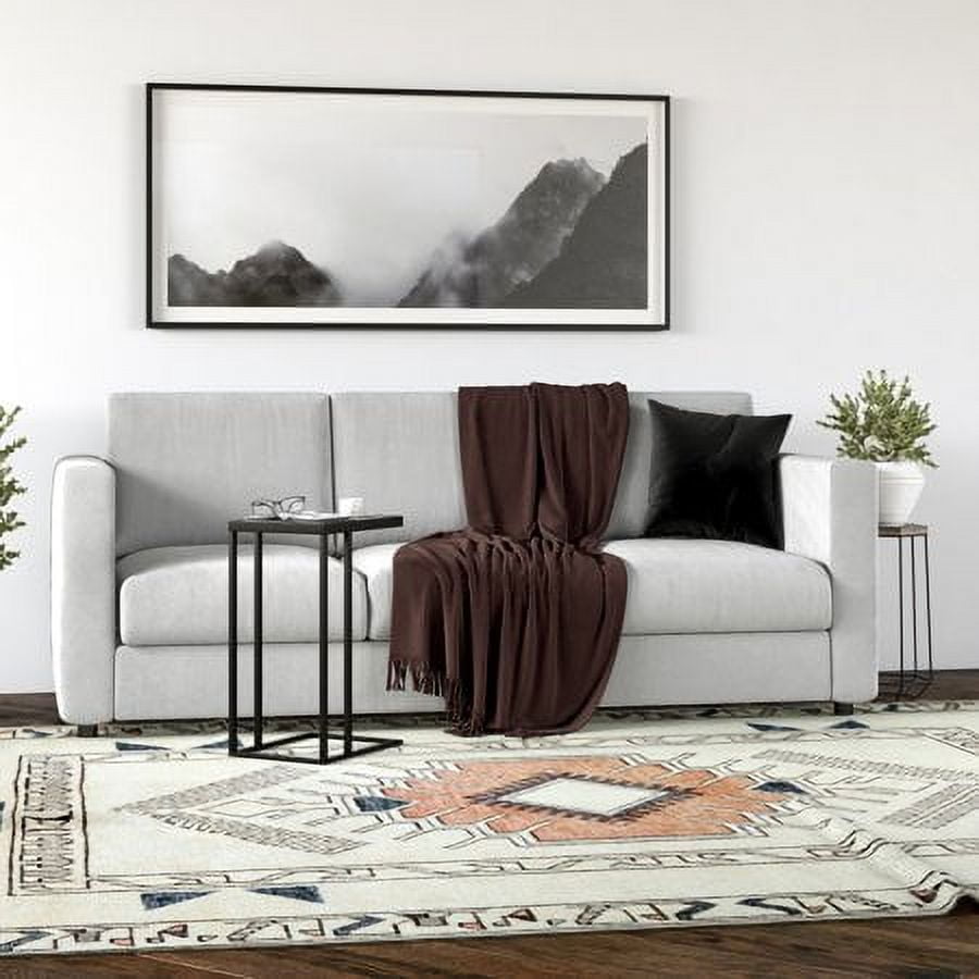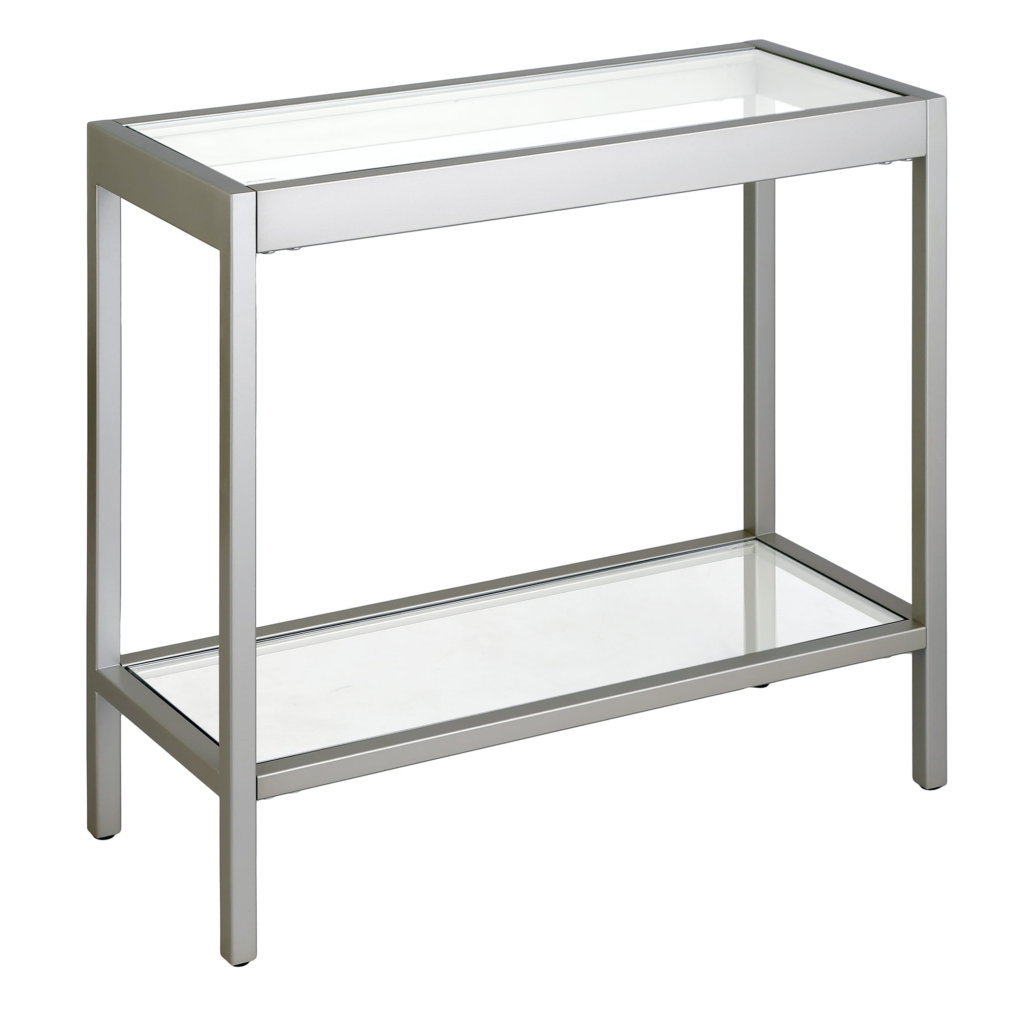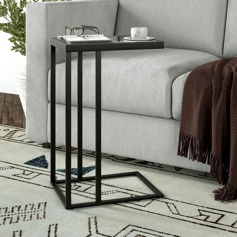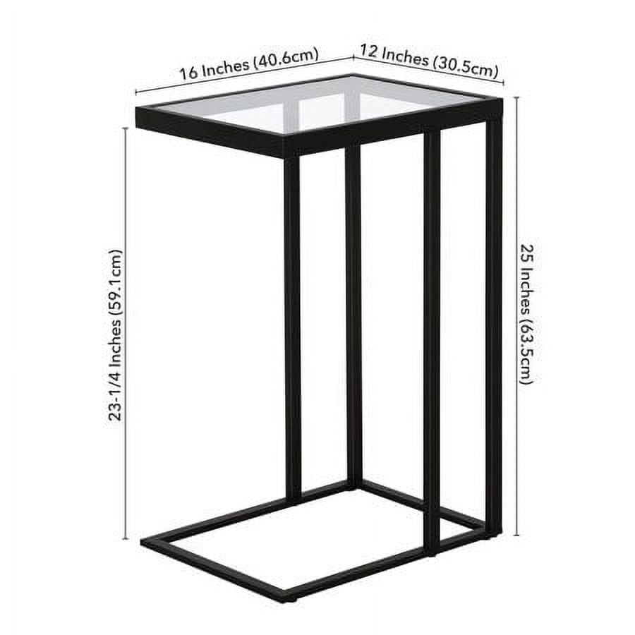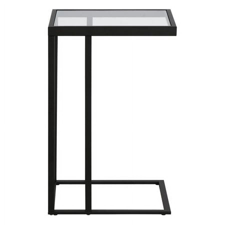 C-table design allows the table base to slide under furniture. Tabletop is made of durable tempered glass Handcrafted finish is applied to the steel frame Features easy assembly. Clean with a soft, dry cloth; no harsh chemicals or abrasive cleaning materials.