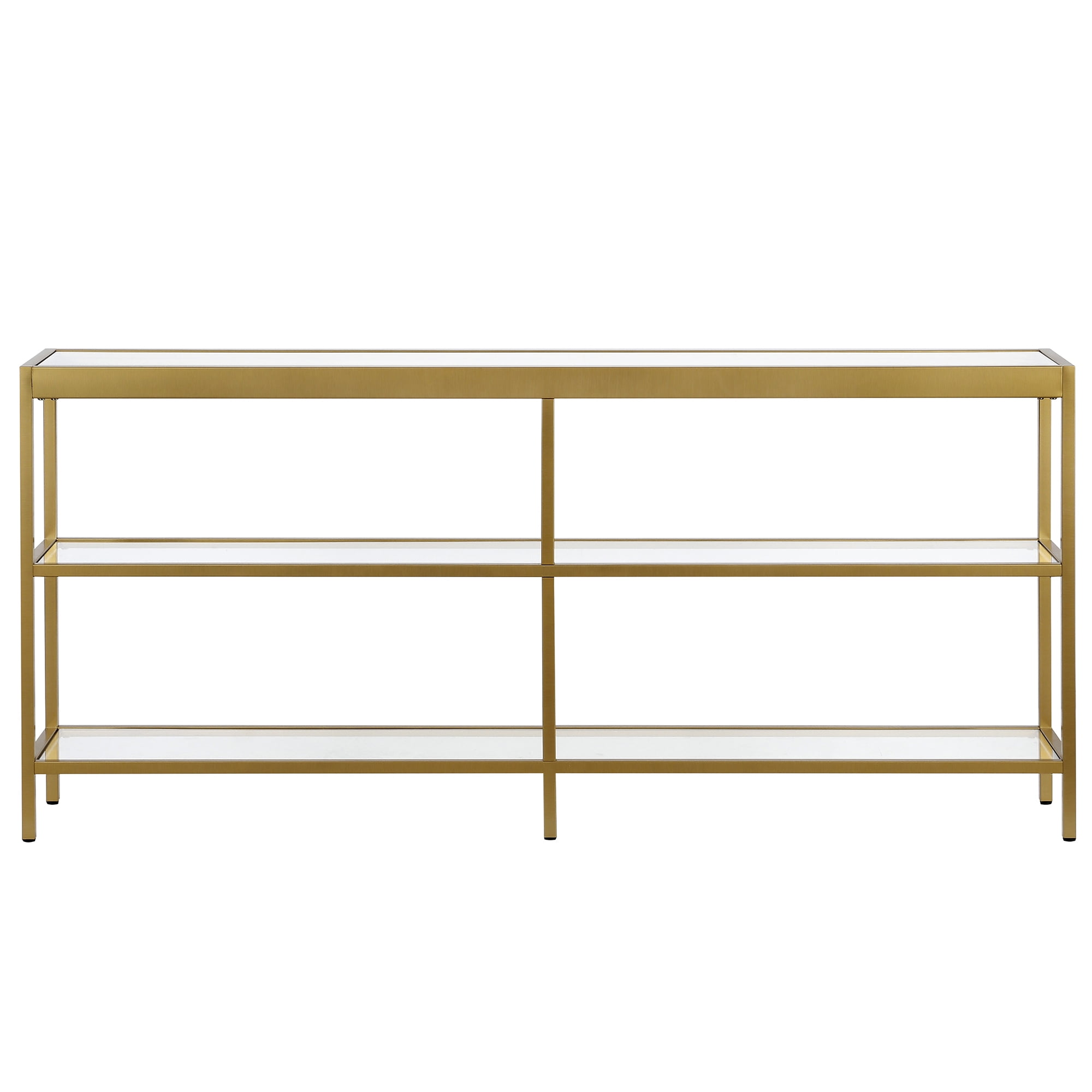 A modern contemporary design for your entryway, living room, den, and more. Hand crafted brass finish is applied to the steel frame. Features a tempered glass top and shelves. Table has a weight capacity of 50 lbs