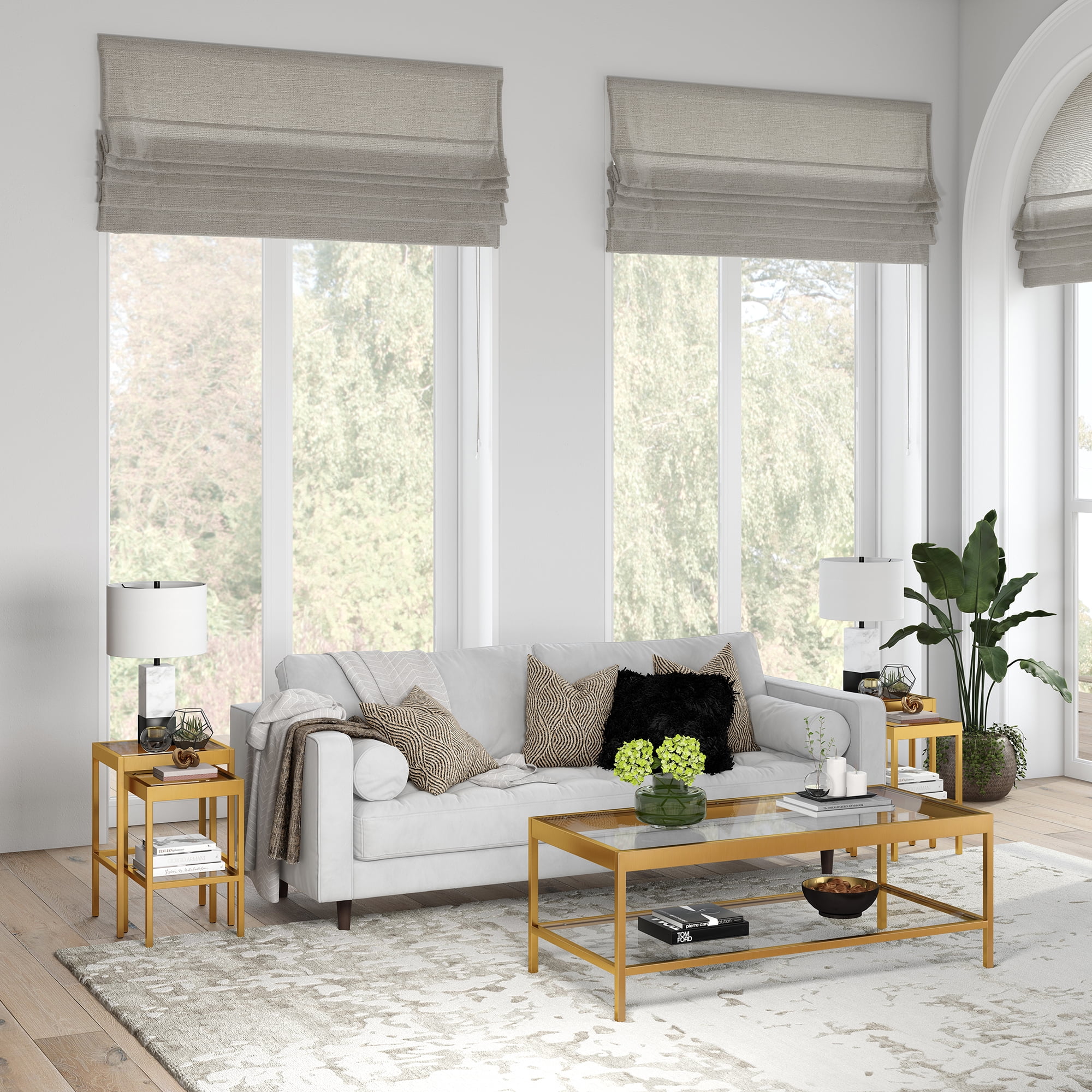 Handcrafted golden brass finish is applied to the steel frame. Features durable tempered glass. Weight capacity of the larger table is 20 lbs, smaller table can hold 15 lbs. Larger table is 16”W x 14”D x 24”H, smaller table is 13”W x 13”D x 21.5”H. Clean with a soft, dry cloth; no harsh chemicals or abrasive cleaning materials.