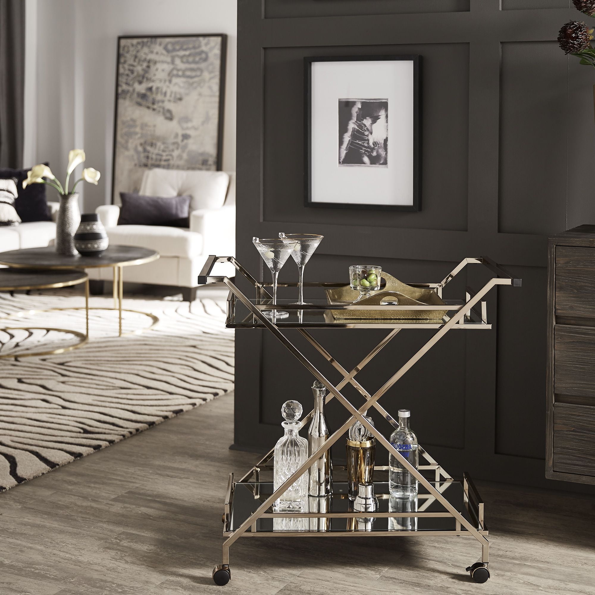 Taking from the sophistication and glamor of Hollywood, this 2-tier coffee tables features staggered square table tops made from tempered glass. The geometric metal base adds visual appeal and will draw your eye as the center of your living room.