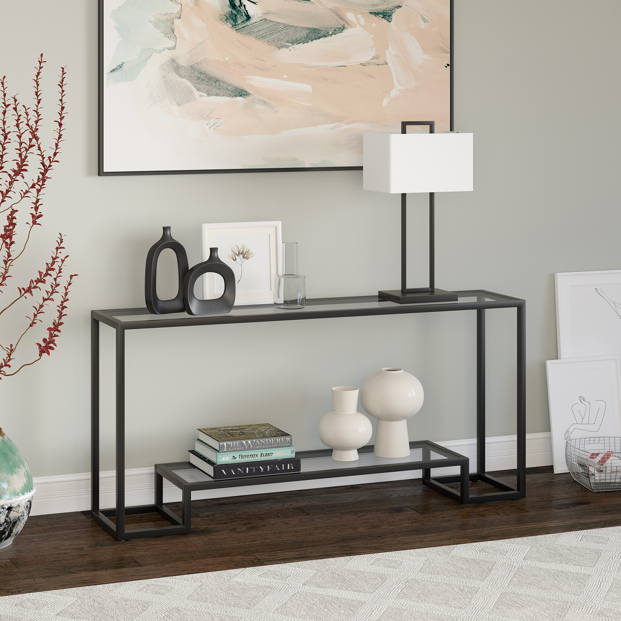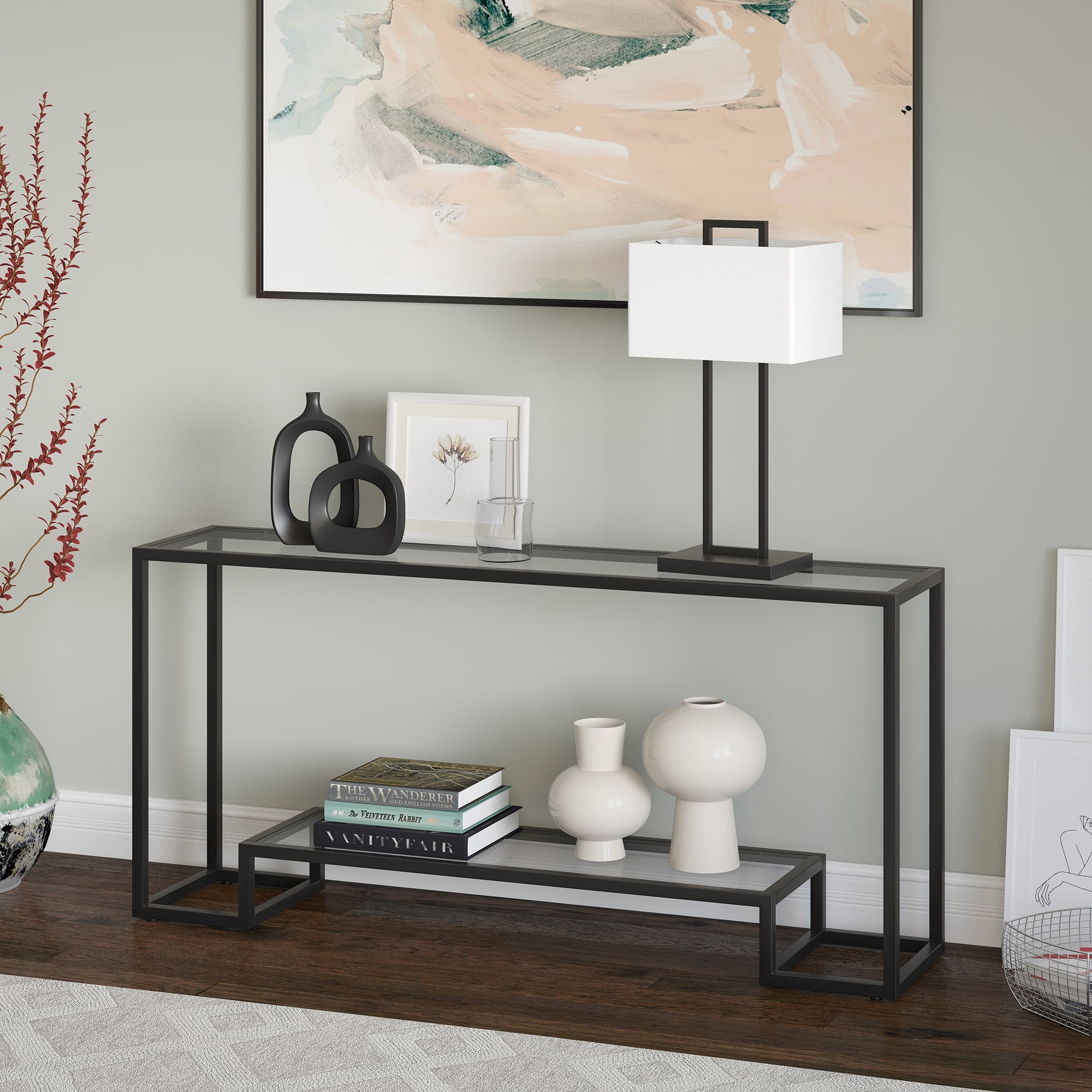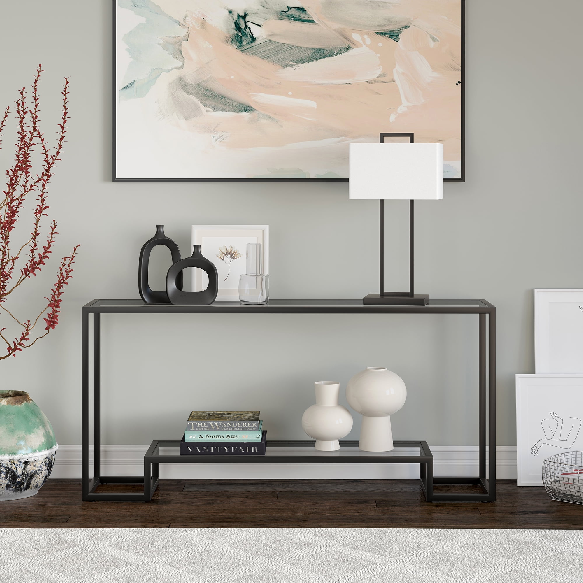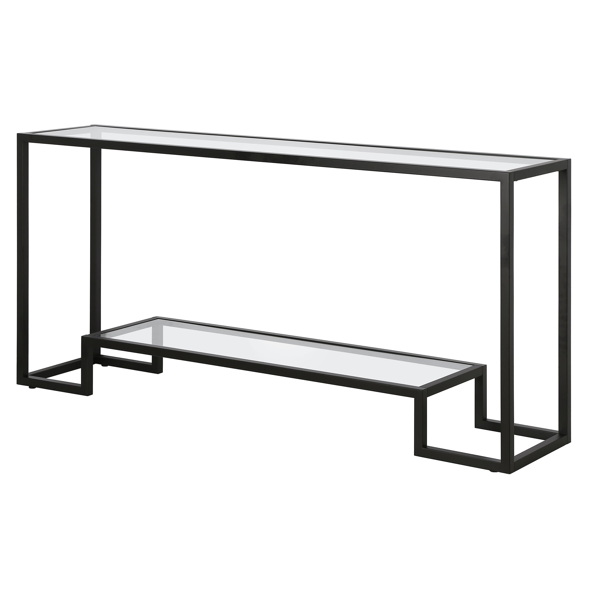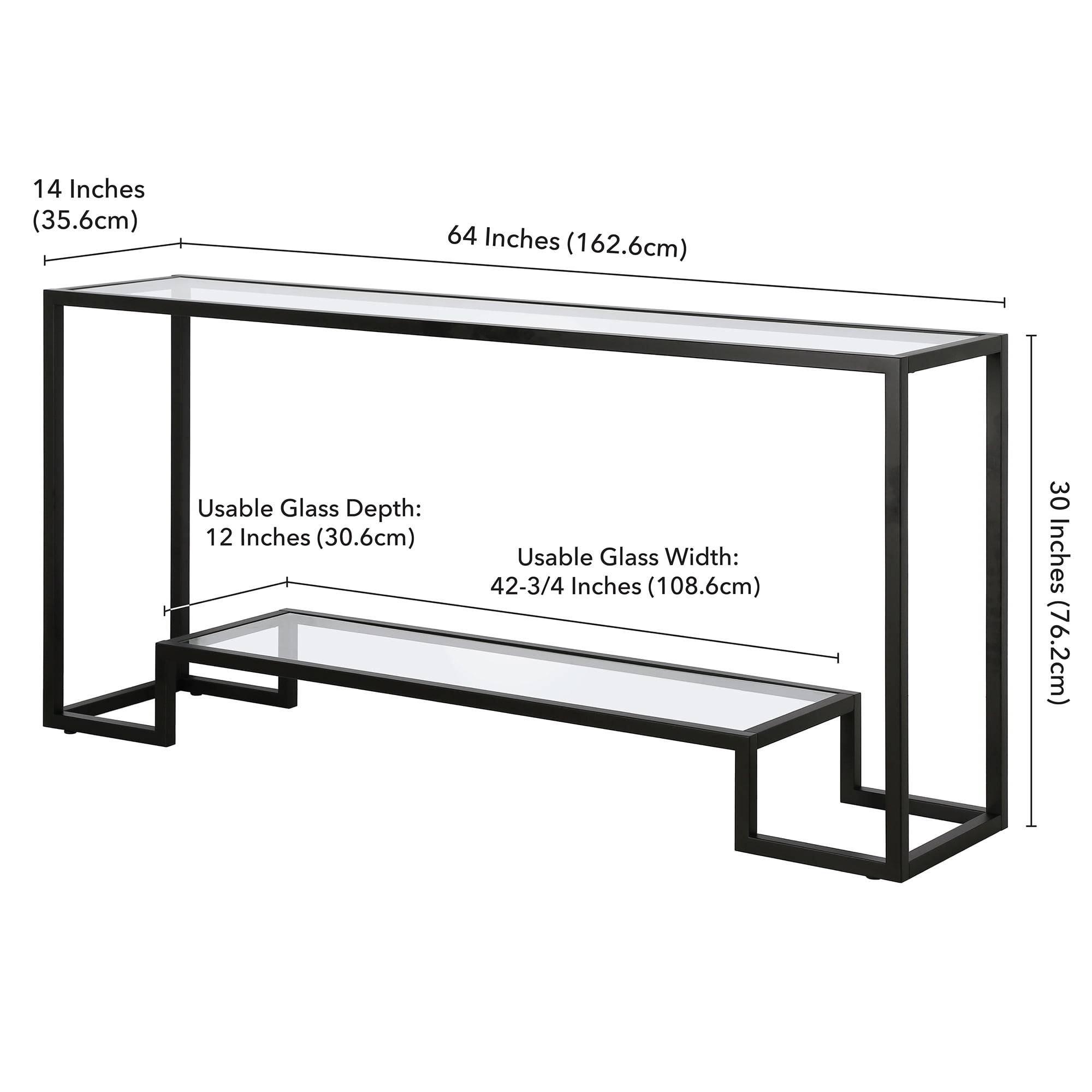 64″ length is perfect for larger rooms and long hallways. A handcrafted finish is applied to the steel frame. Tabletop and shelves are made of durable tempered glass.