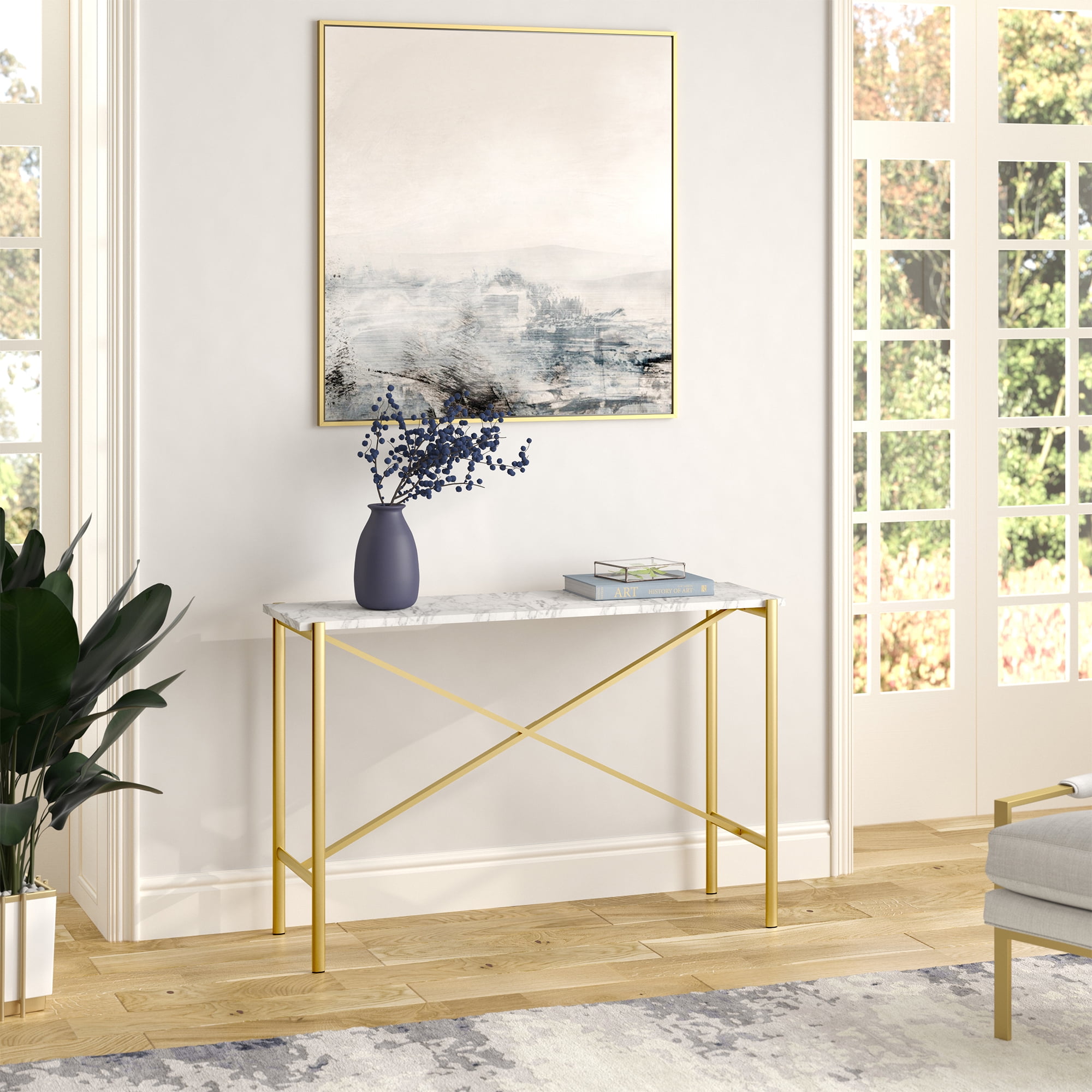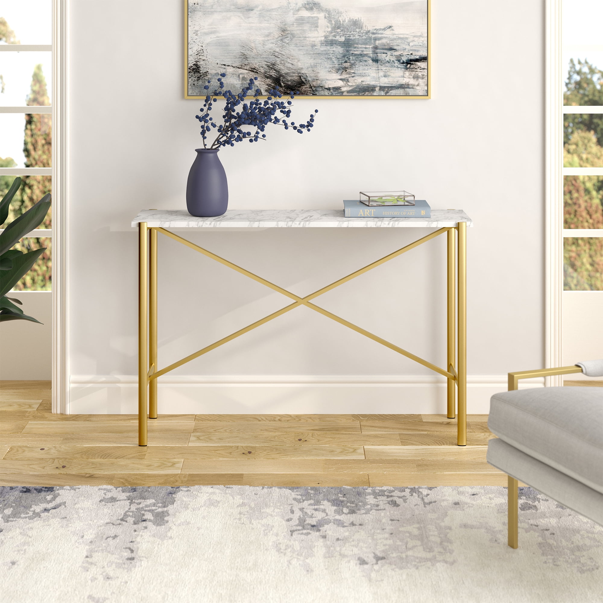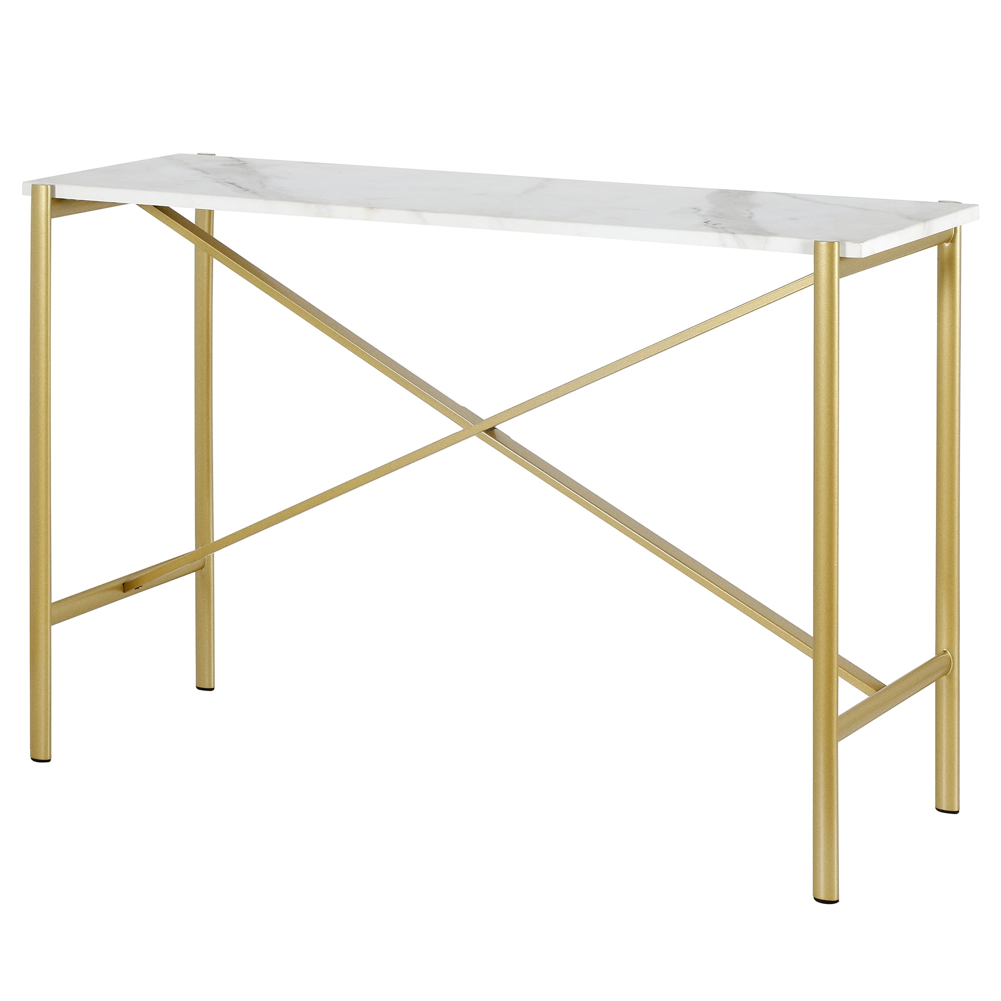 Handcrafted finish is applied to the steel frame. Tabletop is finished in attractive faux marble. Table has a weight capacity of 50 lbs. Features easy assembly. A modern contemporary design for your entryway, living room, den, and more. Handcrafted finish is applied to the steel frame. Features a faux marble top. Table has a weight capacity of 50 lbs. Features easy assembly.