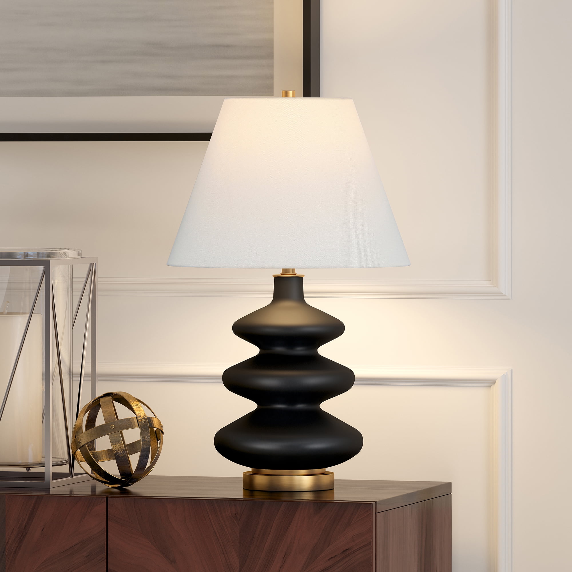 Triple gourd base is glass finished in matte black. Paired with an empire shade. Includes a 6 ft. cord.