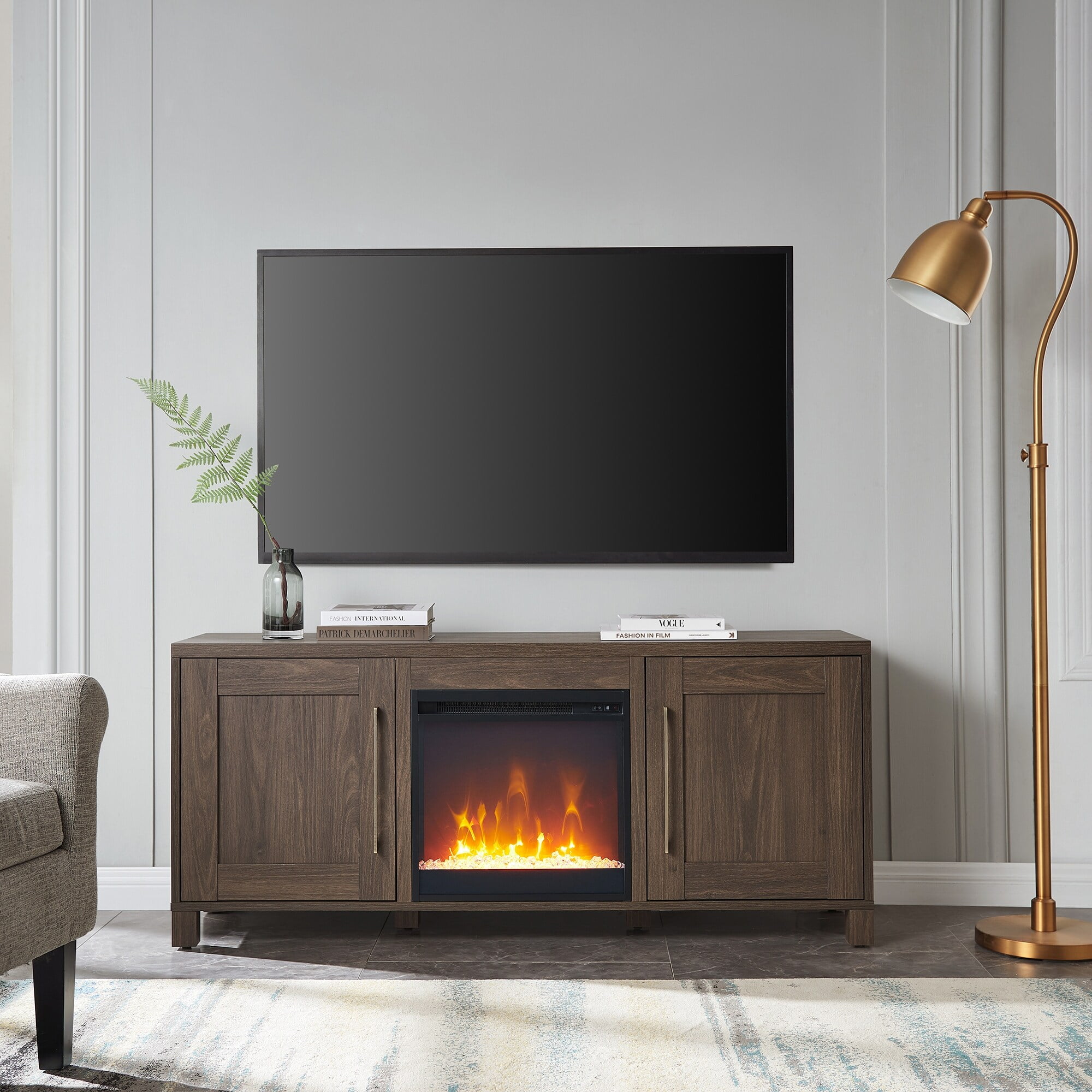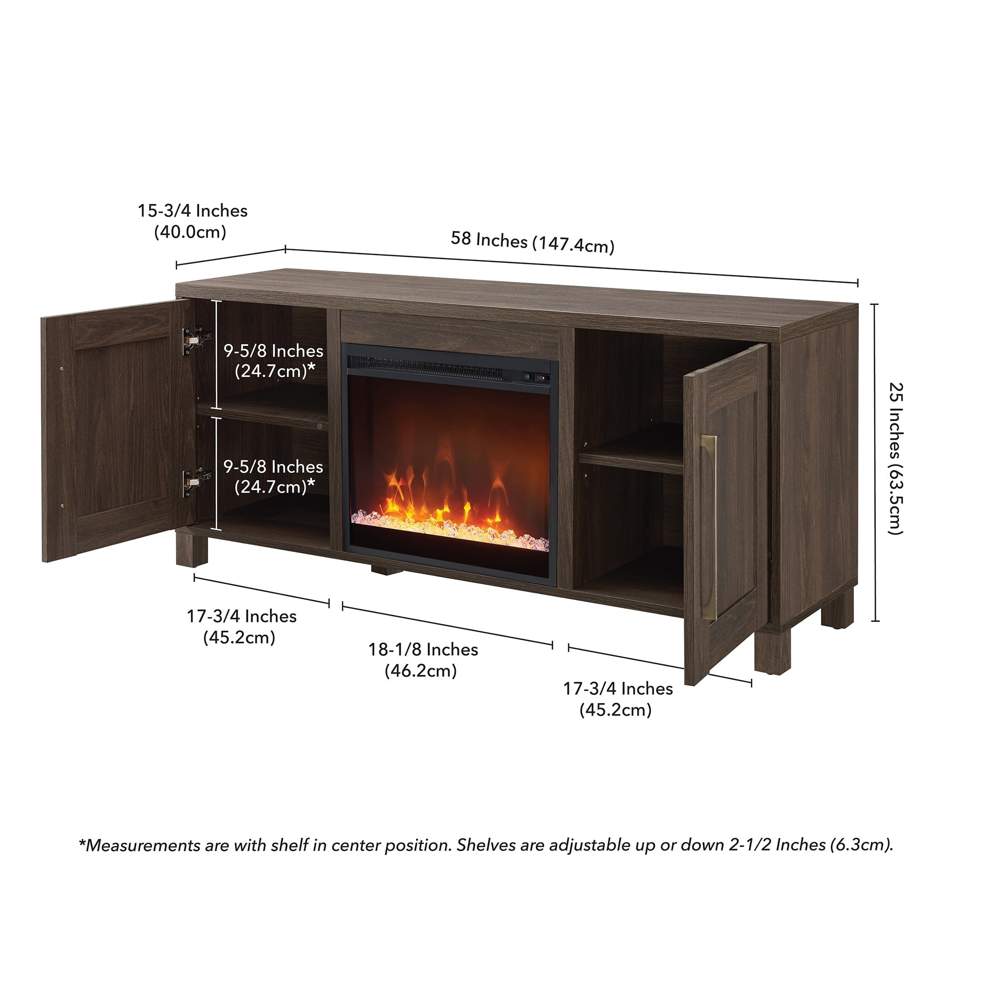 Combine functionality and classic transitional design with this modern TV stand, featuring an inset electric fireplace. Its rich wood tone creates a warm neutral palette that will blend seamlessly into any color scheme, while its classic styling pairs perfectly with the existing design inspiration of your living room, den, or game room. This solid-backed stand features two large enclosed cabinets with sleek brass-finished hardware. Cable management cut-outs and adjustable inner shelves help keep your media storage and consoles organized. Features: A transitional design accommodates TVs up to 65″ for your entertaining space. Constructed of sturdy MDF materials in a handcrafted Charcoal Gray finish. Features an electric fireplace with wood-look logs, with 4 shelves and 2 enclosed doors for ample storage. Fireplace insert features 4777 BTUs (heat coverage for 400 sq. feet) and an automatic temperature cut-off for safety. The top has a weight capacity of 75lbs. Lower shelves can hold 25 lbs. each. Specifications: Product Dimensions: 58″W x 15″D x 25″H Product Weight: 89.5 lbs
