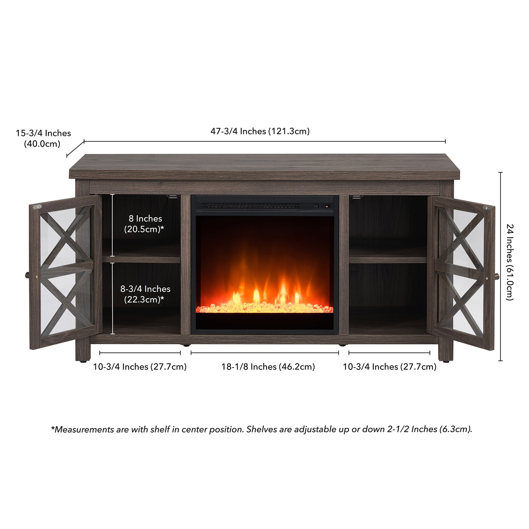 Accommodates TVs up to 55″.Features an electric fireplace insert with crystal-look rocks and LED faux-flames.Fireplace insert features 4777 BTUs (heat coverage for 400 sq. feet) and an automatic temperature cut-off for safety.
