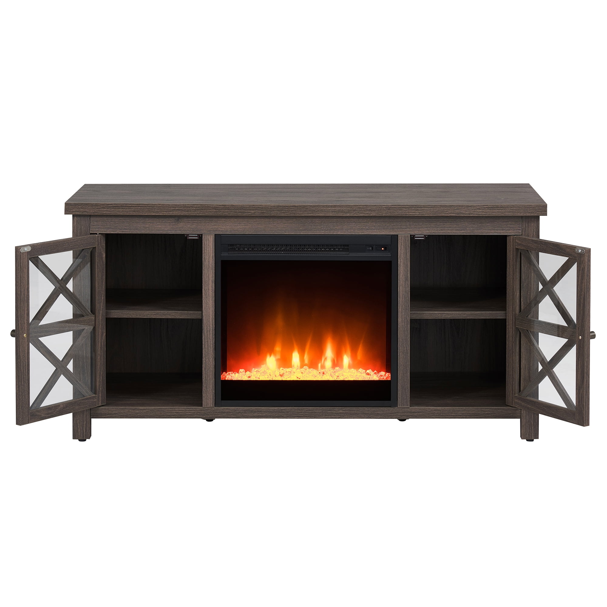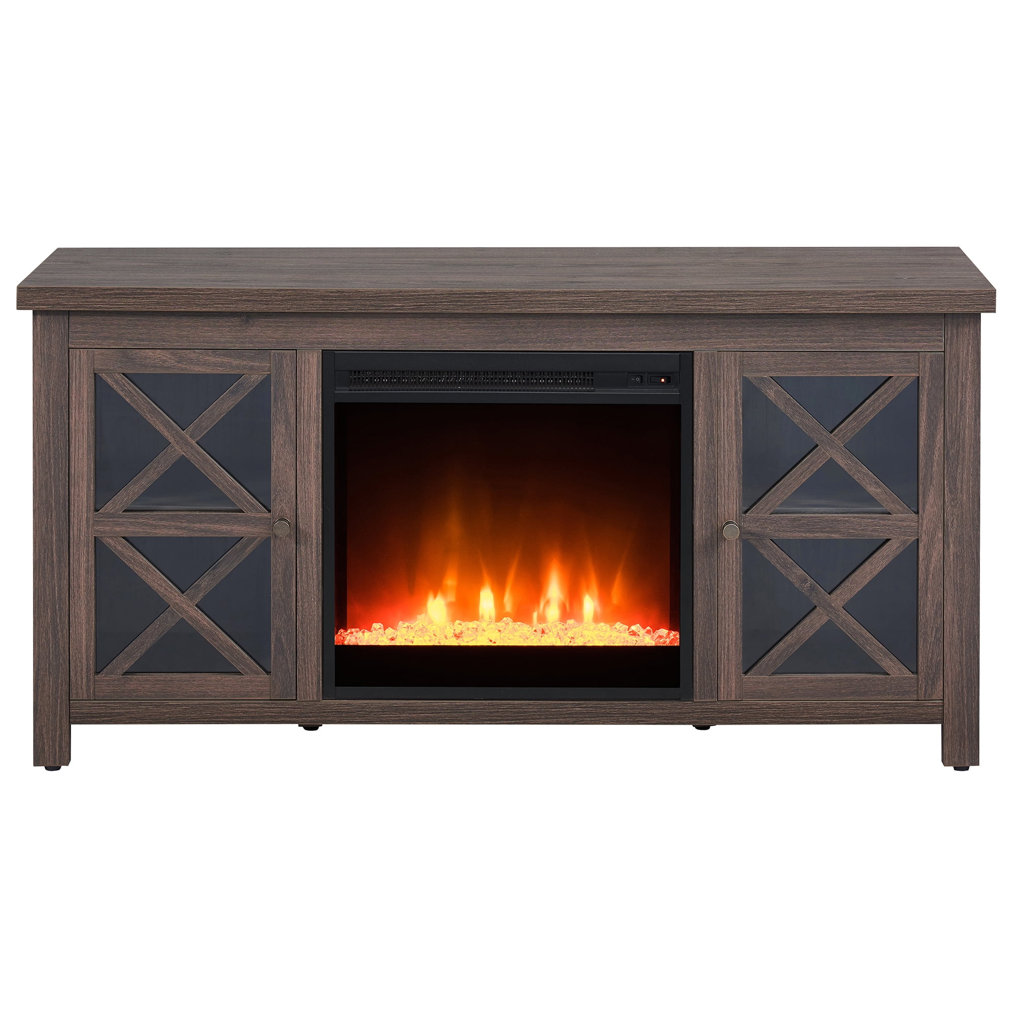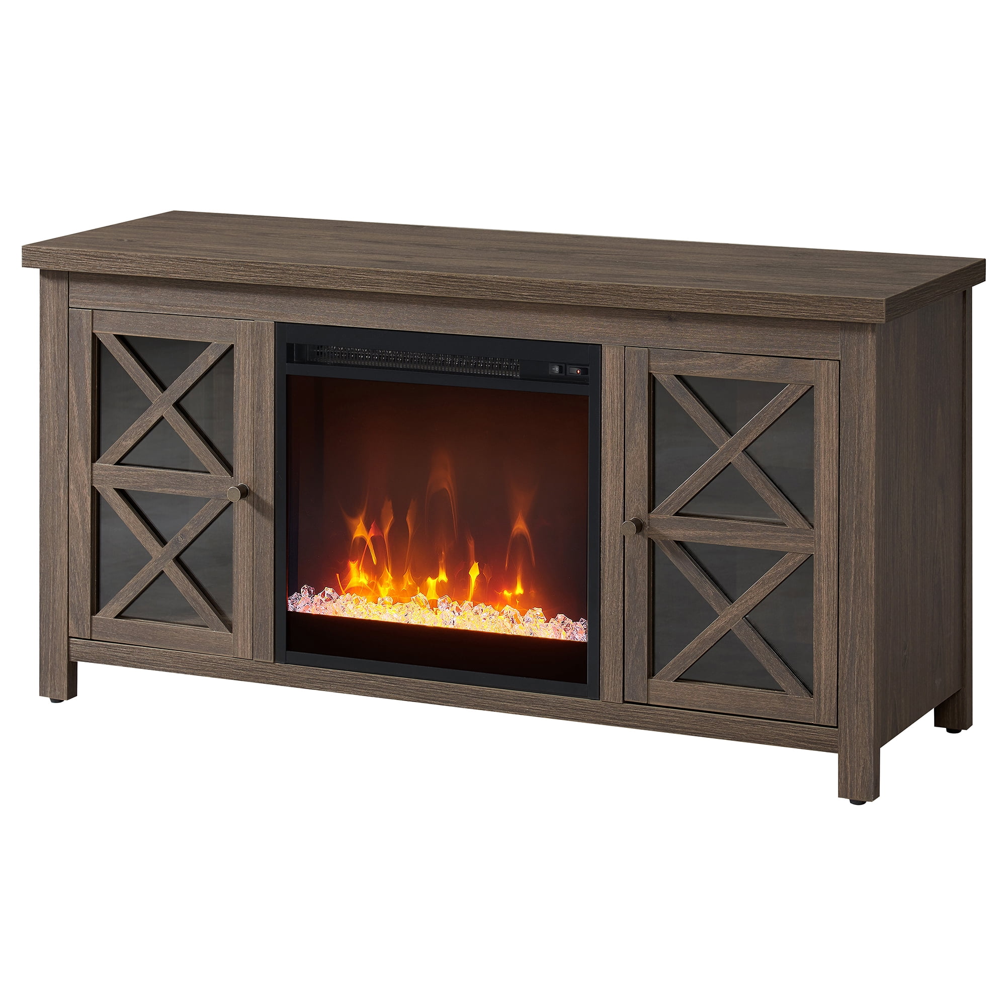 Combine functionality and on-trend design with this sturdy TV stand, featuring an inset electric fireplace. Its rich wood tone creates a warm neutral palette that will blend seamlessly into any color scheme, while its crisscross-accented cabinet doors add a touch of modern farmhouse whimsy. Stay warm and cozy while you take in the big game, a movie marathon, or that season finale everyone’s been talking about.