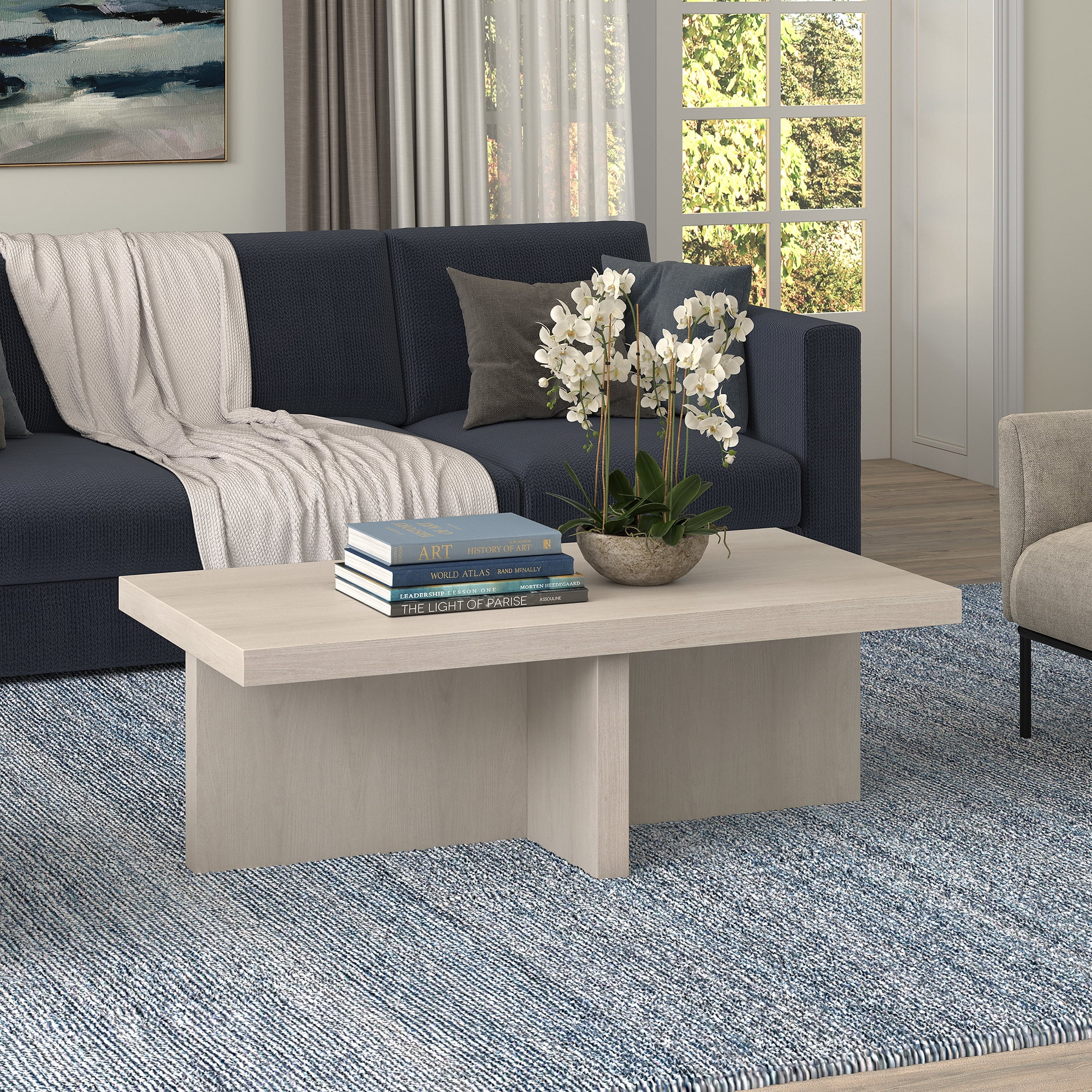 Striking in its simplicity, this Scandinavian-inspired coffee table emphasizes clean lines and straightforward design. The sturdy X-base anchors the look, while the natural wood-look finish adds texture and tonal variation to your space. Featuring a 50 lb. weight capacity and adjustable leveling feet, this 44″ wide piece will imbue your living room, family room, or entertainment area with an on-trend focal point.