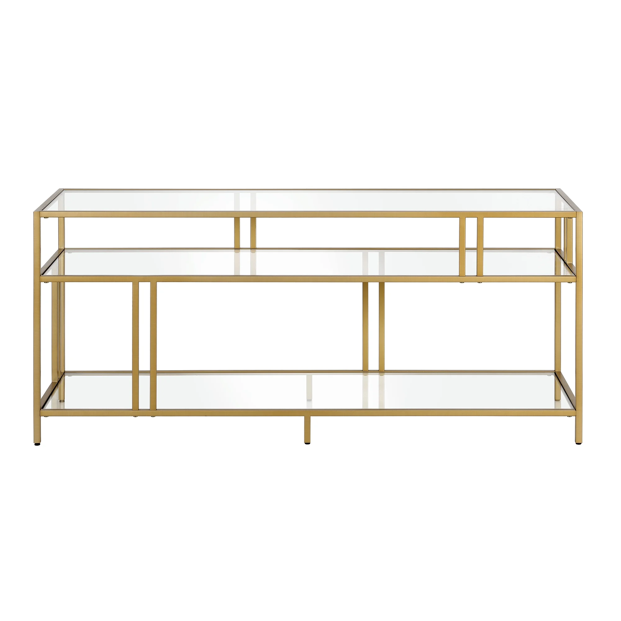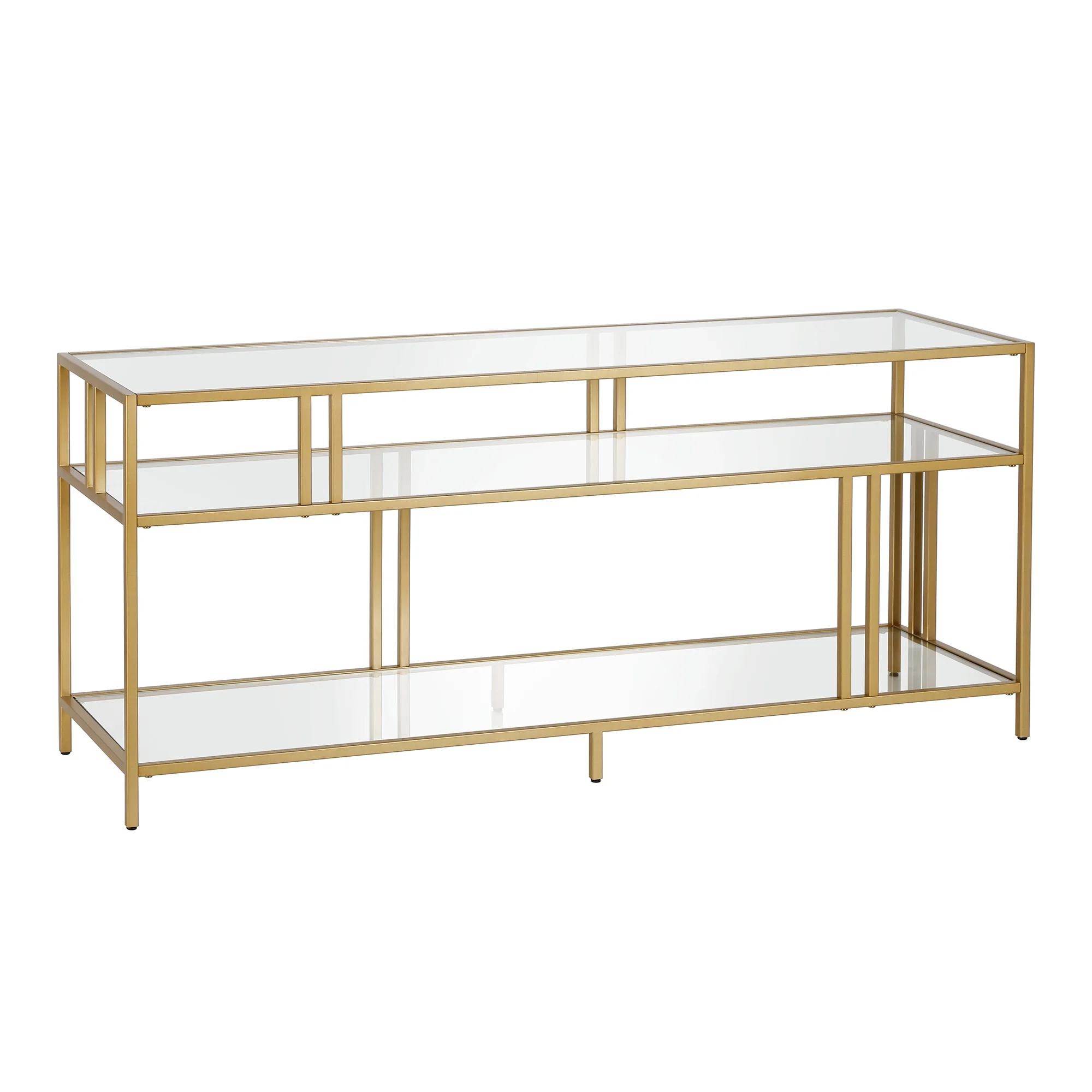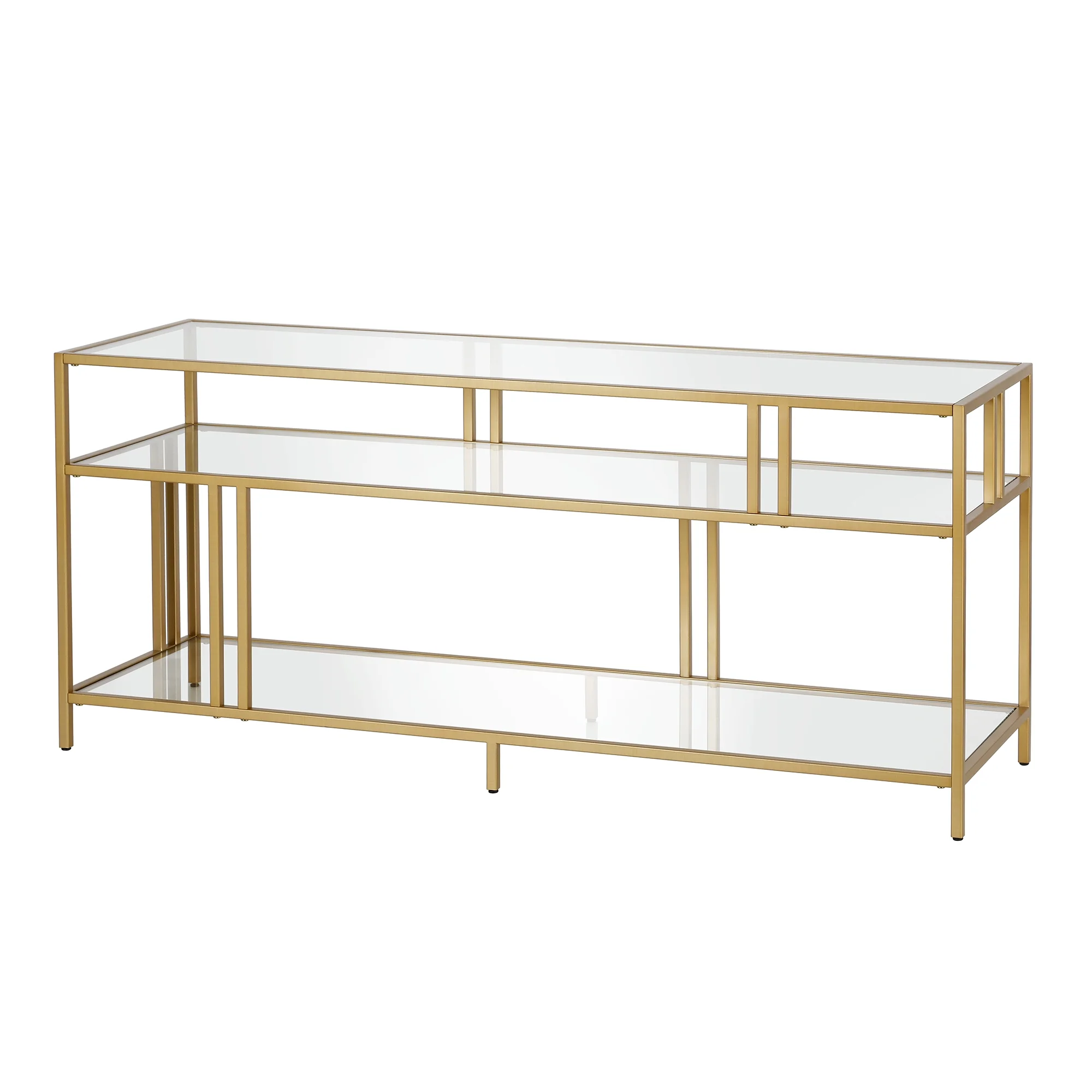 Evelyn&Zoe Cortland Rectangular TV Stand with Glass Shelves for TV’s up to 60″, Brass