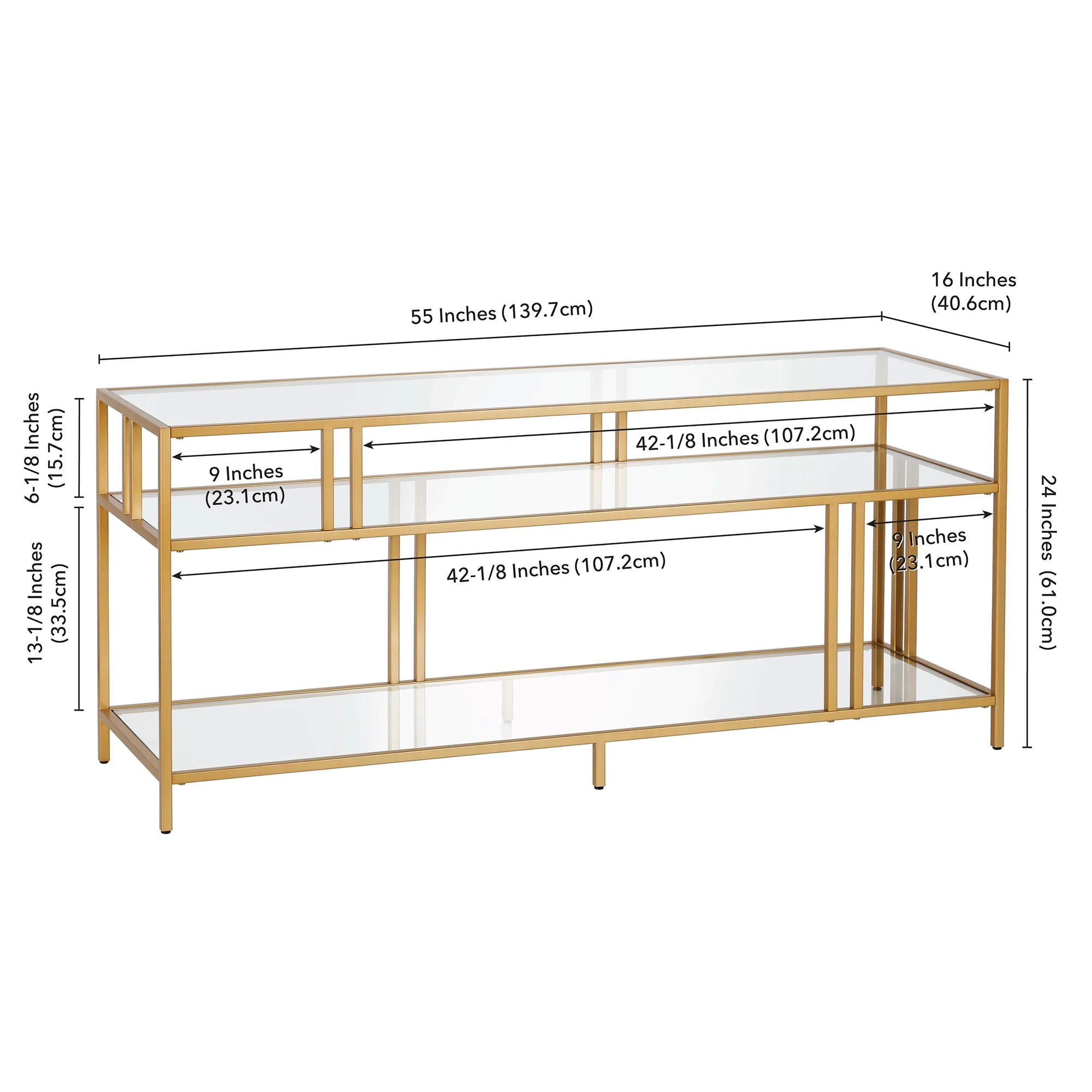 Measures 55W x 16D x 24H in. A industrial design accommodates TVs up to 60 in. for your entertaining space Constructed of sturdy metal and glass materials in a handcrafted Blackened Bronze finish. Features 2 shelves for ample storage. The top has a weight capacity of 75lbs. Lower shelves can hold 40lbs. each. Clean with a soft, dry cloth; no harsh chemicals or abrasive cleaning materials. Features easy assembly.