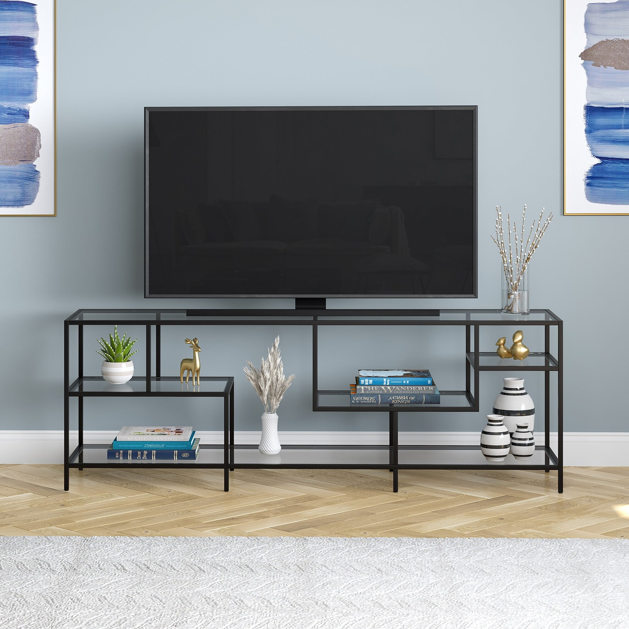 A modern contemporary design accommodates TVs up to 65″ for your entertaining space. Constructed of sturdy metal and glass materials in a handcrafted Blackened Bronze finish. Features 4 shelves for ample storage. The top has a weight capacity of 75lbs. Lower shelves can hold 20lbs. each. Clean with a soft, dry cloth; no harsh chemicals or abrasive cleaning materials. Features easy assembly.