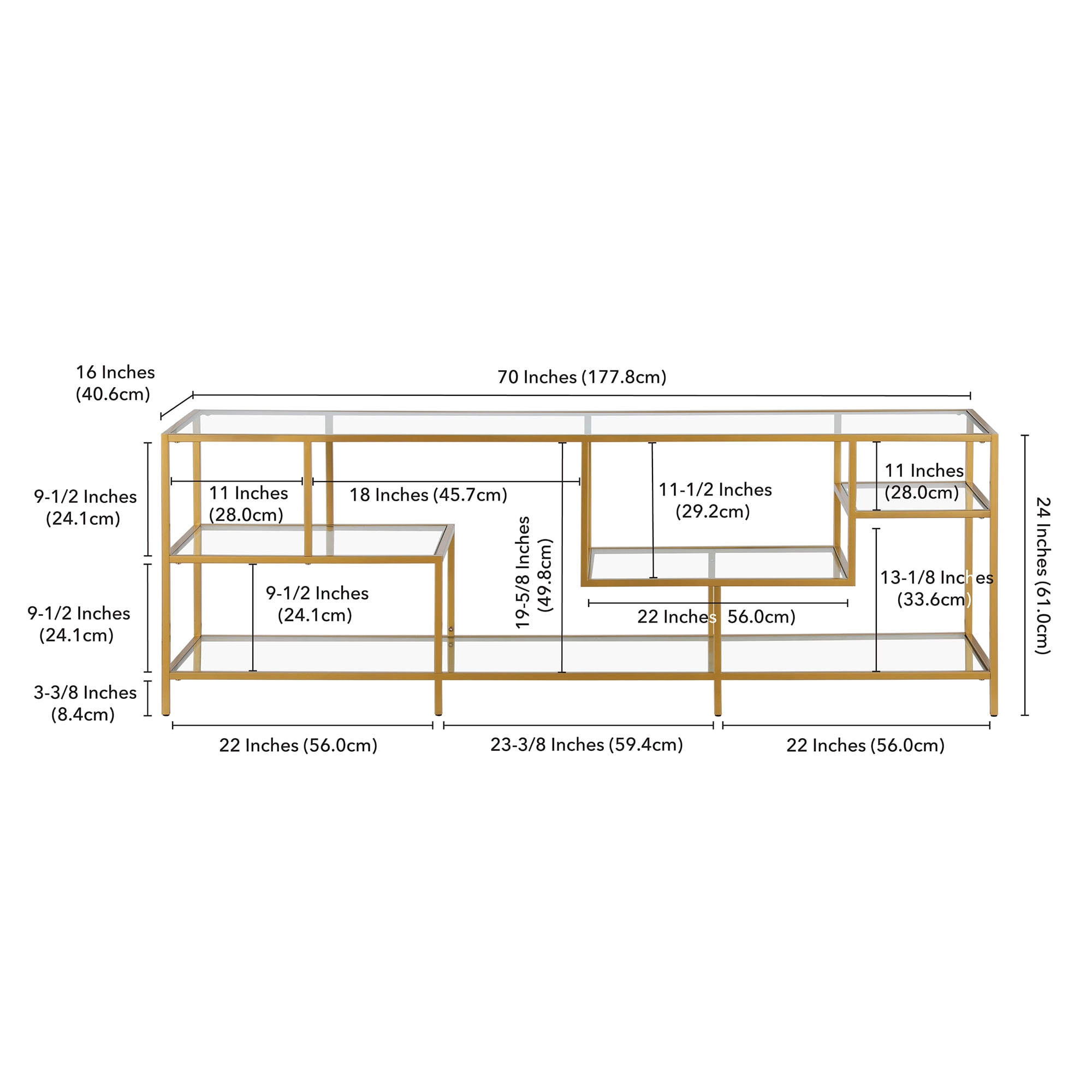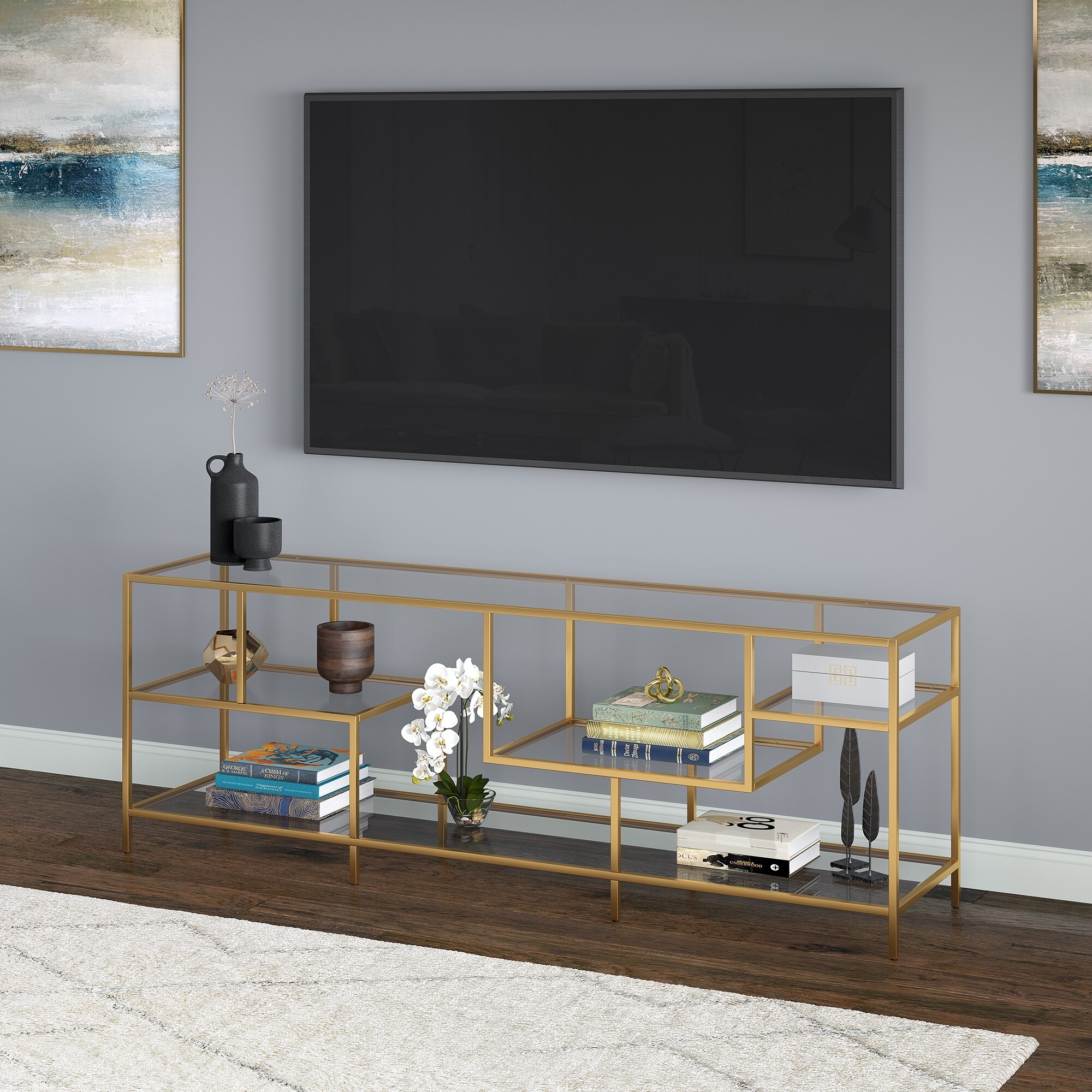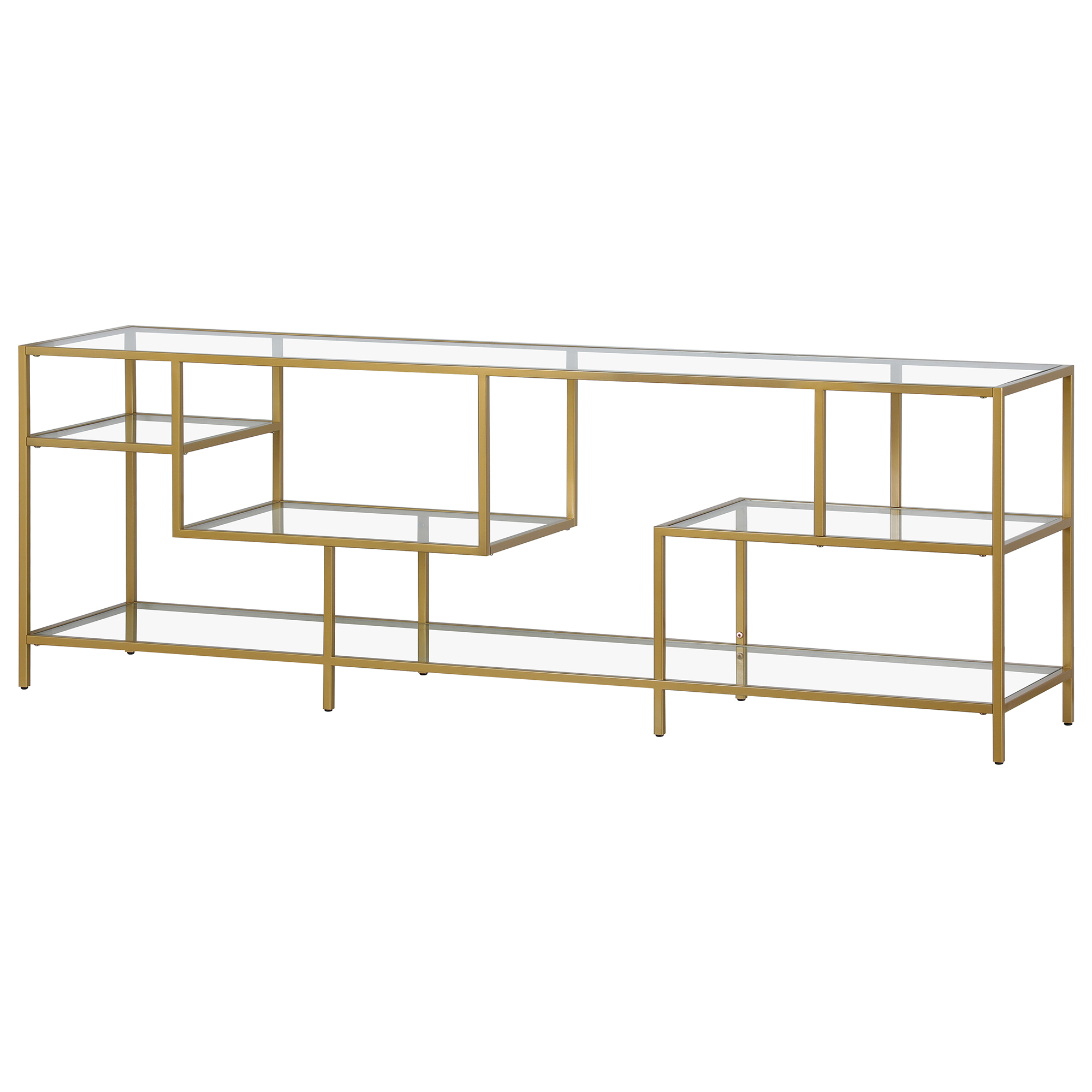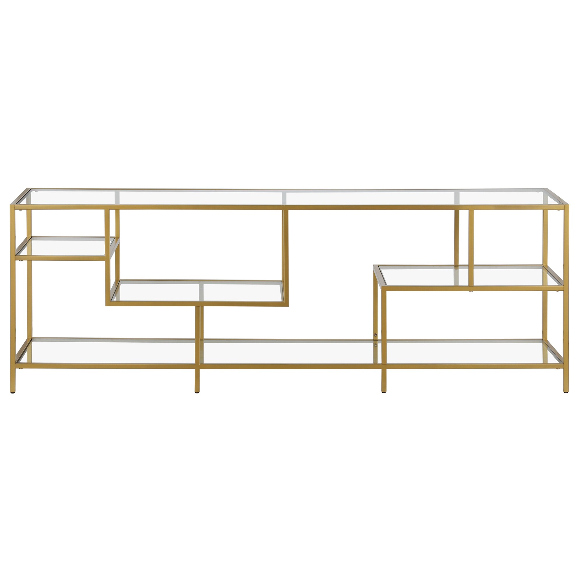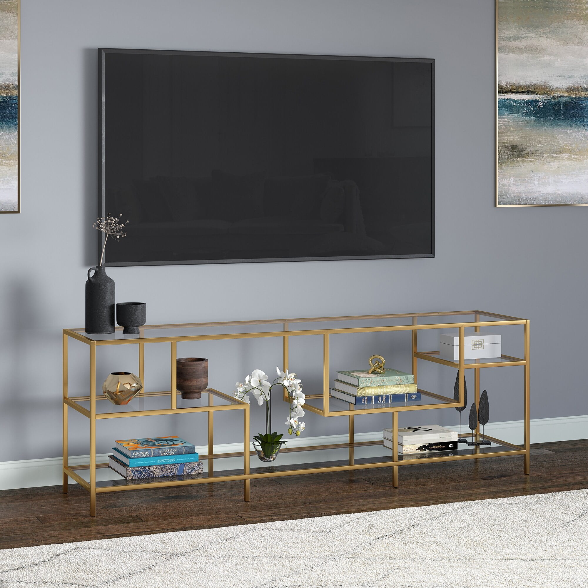 Evelyn&Zoe Deveraux Rectangular TV Stand with Glass Shelves for TV’s up to 75″, Brass