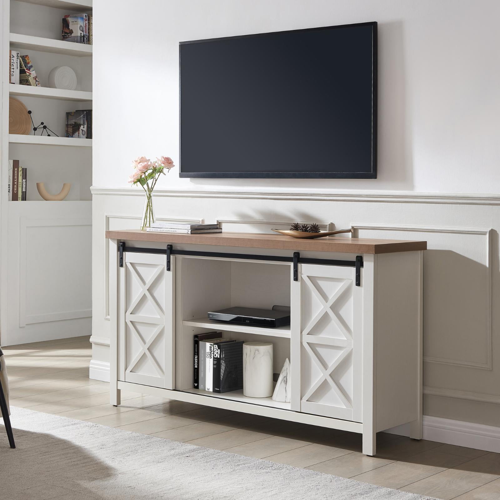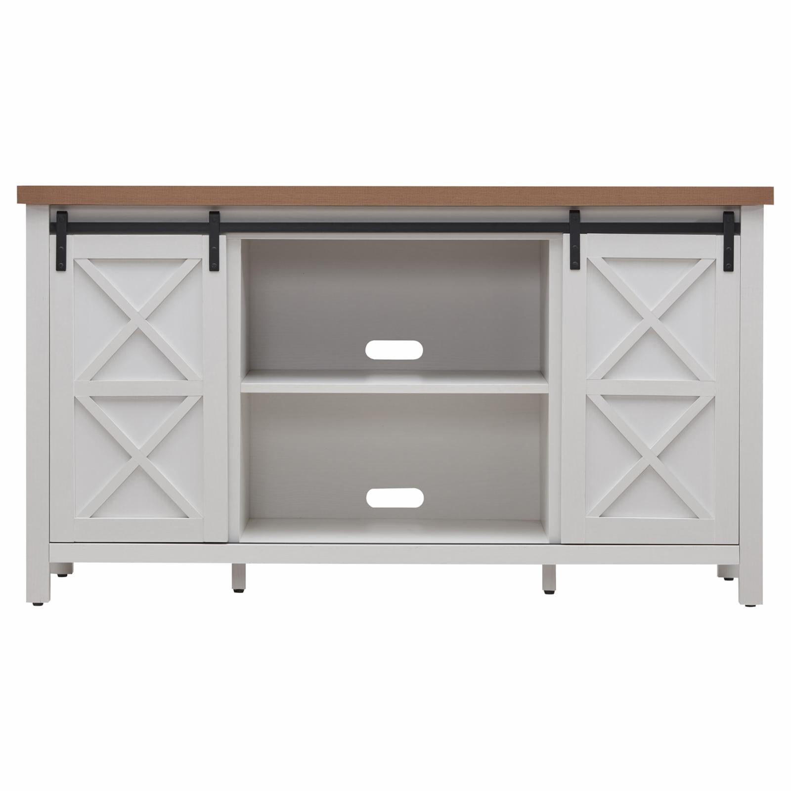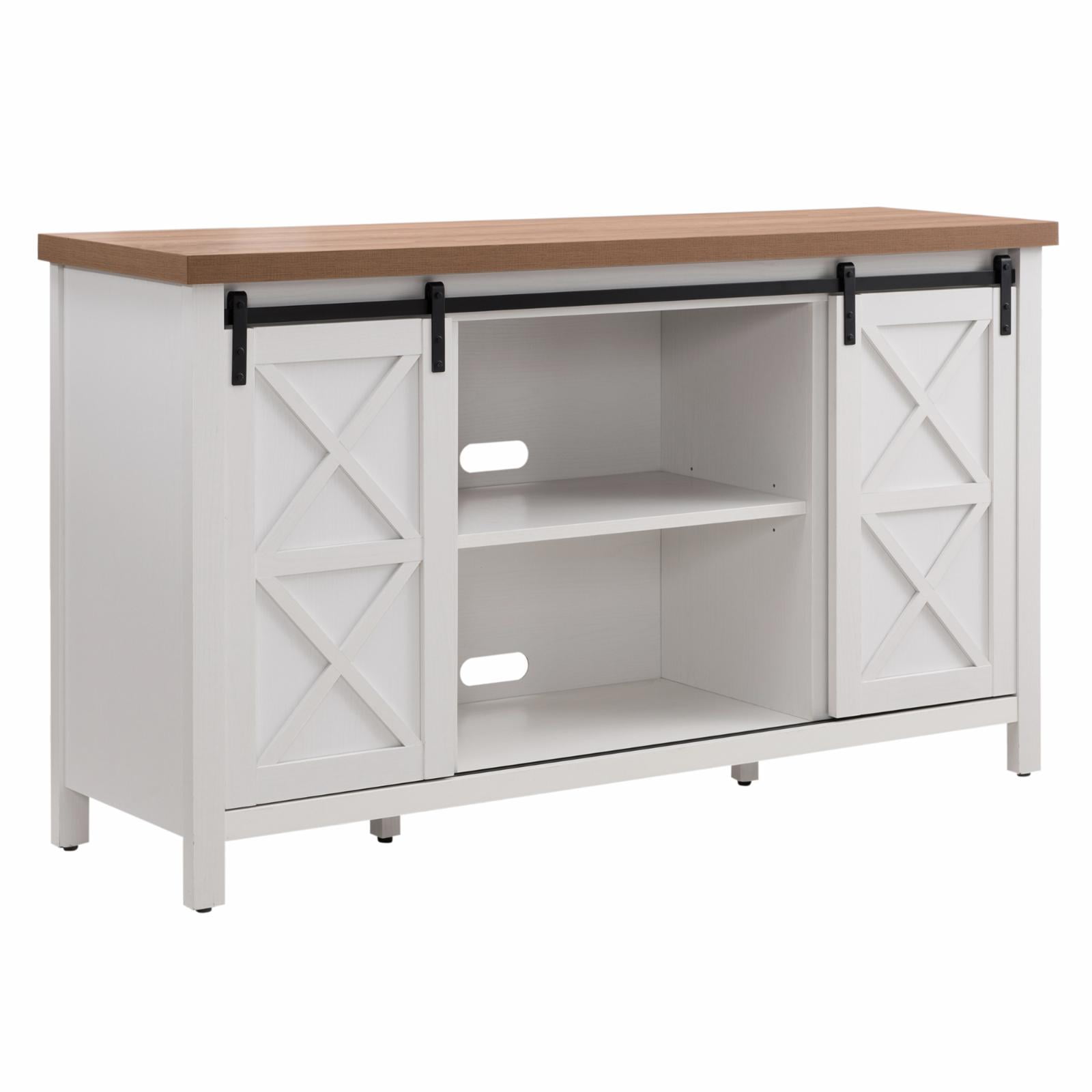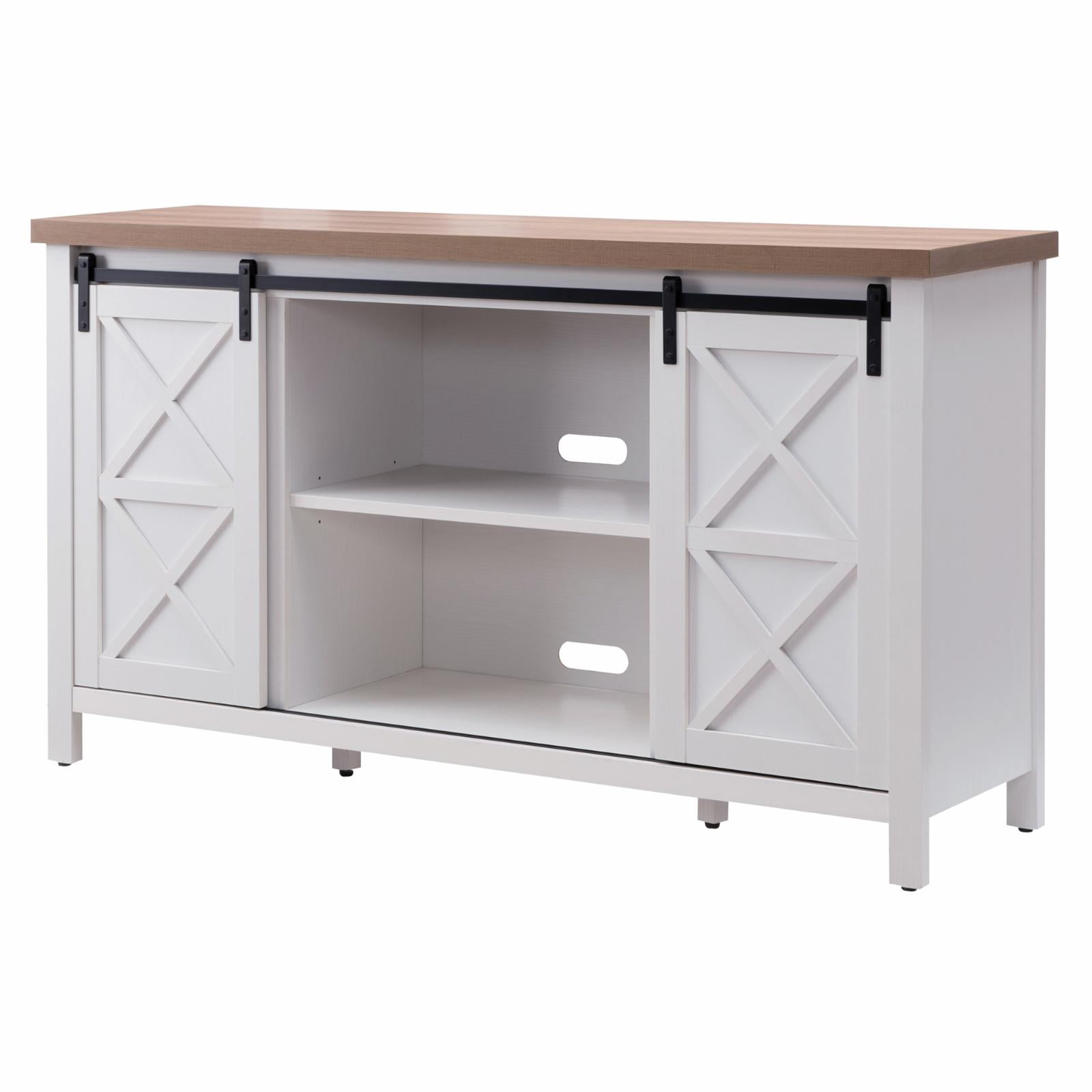 Combine functionality and on-trend design with this sturdy TV stand. Its rich wood tone creates a warm neutral palette that will blend seamlessly into any color scheme, while its functional sliding barn doors add a touch of modern farmhouse whimsy. A must-have for living areas and entertainment spaces, this TV stand sets the stage for the big game, a movie marathon, or that season finale everyone’s been talking about.