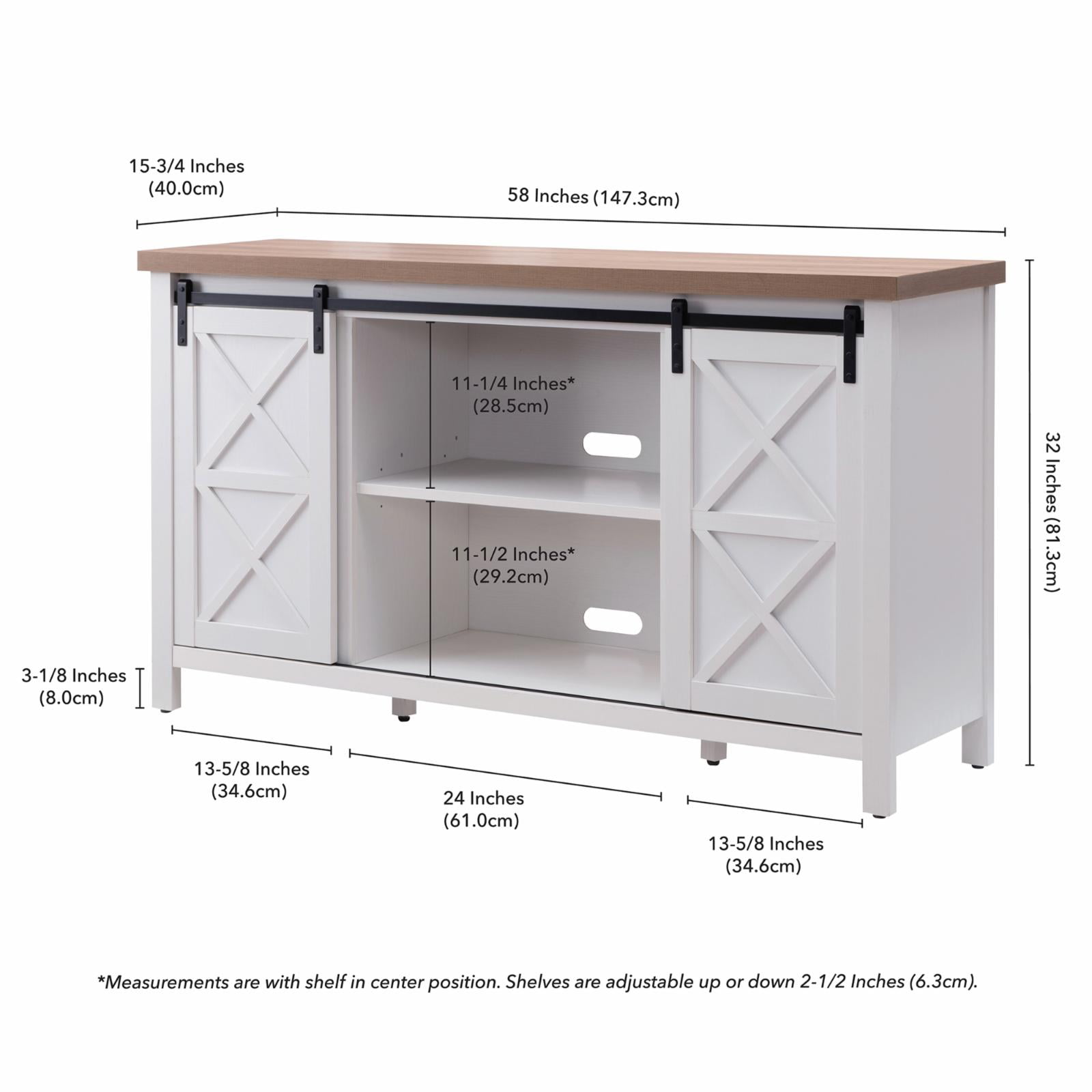 Measures 58W x 15D x 32H in. A modern contemporary design accommodates TVs up to 65 in. for your entertaining space Constructed of sturdy MDF materials in a handcrafted White and Golden Oak finish. Features two doors with enclosed cabinets and 6 shelves for ample storage. The top has a weight capacity of 75lbs. Lower shelves can hold 25lbs. each. Clean with a soft, dry cloth; no harsh chemicals or abrasive cleaning materials. Fe