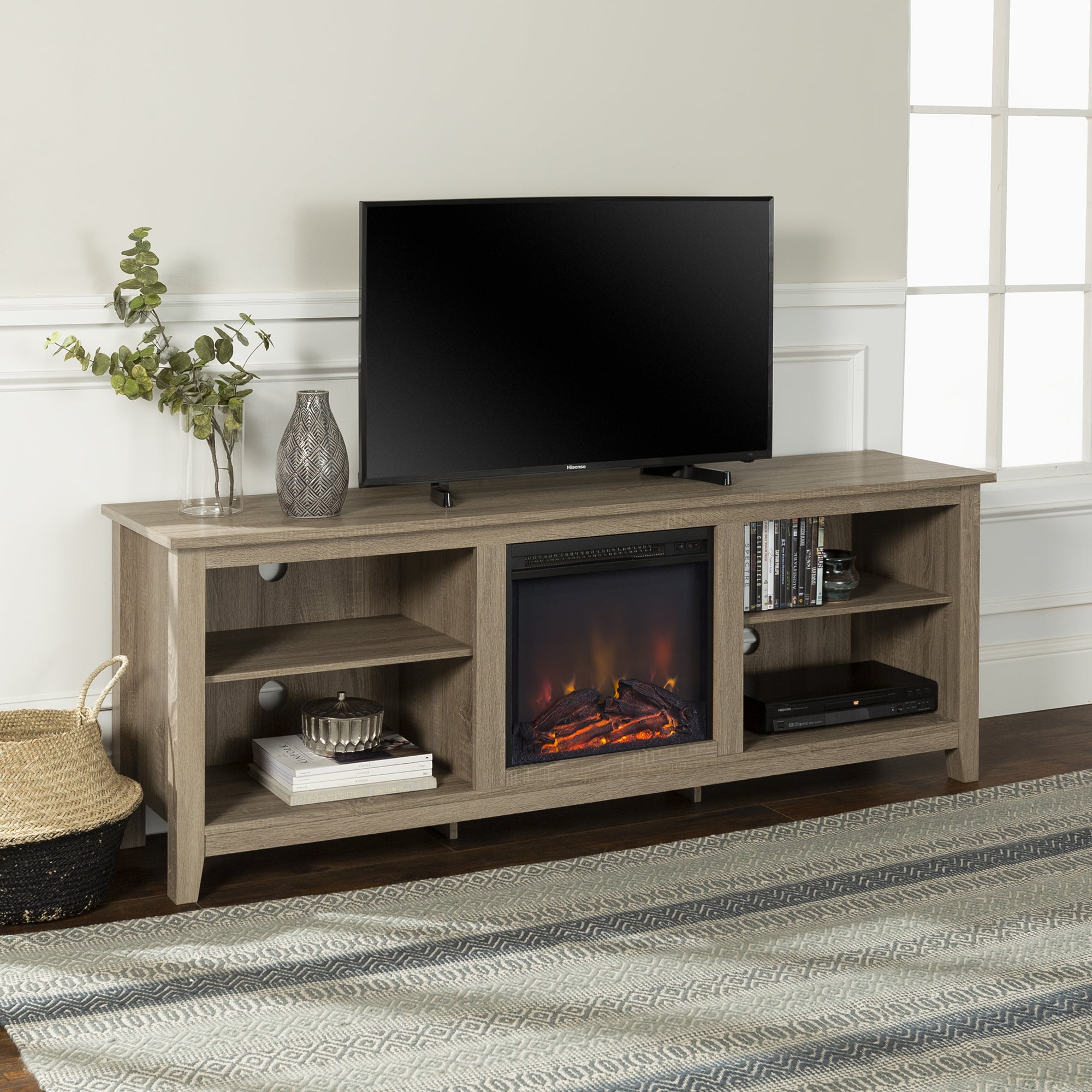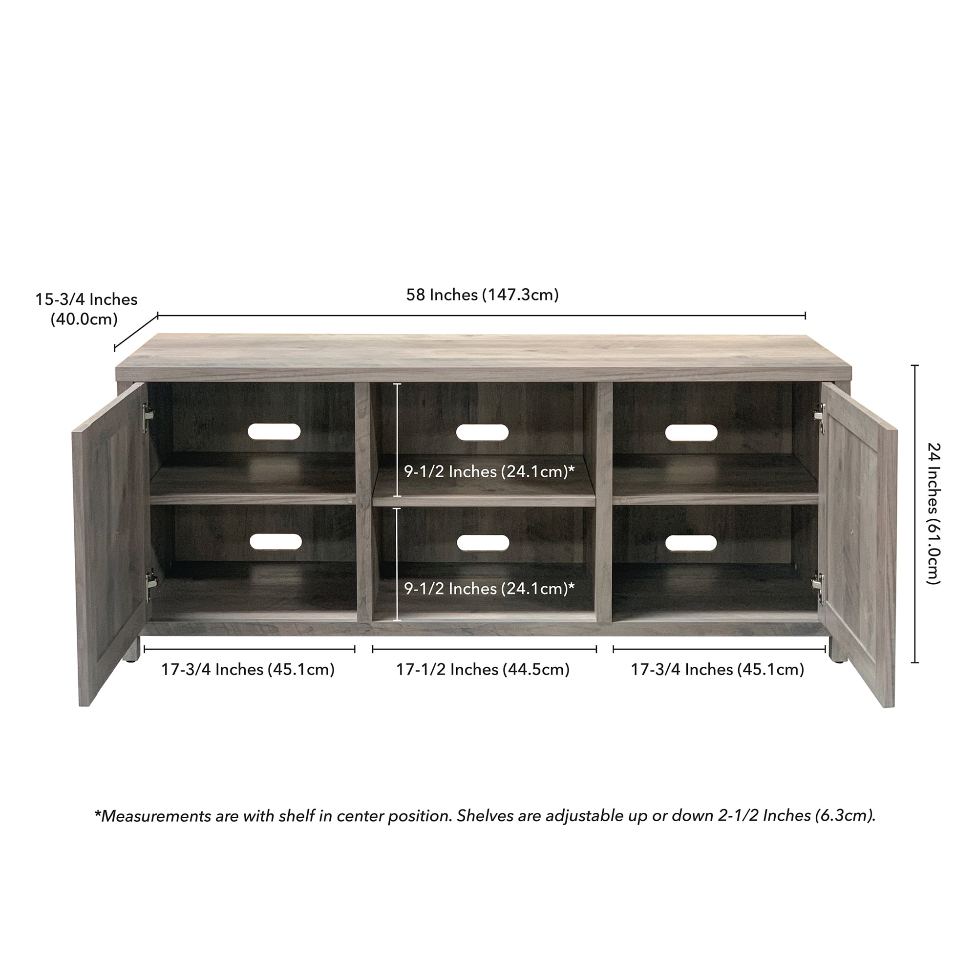 Comes in a variety of warm wood finishes including white oak and grey oak. Table Dimensions: 24″ H x 58″ L x 15.75″ W Accommodates most flat-screen TVs up to 65 inches. Made from premium metal and tempered glass this media console can support up to 75 LBS. Made from premium materials, this TV console table is made from engineered PB wood. Made from high quality construction, and avoiding inexpensive materials results in a heirloom quality piece of furniture for half the price. Two open shelves with doors offer ample space for open and convenient storage, this open-backed tv console stand also features cable management cut-outs to keep all your media wiring neatly organized. It’s perfect for your living room, home office, bedroom, den, parlor or basement and can also be used as a room divider, storage cabinet, TV stand, drawer, or closet. Features versatile design inspired by modern farmhouse designers, it can easily transform into a contemporary table, clean line table, mid-century modern table, modern design table, vintage table, transitional table, modern farmhouse table, farmhouse industrial table, cottage table, coastal table, traditional table, or modern country table Features easy assembly. All tools included with step-by-step instructions provided for full furniture set-up. Finished in gray oak. The top has a weight capacity of 75 lbs. Lower shelves can hold 25 lbs. each. The two lower shelves feature an open center compartment and cabinets on either side. Accommodates most flat-screen TVs up to 58 inches. Made from premium metal and tempered glass this media console can support up to 75 LBS.
