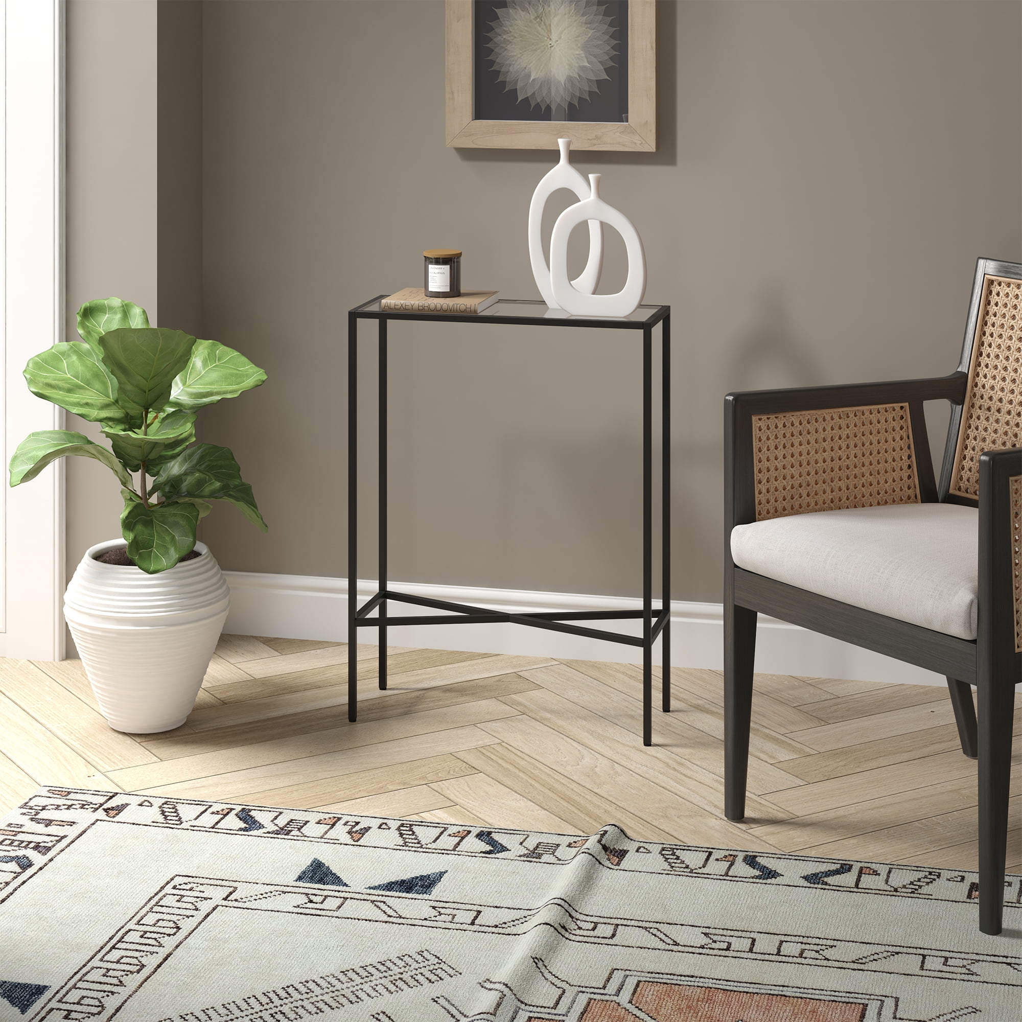 Evelyn&Zoe Henley 22″ Wide Rectangular Console Table with Glass Top, Blackened Bronze